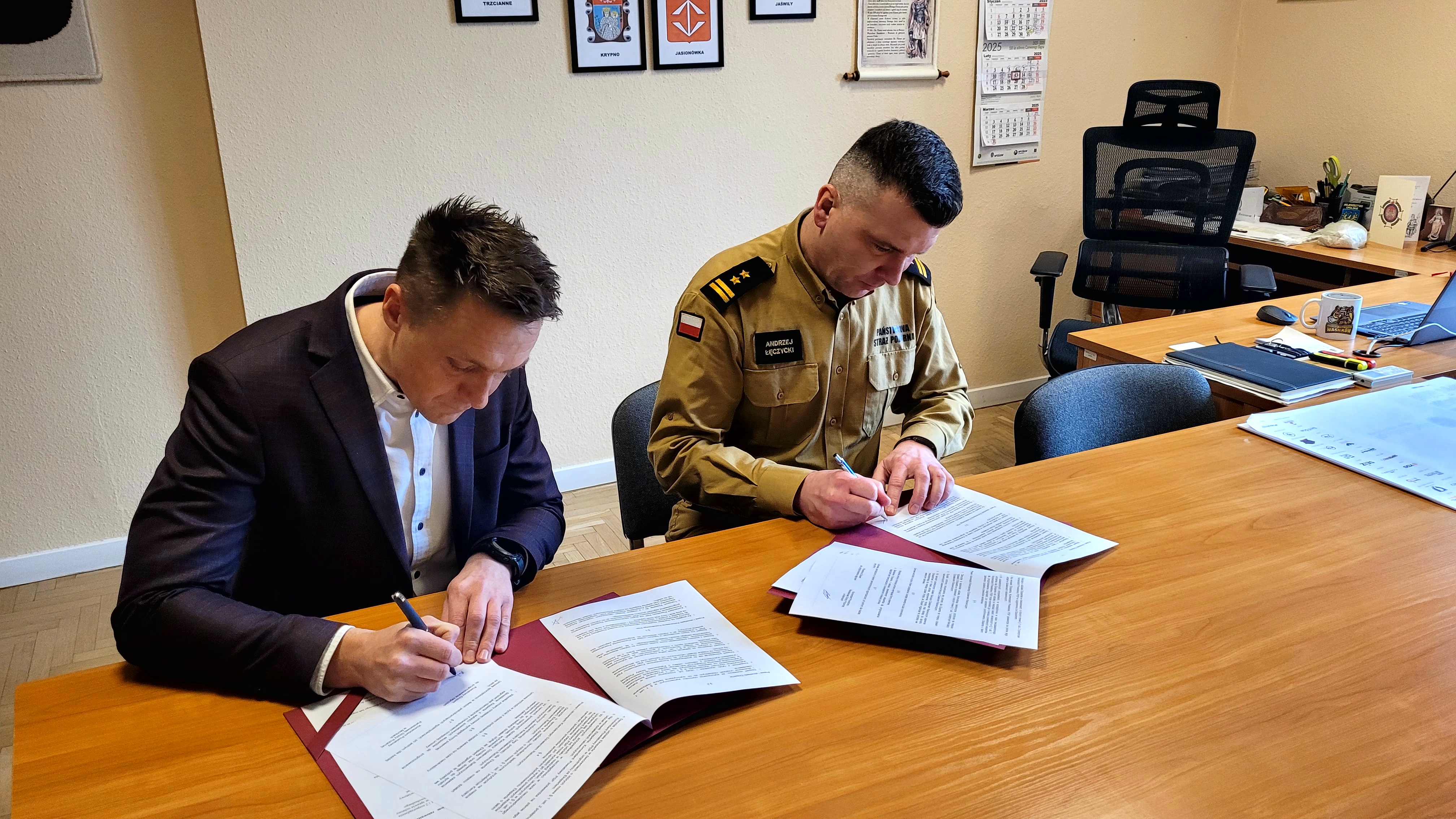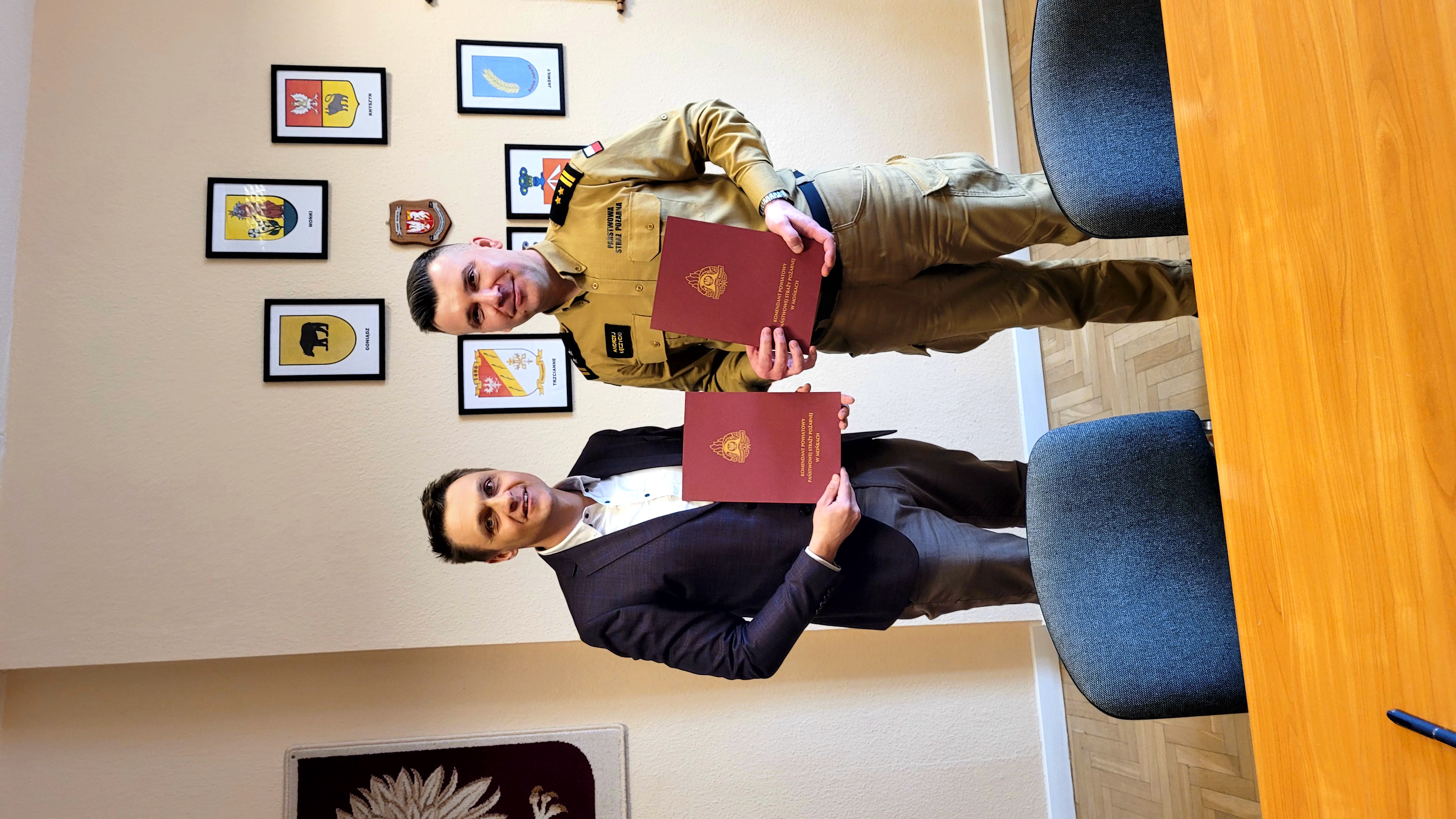 Pan mgr inż. Artur Komorowski podpisał Umowę z Komendantem Powiatowym PSP w Mońkach bryg. Andrzejem Łęczyckim, w sprawie dobrowolnego współdziałania w akcjach ratowniczych i ćwiczeniach na obszarze powiatu monieckiego w charakterze Eksperta ds. prognozowania zagrożeń w dziedzinie inżynierii konstrukcji mostowych.