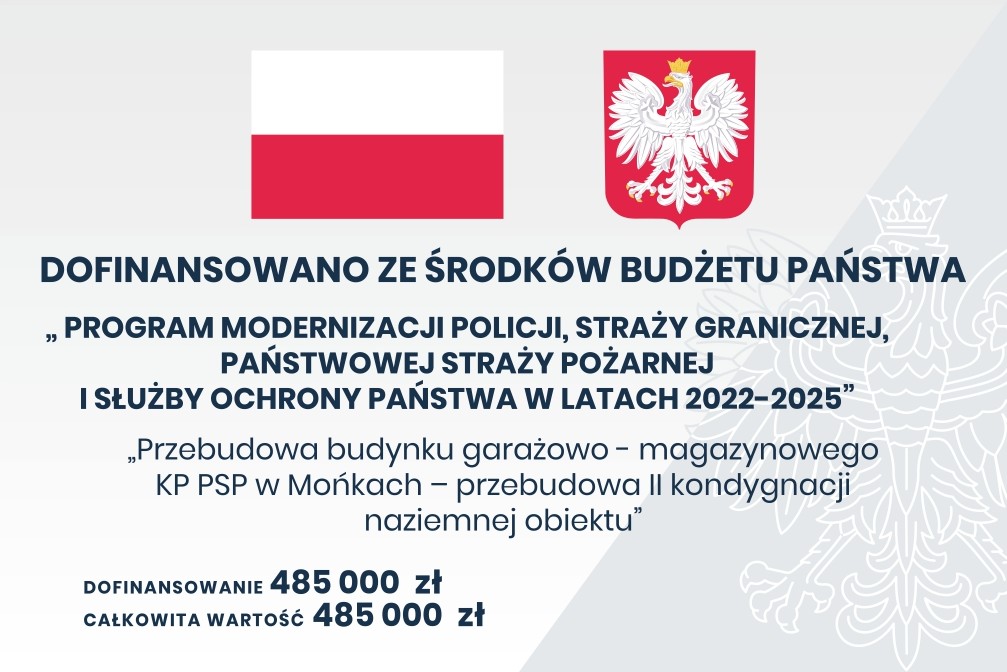 - „Przebudowa budynku garażowo-magazynowego KP PSP w Mońkach”. Czas realizacji 2023-2024, łączna wartość: 3 024 000,00 zł.
