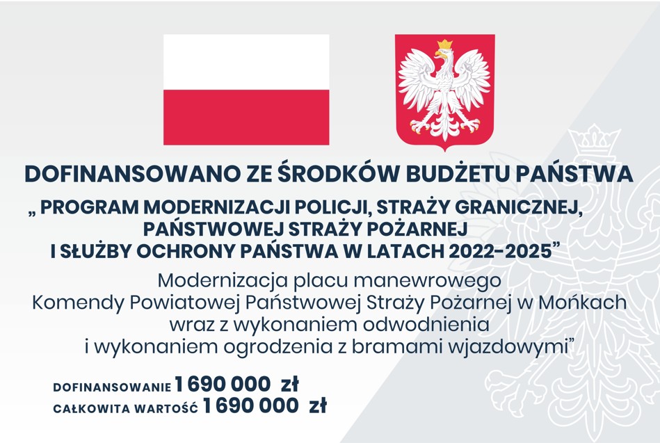 w Mońkach wraz z wykonaniem odwodnienia i wykonaniem ogrodzenia z bramami wjazdowymi”. Okres realizacji 2024-2025, łączna wartość: 1 690 000,00 zł - „Przebudowa budynku garażowo-magazynowego KP PSP w Mońkach – przebudowa II kondygnacji naziemnej obiektu” – Okres realizacji: 2025, łączna wartość 485 000,00 zł