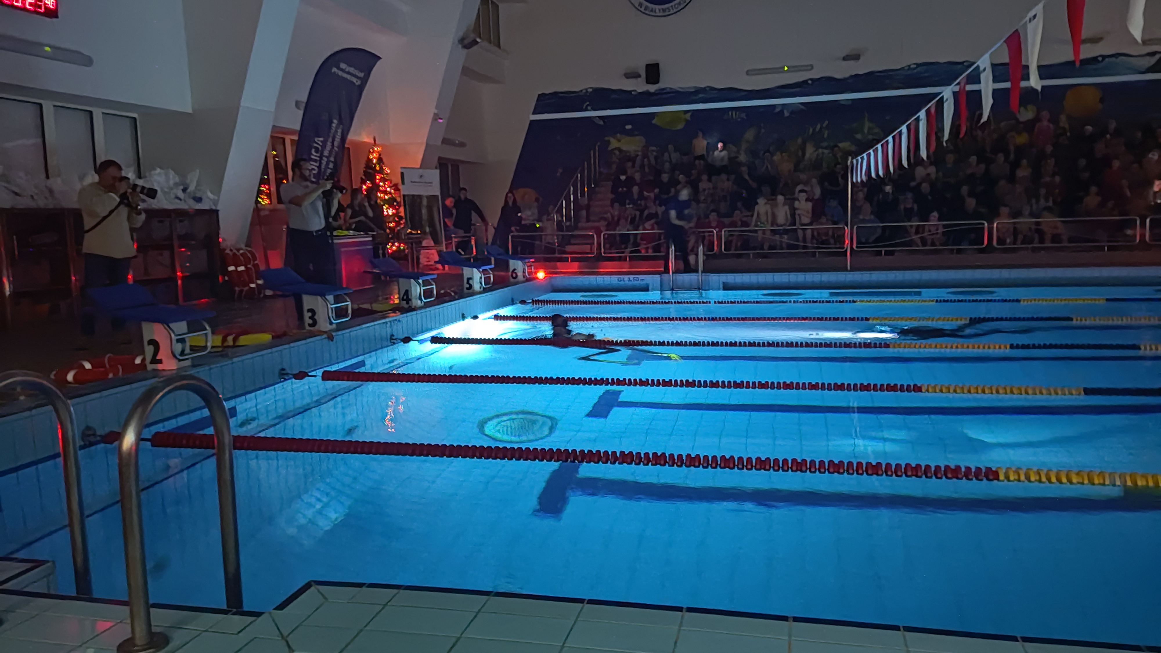 W dniu 06.12.2022 na obiekcie Międzyszkolnego Ośrodka sportu w Białymstoku, pływalnia przy ulicy Mazowieckiej 28 zorganizowane zostały VI Mikołajkowe Zawody Pływackie. Strażacy z KP PSP Mońki nalężący do Specjalistycznej Grupy Ratownictwa Wodno-Nurkowego Biebrza” mieli możliwość zaprezentowania swoich umiejętności podczas działań mających na celu ratowanie osób znajdujących się pod wodą. Zgromadzona publiczność mogła podziwiać umiejętności oraz techniki ratownicze nurków. Stworzone warunki – przyciemnione światło, praca nurków z latarkami dała możliwość podejrzenia pracy ratowników, gdyż w warunkach rzeczywistych, na otwartych akwenach jest to niemożliwe.