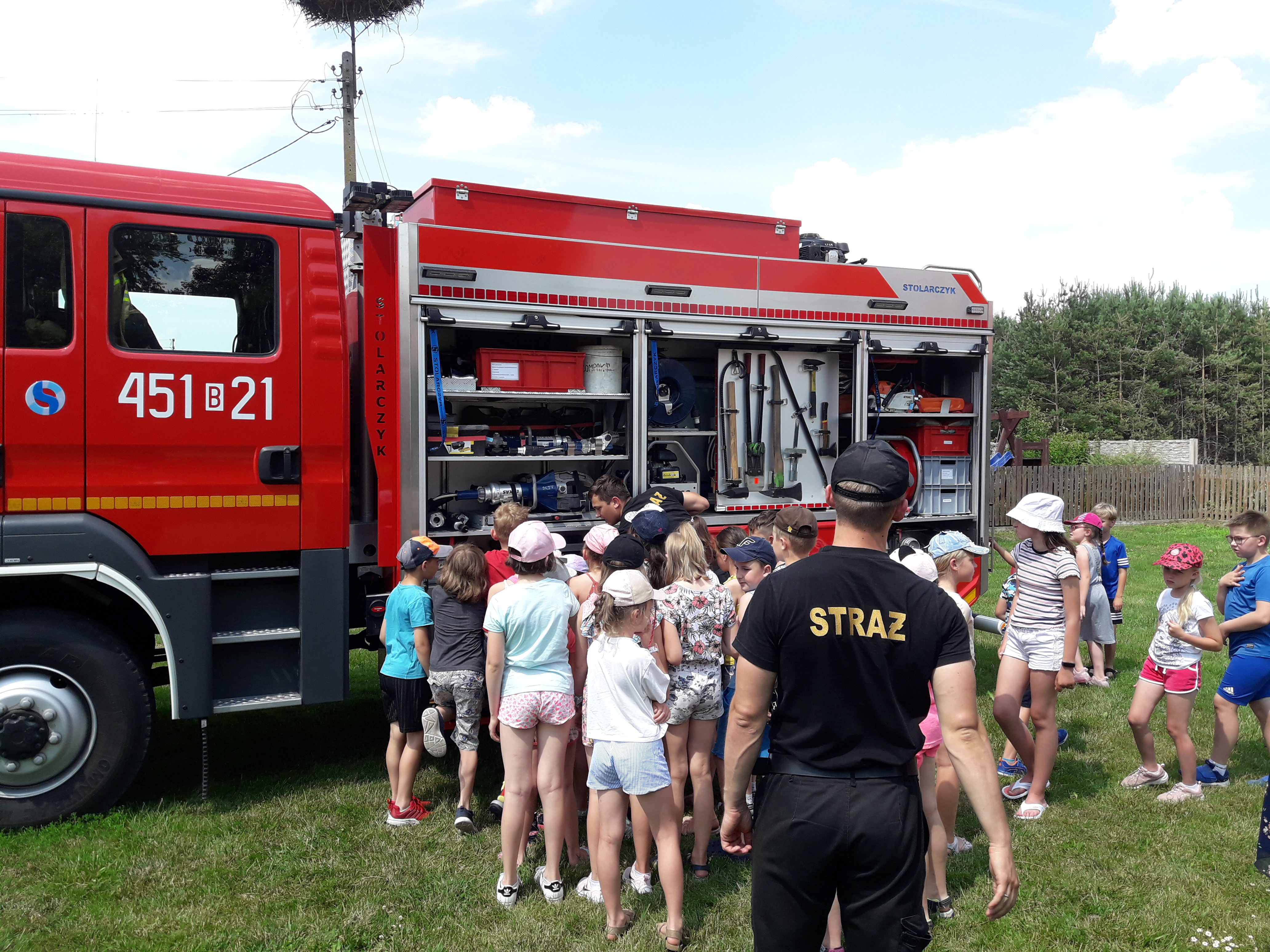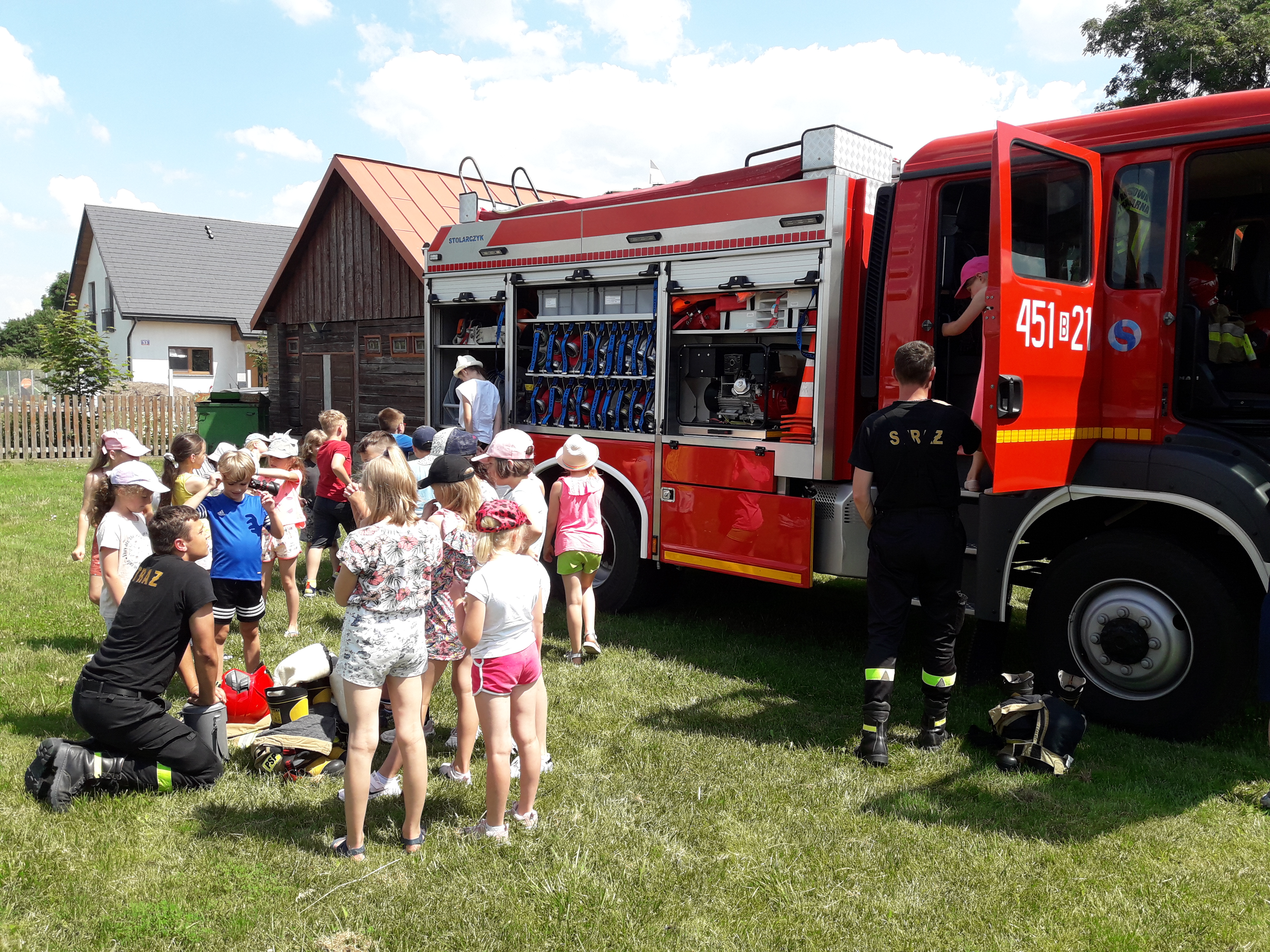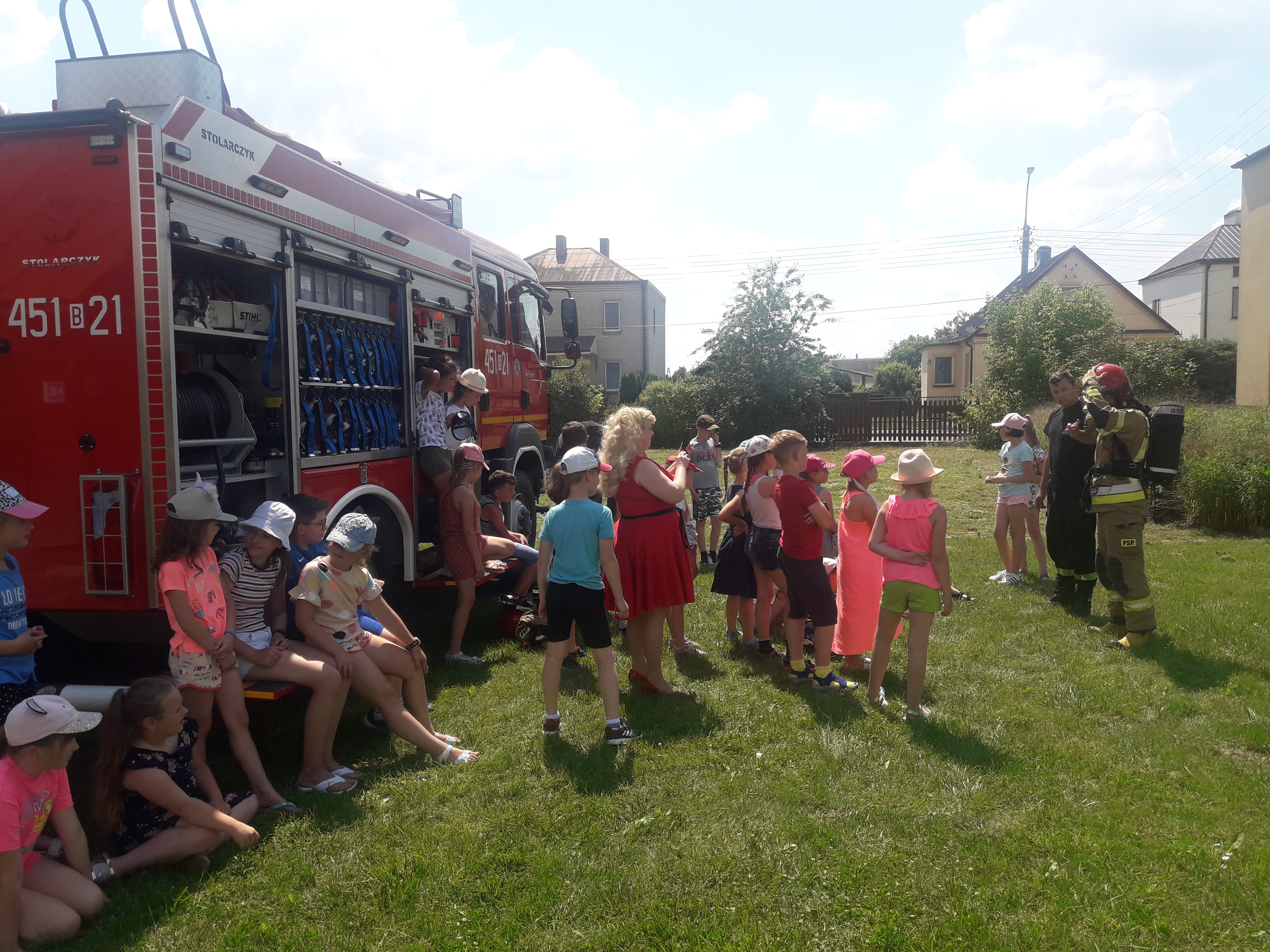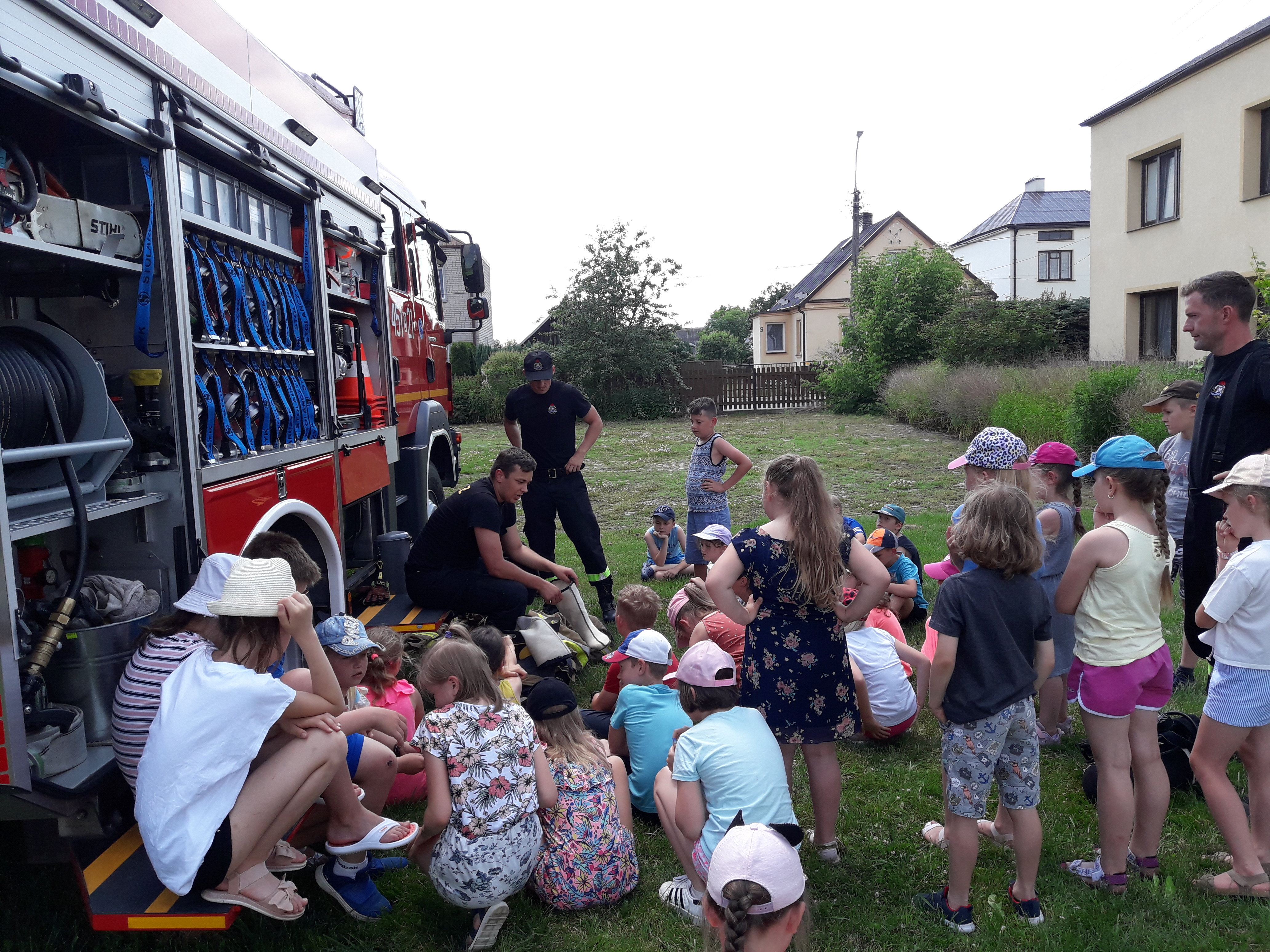 Pierwszego dnia dzieci odwiedzili strażacy z Jednostki Ratowniczo – Gaśniczej w Mońkach celem przeprowadzenia instruktarzu z zasad bezpiecznego zachowania się w czasie wolnym, podczas pobytu nad wodą i reagowania na powstałe zagrożenia. Przedstawiono zasady udzielania kwalifikowanej pierwszej pomocy, a także zaprezentowano sprzęt ratowniczo – gaśniczy wykorzystywany przez strażaków podczas działań. Spotkania z dziećmi i młodzieżą w okresie wakacyjnym mają na celu ugruntowywanie w ludzkiej świadomości odpowiednich postaw i umiejętności reagowania na powstałe zagrożenia.