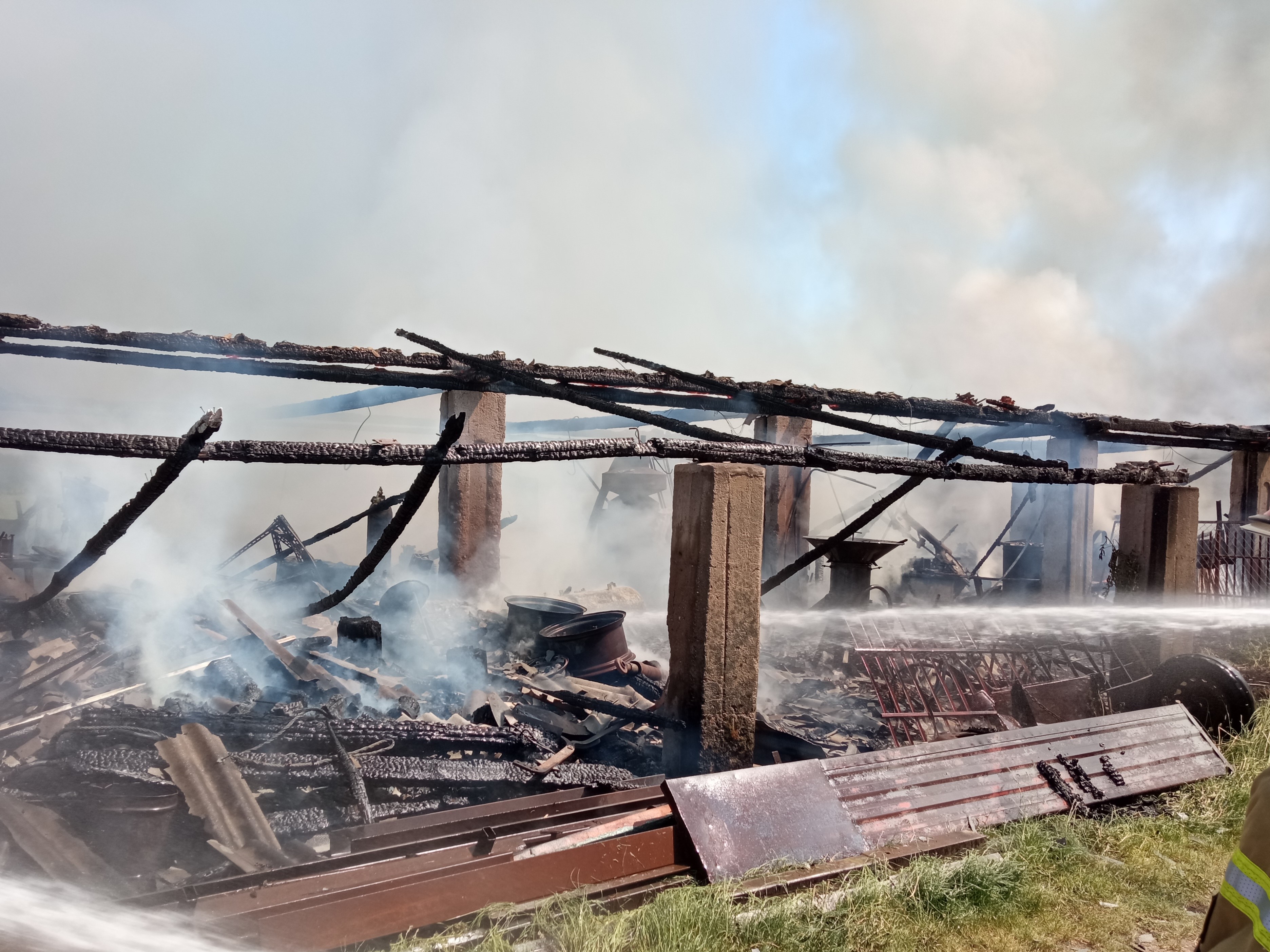 Po dojeździe na miejsce zdarzenia pierwszych zastępów straży pożarnej stwierdzono, że pożarem objęty jest cały budynek. Wewnątrz znajdowały się miedzy innymi samochody osobowe, sprzęt stanowiący wyposażenie warsztatu oraz butle z gazami technicznymi.