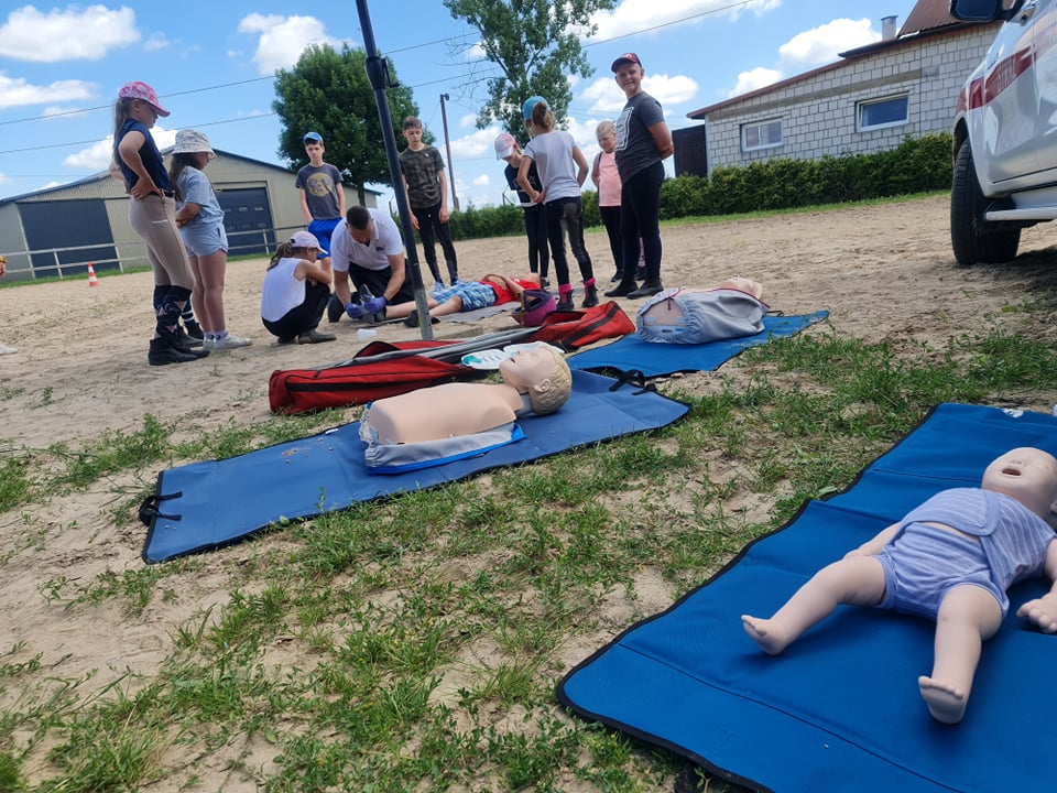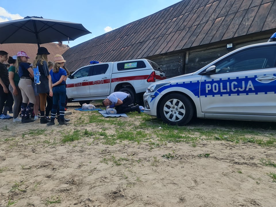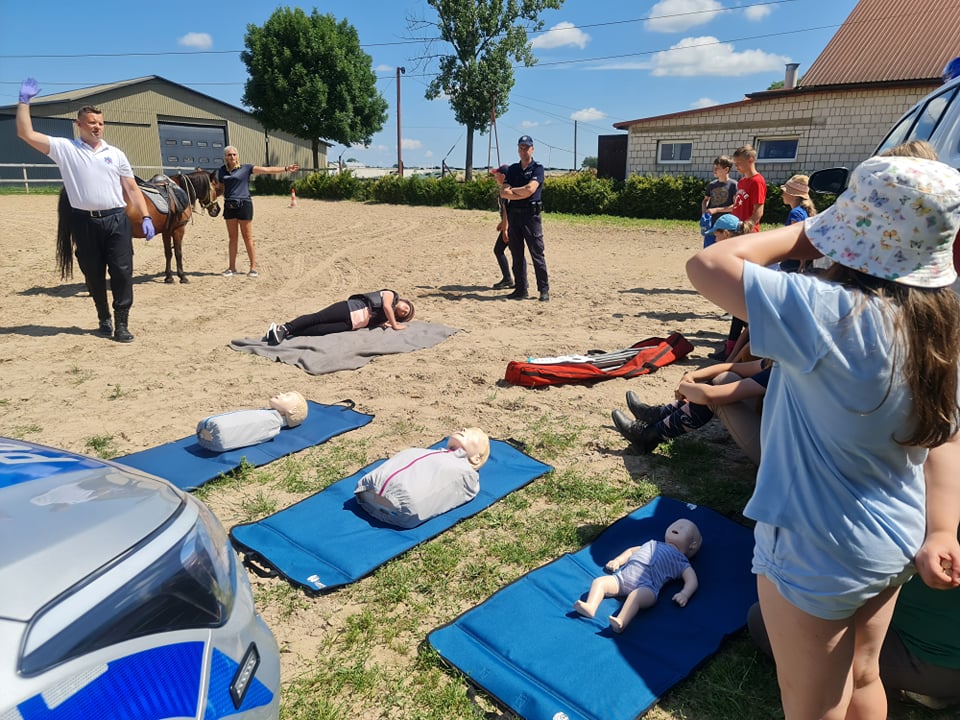 28 czerwca 2021 r. Komenda Powiatowa Policji w Mońkach zorganizowała spotkanie z dziećmi wypoczywającymi na Letnim Obozie Jeździeckim w Smogorówce Goniądzkiej. Do uczestnictwa w przedsięwzięciu została również zaproszona Komenda Powiatowa Państwowej Straży Pożarnej w Mońkach. Policjanci i strażacy rozmawiali z dziećmi na temat bezpiecznego zachowania podczas letniego wypoczynku. Mundurowi mówili jak należy zachować się podczas pobytu nad wodą, w czasie wypraw do lasu, czy podczas spędzania wakacji na wsi oraz jak się zachować w stosunku do osoby obcej. Nie zabrakło również pogadanki z zakresu pierwszej pomocy. Z uwagi na to, iż nauka jazdy konnej może nieść za sobą też i urazy, mundurowi omówili jak należy się zachować, gdy dojdzie do urazu oraz jak należy udzielić pierwszej pomocy przy takich zdarzeniach. Symulując upadek z konia krok po kroku pokazywali, jak trzeba postąpić z osobą poszkodowaną oraz jakiej pomocy jej udzielić. Dzieci dowiedziały się również jak działania należy podjąć aby pomóc osobie nieprzytomnej i z nagłym zatrzymaniem krążenia. Następnie wszyscy mogli przećwiczyć zdobytą wiedzę na fantomach.