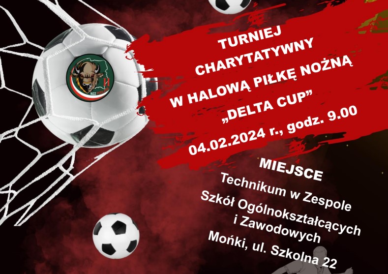 W dniu 04.02.2024 r. Komenda Powiatowa Państwowej Straży Pożanej w Mońkach weźmie udział w turnieju charytatywnym w halową piłkę nożną "DELTA CUP" aby wspomóc akcję "Pomagamy niepełnosprawnym" na rzecz: Ośrodka Rehabilitacyjno-Wychowawczego w Mońkach, Środowiskowego Domu Samopomocy "GAMA" w Mońkach i Domu Pomocy Społecznej w Grajewie.