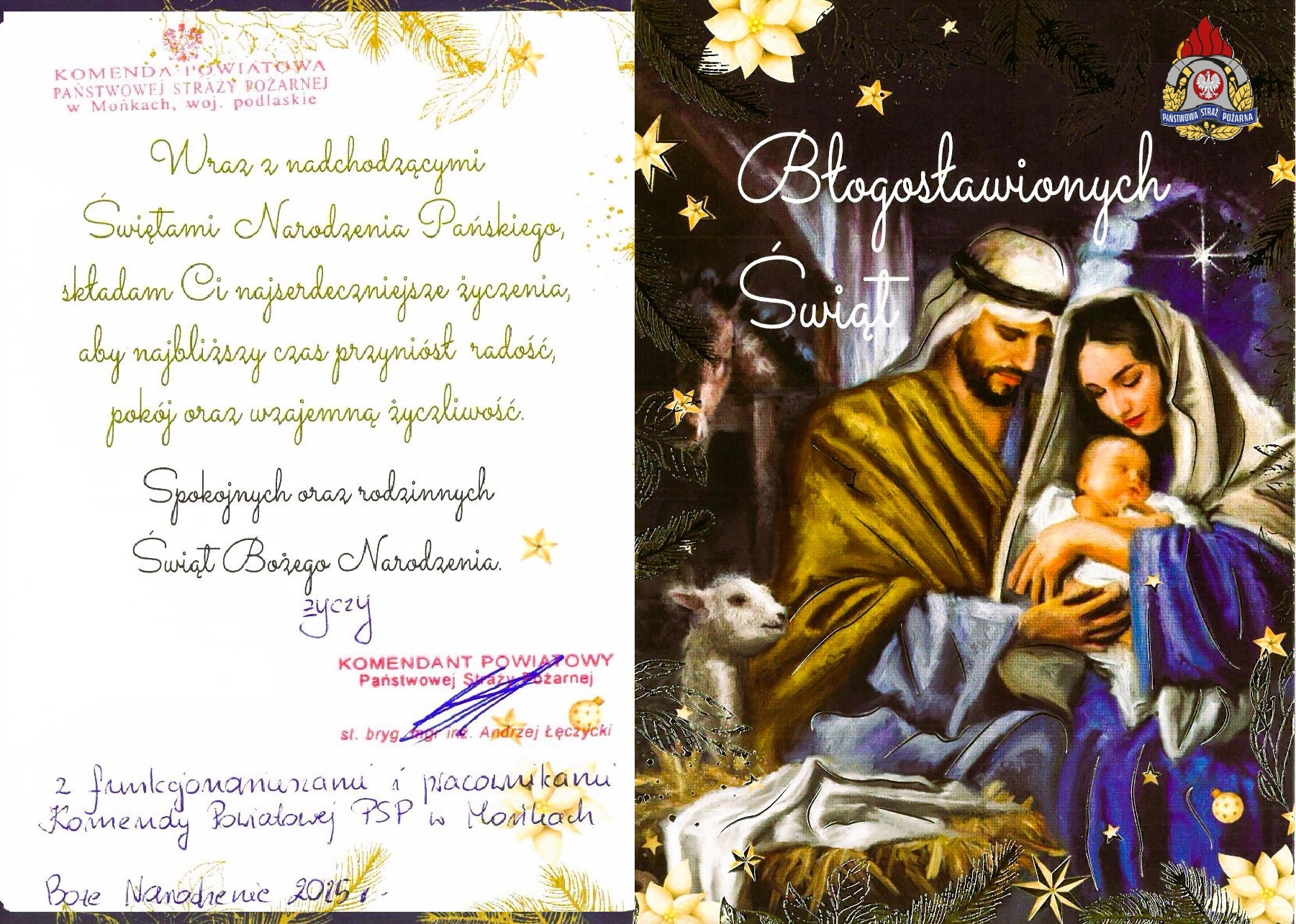 Życzenia Bożonarodzeniowe Komendanta Powiatowego PSP w Mońkach 2025 r. 22.12.2025 Zdjęcia (1) Pokaż zdjęcie 1 z galerii.