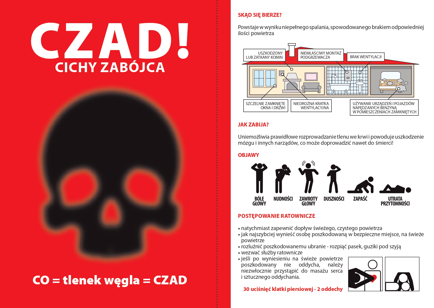 • nie bagatelizować objawów duszności, bólów i zawrotów głowy, nudności, wymiotów, oszołomienia, osłabienia, przyspieszenia czynności serca i oddychania, gdyż mogą być sygnałem, że ulegamy zatruciu czadem; w takiej sytuacji należy