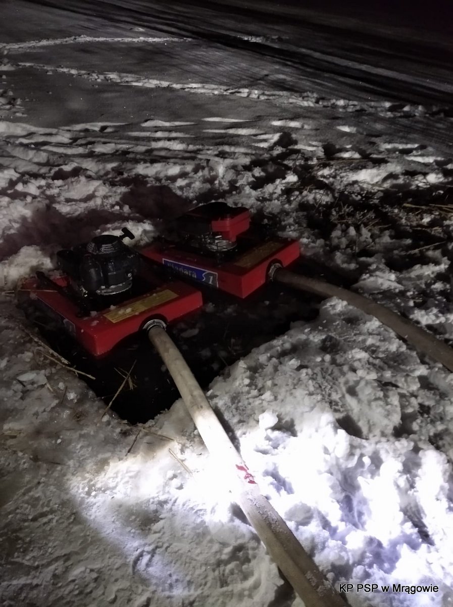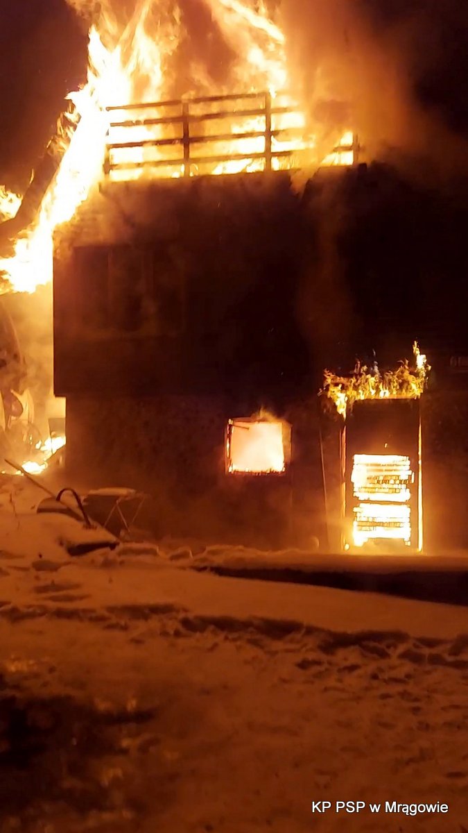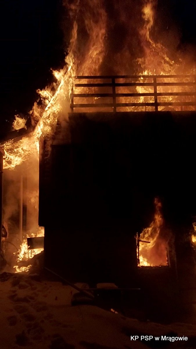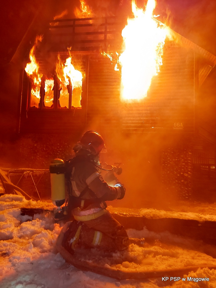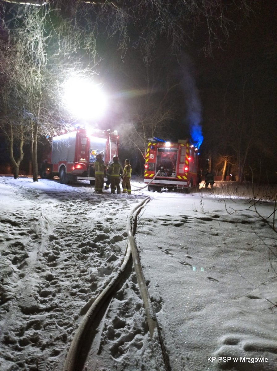 To nie był jednak koniec pracy dla strażaków drugiej zmiany służbowej JRG Mrągowo. Zaraz po przywróceniu gotowości operacyjnej i przygotowaniu sprzętu po wcześniejszych działaniach, o godzinie 22:33 dostali zgłoszenie o pożarze domu letniskowego. Po przybyciu na miejsce zdarzenia stwierdzono, że w miejscowości Borowe gmina Sorkwity doszło do pożaru budynku letniskowego z możliwością zamieszkania całorocznego. Z informacji ze zgłoszenia wynikało, że w ciągu dnia widziani byli tam ludzie. Pożar znajdował się w fazie rozwiniętej i obejmował cały budynek. Zachodziło realne podejrzenie, że wewnątrz budynku mogły znajdować się dwie osoby a okoliczność tą potwierdzał stojący na posesji samochód. Nasze działania polegały na podaniu 3 prądów wody na palący się dom oraz zorganizowaniu zaopatrzenia wodnego z pobliskiego jeziora oddalonego około 300m. Działania utrudnione były ze względu na bardzo niską temperaturę sięgającą -23°C. Przeszukano budynek pod kątem występowania osób poszkodowanych oraz sprawdzono kamerą termowizyjną. Na szczęście okazało się, że właściciele budynku przebywali u swoich dzieci a w ciągu dnia rozpalili w kominku i wyjechali. W działaniach wzięły udział 2 zastępy PSP oraz 3 zastępy OSP (OSP Piecki, OSP Grabowo, OSP Rybno)