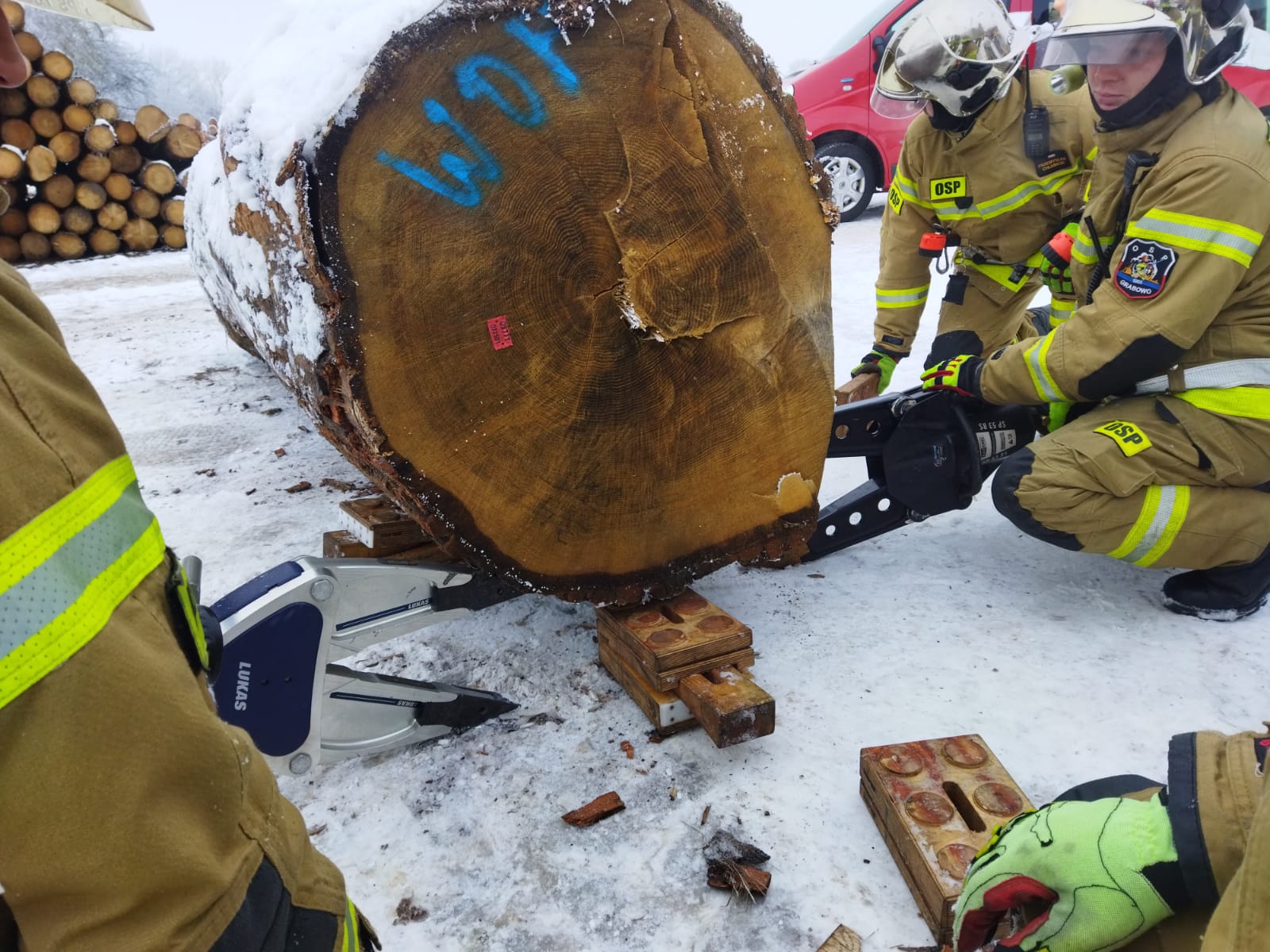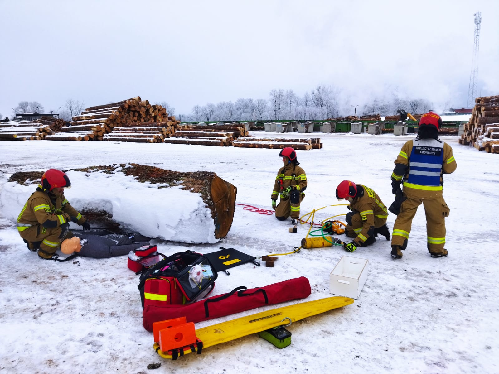 Strażacy ćwiczyli gaszenie pożaru wewnętrznego w kotłowni zakładu oraz ewakuację osoby poszkodowanej ze strefy zadymienia. Uwalniając osobę poszkodowaną spod kłody, ćwiczyli zarówno medyczne działania ratownicze jak i techniki uwalniania osób poszkodowanych. W tym wypadku strażacy przećwiczyli 3 warianty uwalniania poszkodowanego spod kłody przy użyciu ratowniczego zestawu pneumatycznego oraz rozpieraczy hydraulicznych. Podczas trzeciego epizodu gaszenia biomasy, przećwiczone zostało zasysanie wody ze zbiornika ppoż. znajdującego się na terenie zakładu.