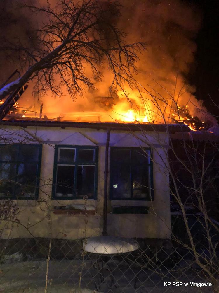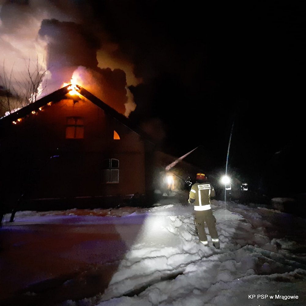 O godzinie 10:45 dnia 09.02.2021 r. na stanowisko kierowania Komendanta Powiatowego PSP w Mrągowie wpłynęła informacja o pożarze poddasza budynku mieszkalnego.