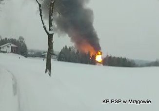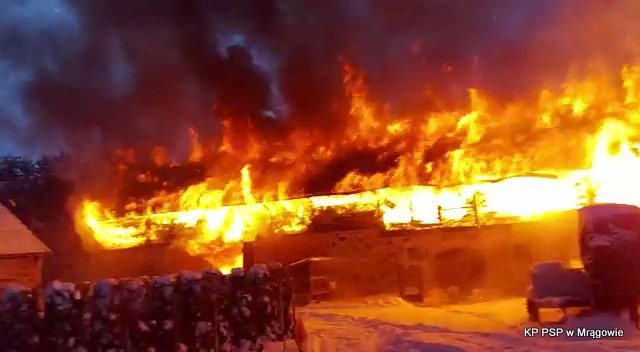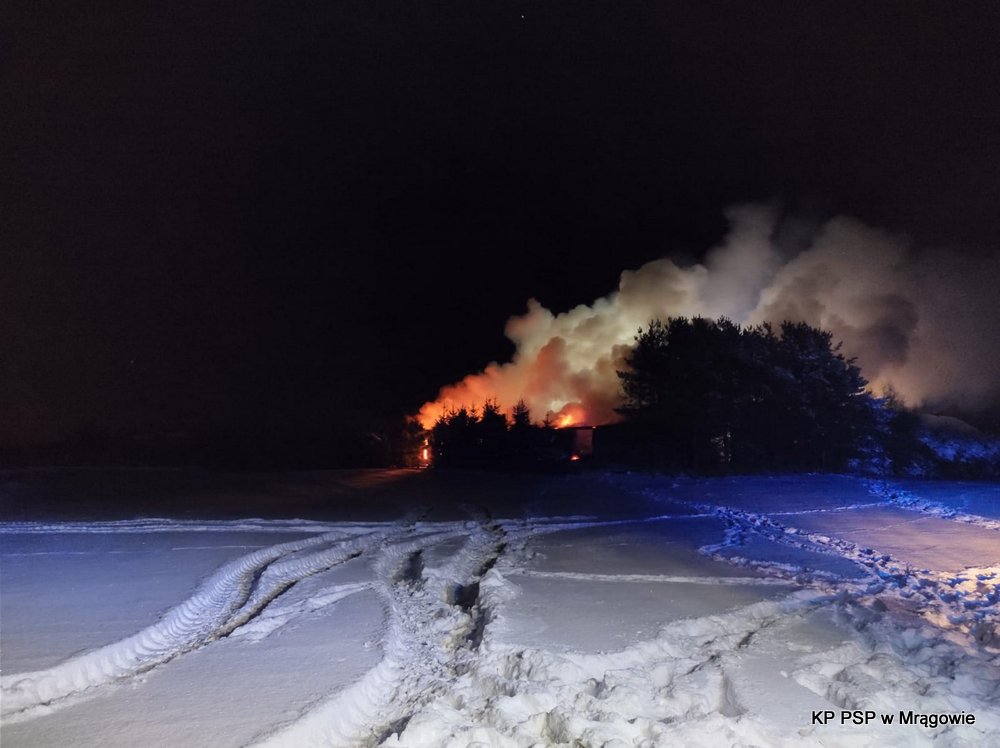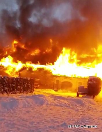 O godzinie 16:29 dnia 10.02.2021 r. na stanowisko kierowania Komendanta Powiatowego PSP w Mrągowie wpłynęła informacja o pożarze dużego budynku gospodarczego.