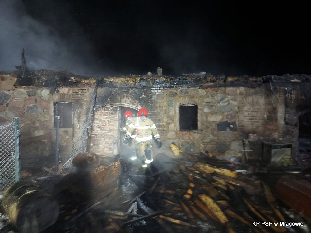 Po przybyciu na miejsce zdarzenia pierwszego zastępu Straży Pożarnej i przeprowadzonym rozpoznaniu przez KDR – Kierującego Działaniami Ratowniczymi stwierdzono, że w miejscowości Karwie doszło do pożaru dwóch połączonych ze sobą budynków gospodarczych. W momencie przybycia na miejsce zdarzenia Straży Pożarnej cały dach połączonych budynków objęty był pożarem i znajdował się w fazie rozwiniętej. W jednym budynku znajdowało się dużo materiałów palnych takich jak kostki słomy czy drewno opałowe, natomiast w drugim znajdował się warsztat samochodowy. W pierwszej fazie działań ratowniczo-gaśniczych skupiono się na podaniu dwóch prądów gaśniczych w obronie na sąsiedni budynek znajdujący się zaledwie 3 metry od ściany szczytowej płonącego budynku. Ze względu na trudne warunki atmosferyczne pobliskie hydranty nie działały więc rozpoczęto budowę linii zaopatrzenia wodnego z pobliskiego jeziora oddalonego o około 500 m. Rozpoczęto działania gaśnicze w natarciu okrążającym palący się budynek. Podano również prąd gaśniczy z roztworem środka pianotwórczego w celu skuteczniejszego gaszenia nagromadzonej słomy. O zdarzeniu poinformowano Wójta Gminy Mrągowo, który przybył na miejsce zdarzenia i zorganizował pomoc sprzętową oraz ciepły posiłek i napoje dla ratowników. W działaniach wzięły udział 2 zastępy PSP oraz 7 zastępów OSP (2 zastępy OSP Piecki, 2 zastępy OSP Grabowo, OSP Wierzbowo, OSP Szestno, OSP Wyszembork)