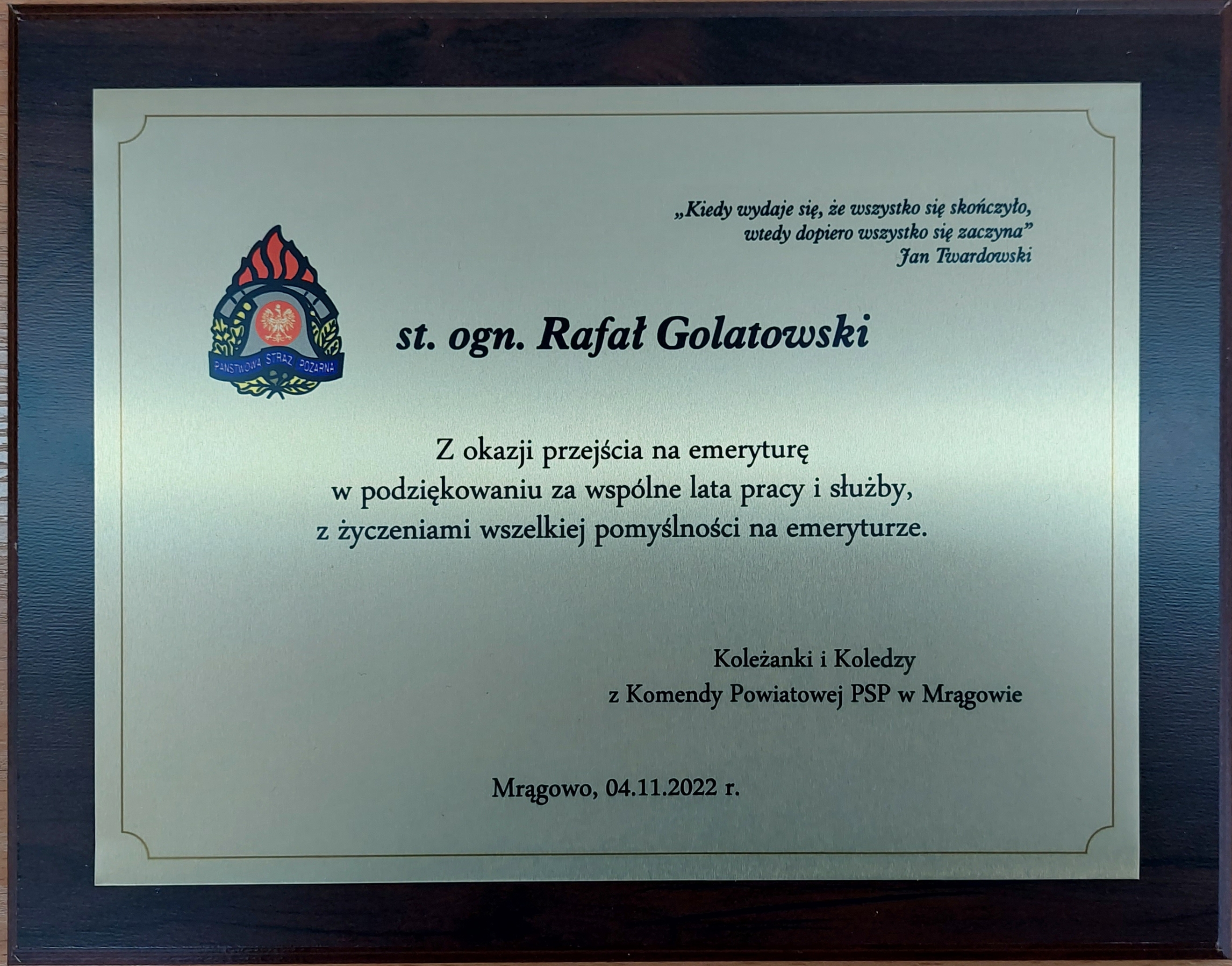 W związku ze złożonym raportem o zwolnienie ze służby oraz Decyzją Komendanta Powiatowego Państwowej Straży Pożarnej starszy ogniomistrz Rafał Golatowski przeszedł na zaopatrzenie emerytalne z dniem 4 listopada 2022 r.