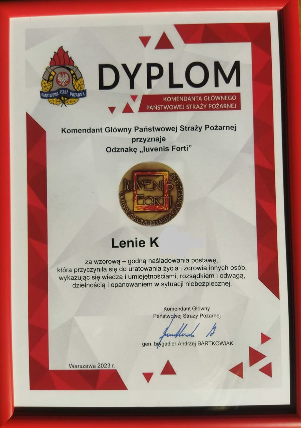 Generał brygadier Andrzej Bartkowiak Komendant Główny PSP przyznał mieszkance powiatu mrągowskiego, 5 letniej Lenie, Odznakę „Iuvenis Forti”, która została uroczyście wręczona dnia dzisiejszego przez mł. brygadiera Józefa Adama Banacha Komendanta Powiatowego PSP w Mrągowie.
