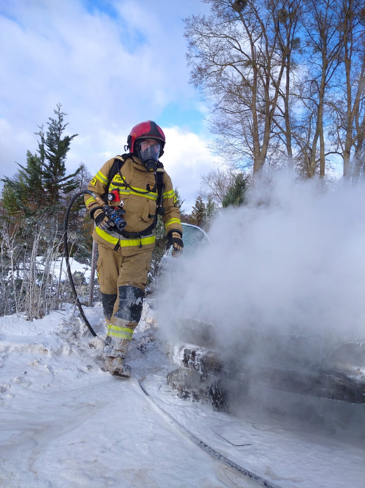 Po przybyciu na miejsce zdarzenia i przeprowadzeniu rozpoznania stwierdzono, że na DK 59 w miejscowości Gwiazdowo na przydrożnym parkingu pali się samochód osobowy. Kierowca twierdził, że samochód zapalił się podczas jazdy i zjechał na parking. Na szczęście udało mu się bezpiecznie opuścić pojazd i nie potrzebował pomocy medycznej. Strażakom udało się szybko ugasić pożar przy użyciu piany, która w tego typu pożarach sprawdza się najlepiej.