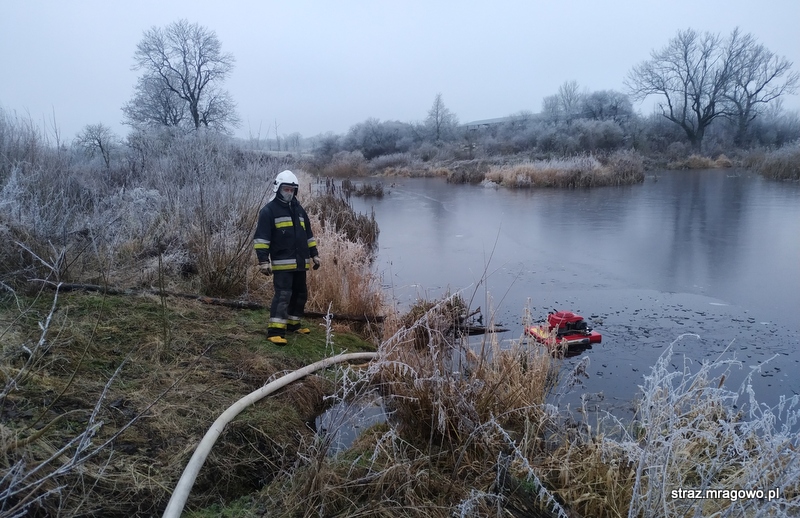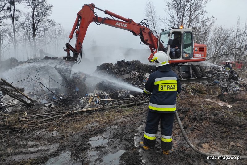 Dnia 01.01.2021 r. w celu zwiększenia skuteczności działań gaśniczych podano dwa prądy gaśnicze piany ciężkiej na powierzchnię pożaru. Ze względu na duże zapotrzebowanie w środek gaśniczy w postaci wody rozbudowano system zaopatrzenia wodnego o przetłaczanie z dwóch punktów czerpania wody z pobliskich naturalnych zbiorników wodnych oddalonych o około 400 m od miejsca pożaru. Na polecenie KDR-a Dyżurny SKKP PSP w Mrągowie podjął próbę organizacji ciężkiego sprzętu w postaci koparki na gąsienicach w celu rozebrania zawalonej konstrukcji budynku i dotarcia do ukrytych ognisk pożaru z jednoczesnym dogaszaniem palących się śmieci. Ze względu na zbyt duże zadymienie zagrażające zdrowiu operatora oraz systemom filtracyjnym sprzętu, w danym dniu nikt nie podjął się udzielenia pomocy. Zorganizowano zaopatrzenie kwatermistrzowskie zaopatrując ratowników w jedzenie, wodę oraz ciepłe napoje. Dokonywano sukcesywnej wymiany ratowników JRG i OSP z powiatu mrągowskiego, która nie pozwoliła na nadmierne obciążenie fizyczne ratowników jak i ciągłe podawanie prądów gaśniczych.
