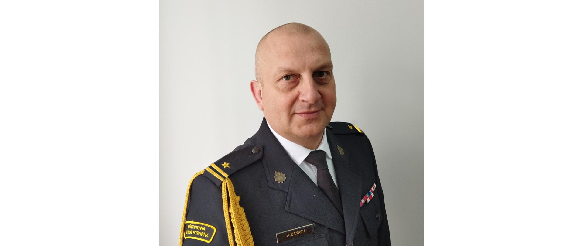 Józef Adam Banach urodził się w 1977 r. w Kolnie. Związany jest z ochroną przeciwpożarową od 2004 r. Doświadczenie zdobywane na stanowiskach ratowniczych powodowało systematyczny awans w hierarchii służbowej. W 2012 r. ukończył Szkołę Aspirantów PSP w Krakowie a następnie skierowany został na studia podyplomowe w SGSP dla strażaków, ubiegających się o zajmowanie stanowisk oficerskich związanych z kierowaniem działaniami ratowniczymi, które ukończył w 2016 r. Na Kierownika Sekcji Kwatermistrzowsko-Technicznej w Komendzie Powiatowej PSP w Kolnie został mianowany w 2015 r.