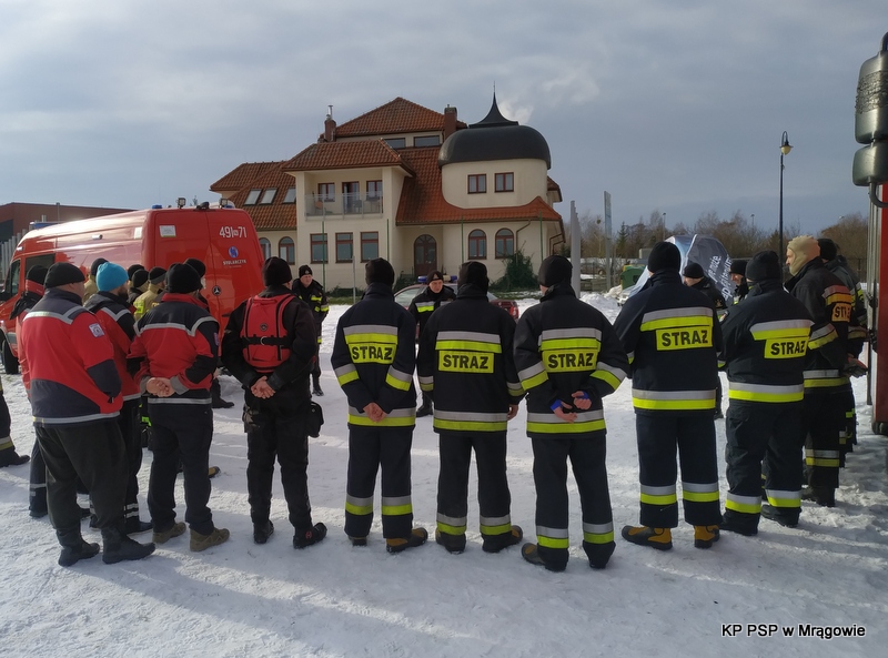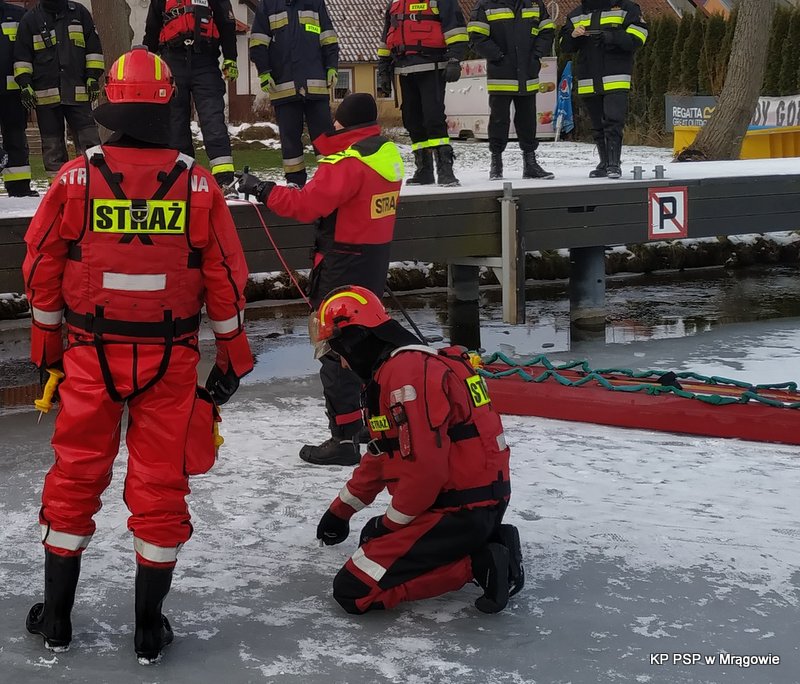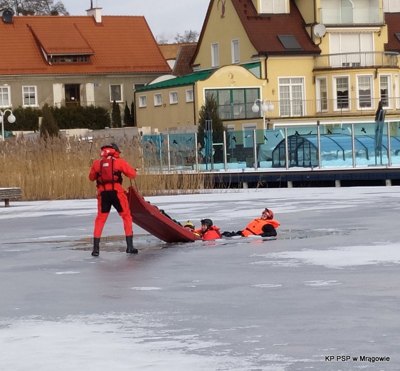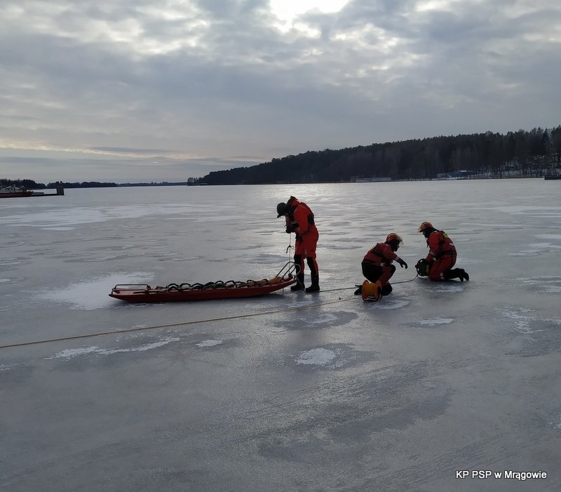 Strażacy Komendy Powiatowej PSP w Mrągowie wraz z MOPR Mikołajki, OSP KSRG Mikołajki oraz OSP Woźnice skutecznie wykorzystali panujące w ostatnich dniach warunki niskich temperatur i przećwiczyli działania z zakresu ratownictwa lodowego w celu poszerzania swoich umiejętności zawodowych min. zabezpieczanie terenu, na którym prowadzone są działania ratownicze, ewakuacji poszkodowanego, udzielenie kwalifikowanej pomocy przedmedycznej z uwzględnieniem wszelakich procedur postepowania przy wychłodzeniu i hipotermii, stosowanie wszelkich technik samoratownia z użyciem odpowiedniego sprzętu ratowniczego. Swoje umiejętności zawodowe udoskonalali także nurkowie SGRW-N Mrągowo, którzy przećwiczyli poszukiwanie osoby zaginionej pod taflą zamarzniętego akwenu.