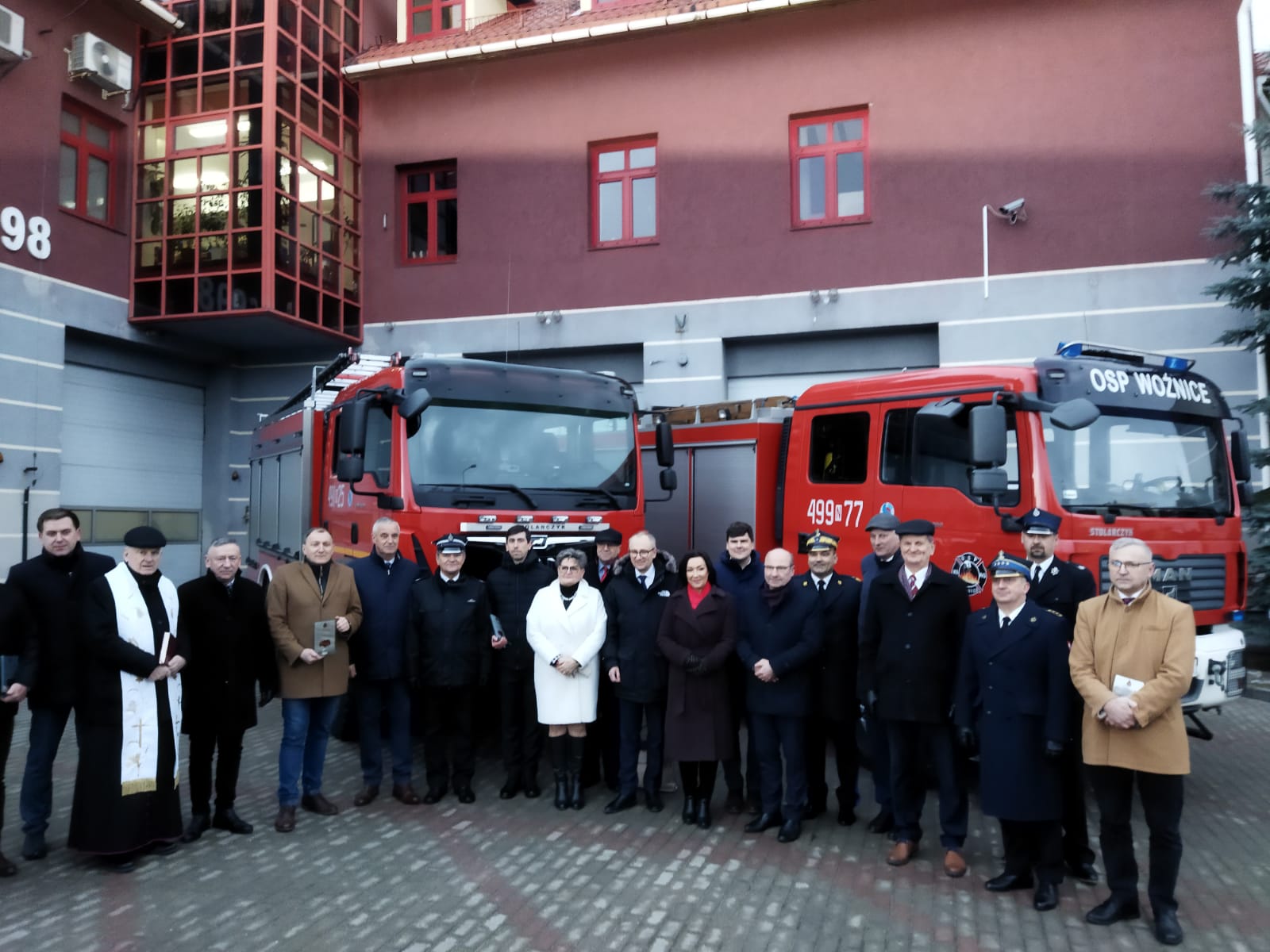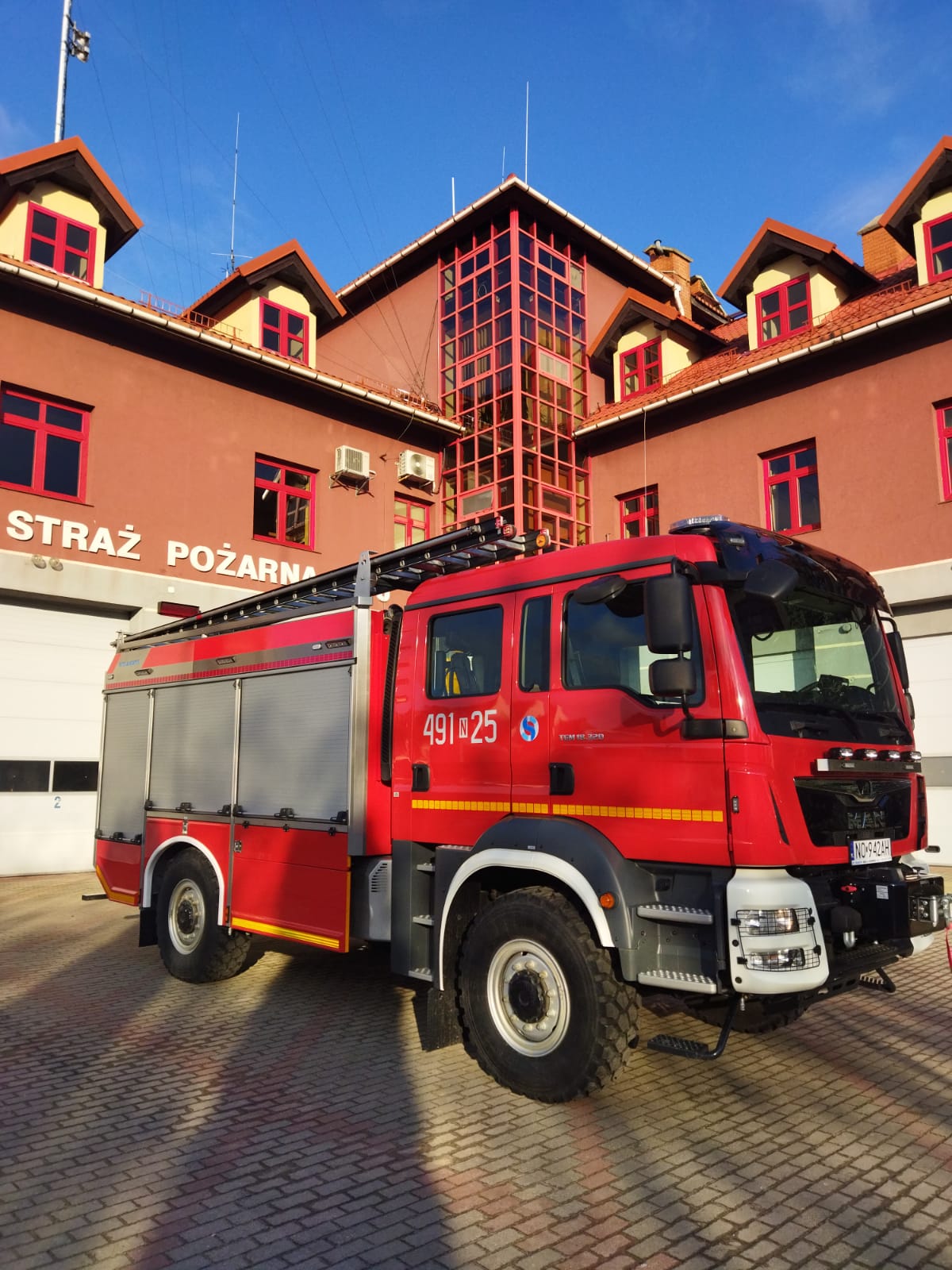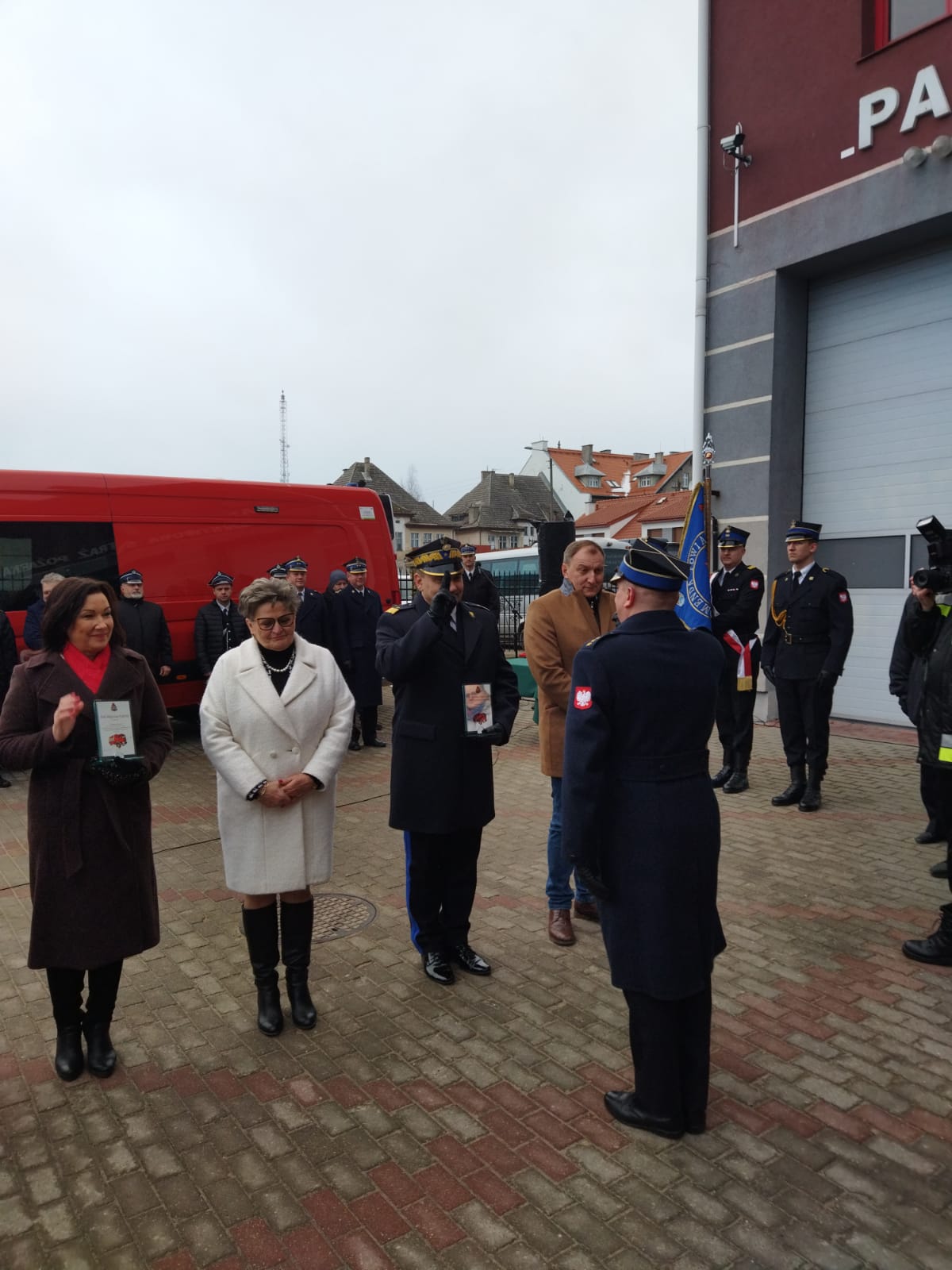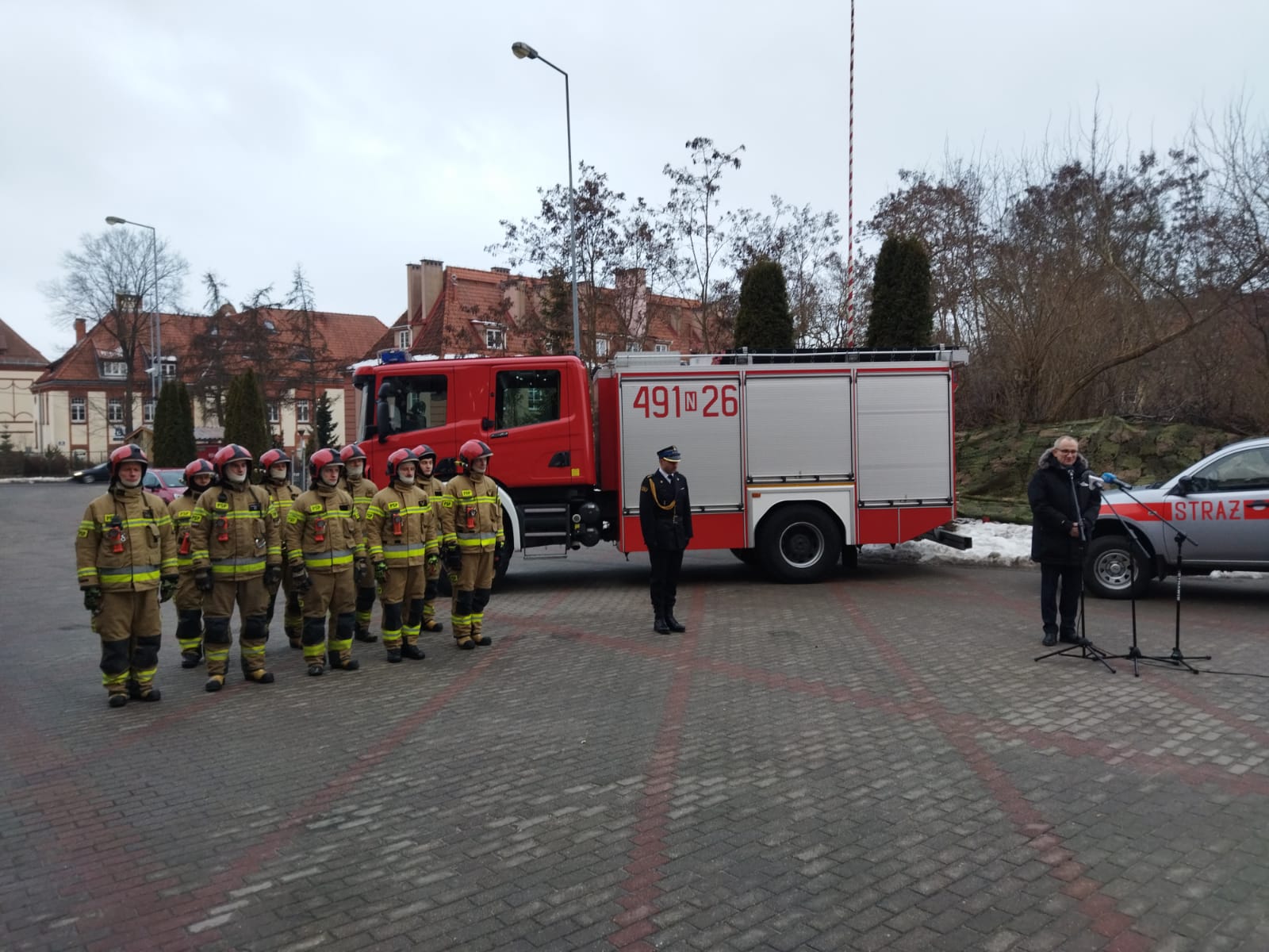 Dnia 10.02.2023 roku na placu wewnętrznym Komendy Powiatowej PSP w Mrągowie odbył się uroczysty apel z okazji przekazania ciężkiego samochodu ratowniczo-gaśniczego dla KP PSP w Mrągowie oraz dla OSP Woźnice.