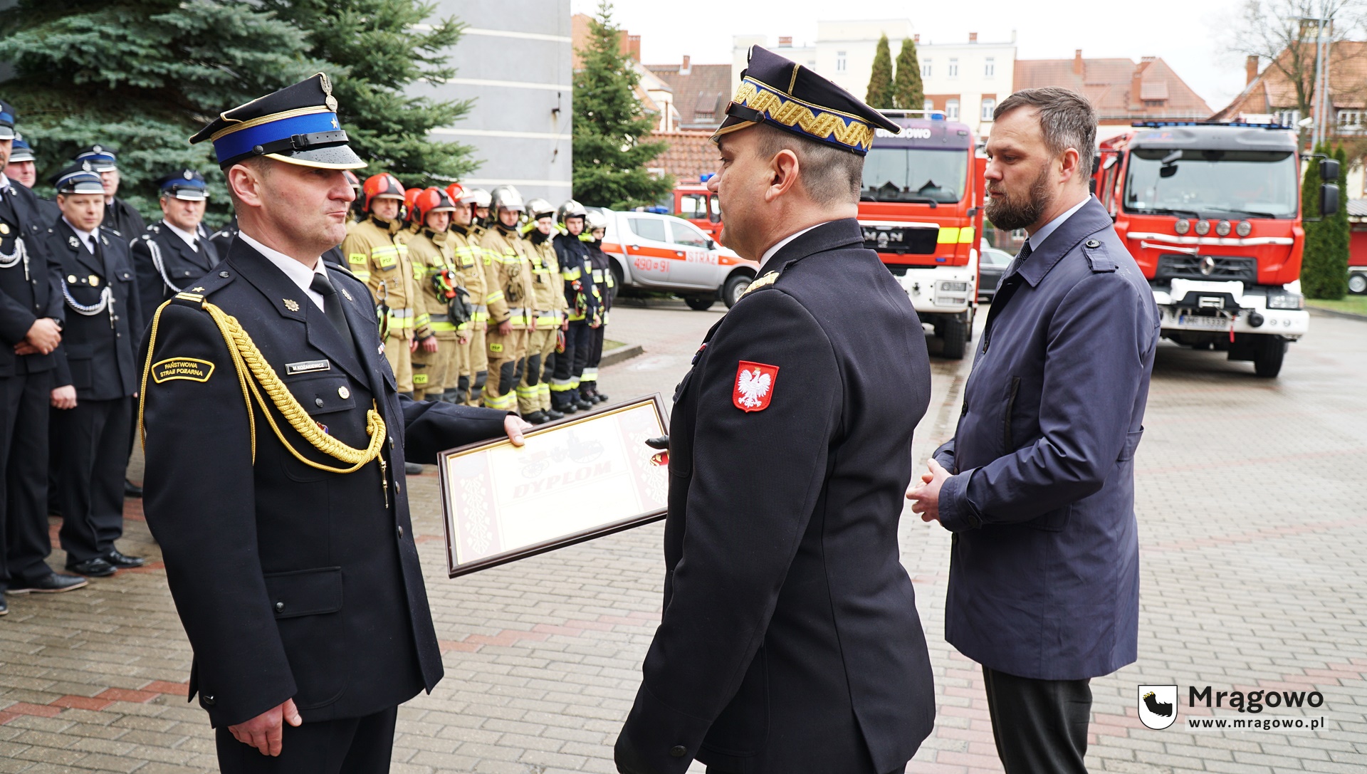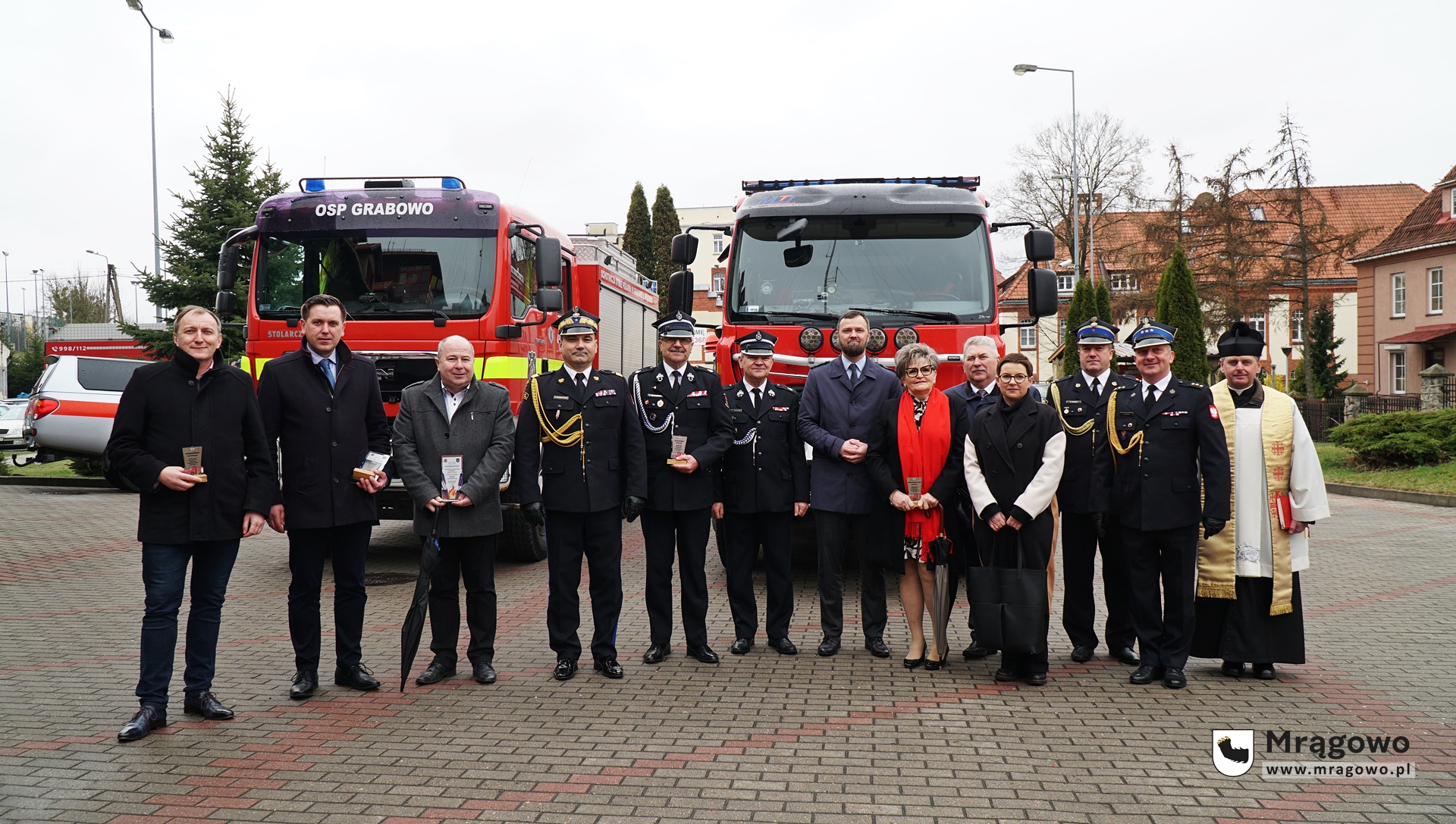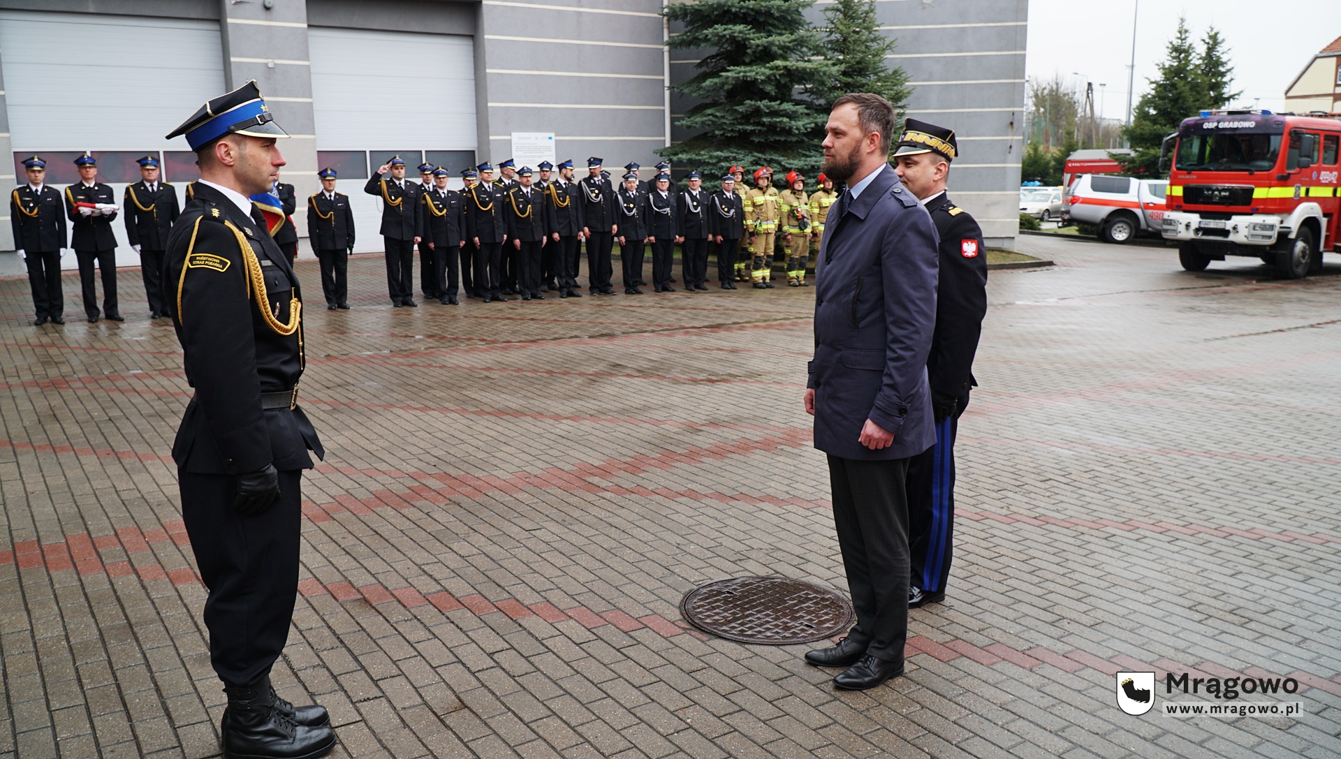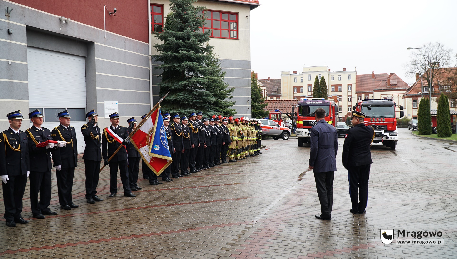Dnia 20.04.2022 r. odbył się uroczysty apel z okazji wręczenia wyróżnienia mł. bryg. Mariuszowi Kozakiewiczowi z Komendy Powiatowej PSP w Mrągowie, włączenia jednostek Ochotniczej Straży Pożarnej w Woźnicach i Ochotniczej Straży Pożarnej w Wyszemborku do Krajowego Systemu Ratowniczo-Gaśniczego oraz przekazania samochodu ratowniczo-gaśniczego dla Komendy Powiatowej Państwowej straży Pożarnej w Mrągowie oraz dla Ochotniczej Straży Pożarnej w Grabowie.