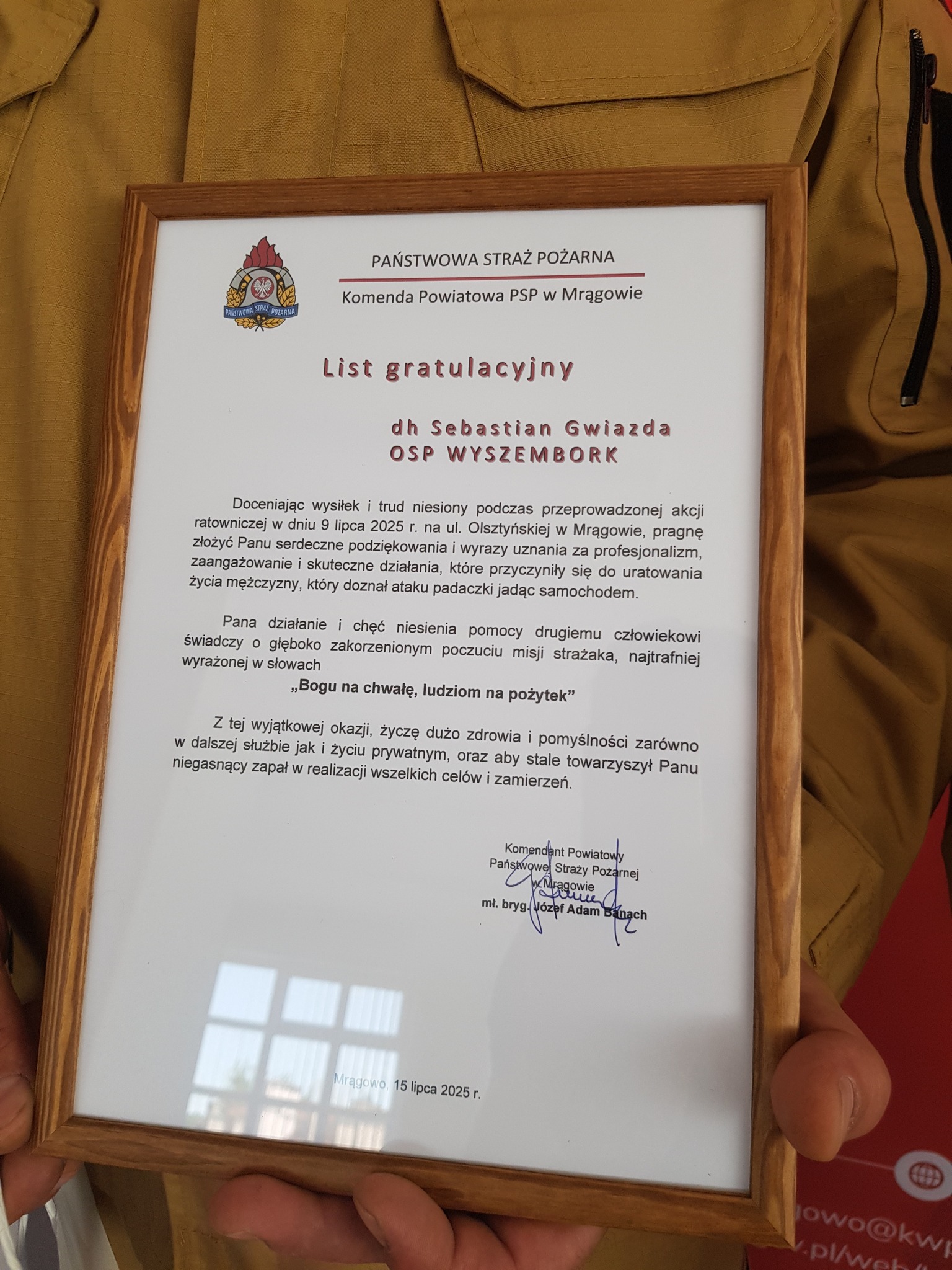 Podziękowanie Komendanta Powiatowego PSP w Mrągowie druhom OSP KSRG Wyszembork którzy w czasie wolnym udzielali pomocy mężczyźnie, który dostał ataku padaczki.