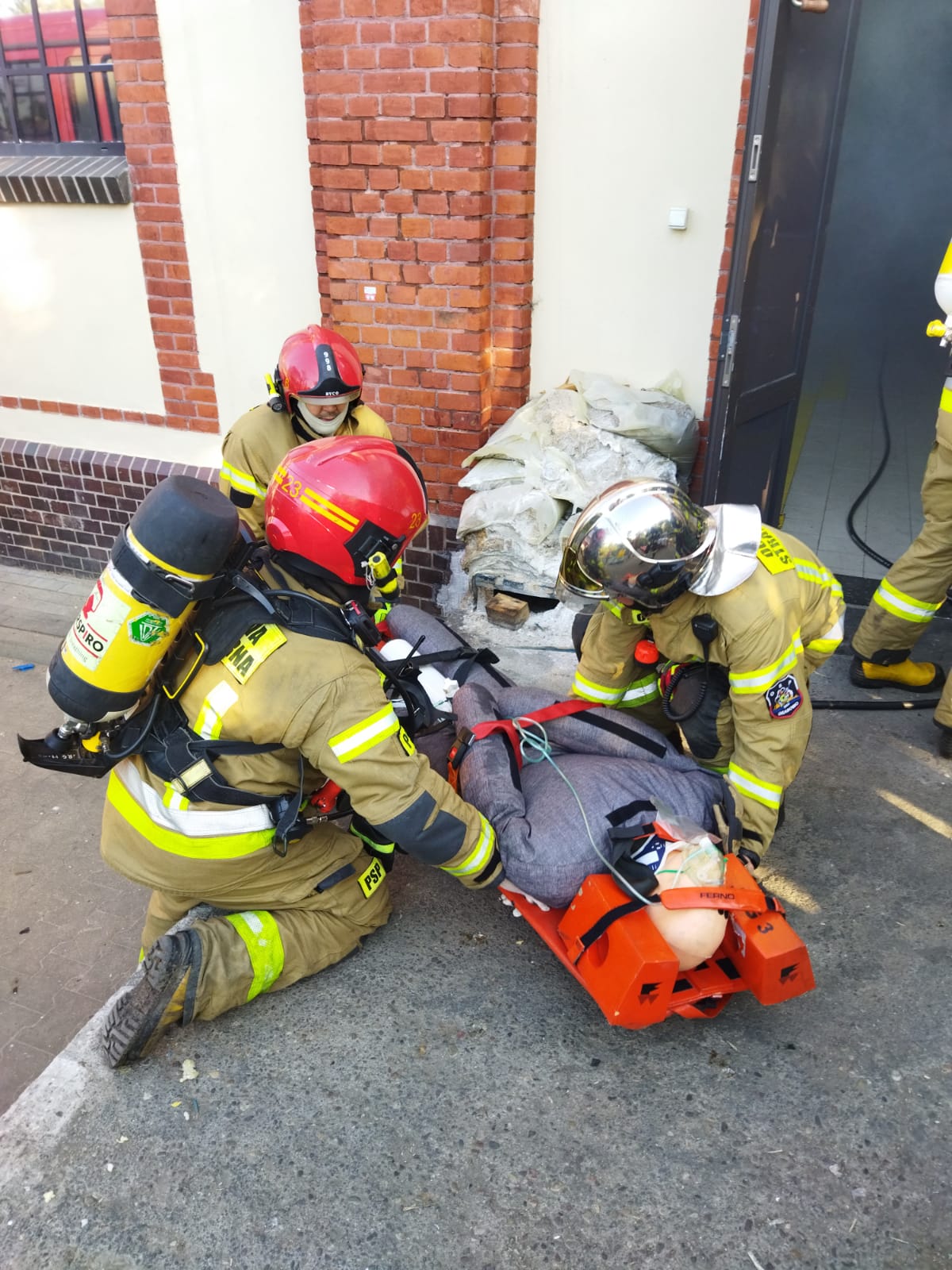 w trakcie powstania pożaru. Kierowniczka zmiany ewakuowała sklep przed przybyciem służb, następnie przekazała informacje KDR o 4 brakujących osobach oraz miejscu, gdzie wystąpiło zadymienie. Strażacy w zadymionym magazynie odnaleźli i ewakuowali dwa manekiny oraz dwie osoby poszkodowane (pracownice zakładu), zlokalizowali źródło ognia oraz po aplikacyjnym ugaszeniu pożaru oddymili cały budynek. Razem z 7 strażakami II zmiany służbowej JRG Mrągowo pod dowództwem mł. bryg. Mariusza Kozakiewicza, w ćwiczeniu praktycznym wzięło również udział 6 strażaków ochotników OSP Grabowo. Serdecznie dziękujemy wszystkim osobom, które zaangażowały się w organizację i przeprowadzenie ćwiczenia.
