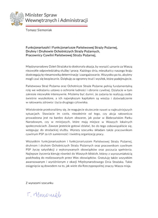 Wszystkim funkcjonariuszkom i funkcjonariuszom Państwowej Straży Pożarnej, druhnom i druhom Ochotniczych Straży Pożarnych oraz pracownikom cywilnym PSP życzę satysfakcji z wykonywanych obowiązków oraz poczucia spełnienia. Najlepsze życzenia kieruję również do Waszych bliskich, którzy z wyrozumiałością podchodzą do realizowanych przez Was obowiązków. Gratuluję także wszystkim awansowanym i wyróżnionym z okazji Międzynarodowego Dnia Strażaka. Takie osiągnięcia są dowodem na to, jak wiele dla Rzeczypospolitej znaczy Wasza misja.