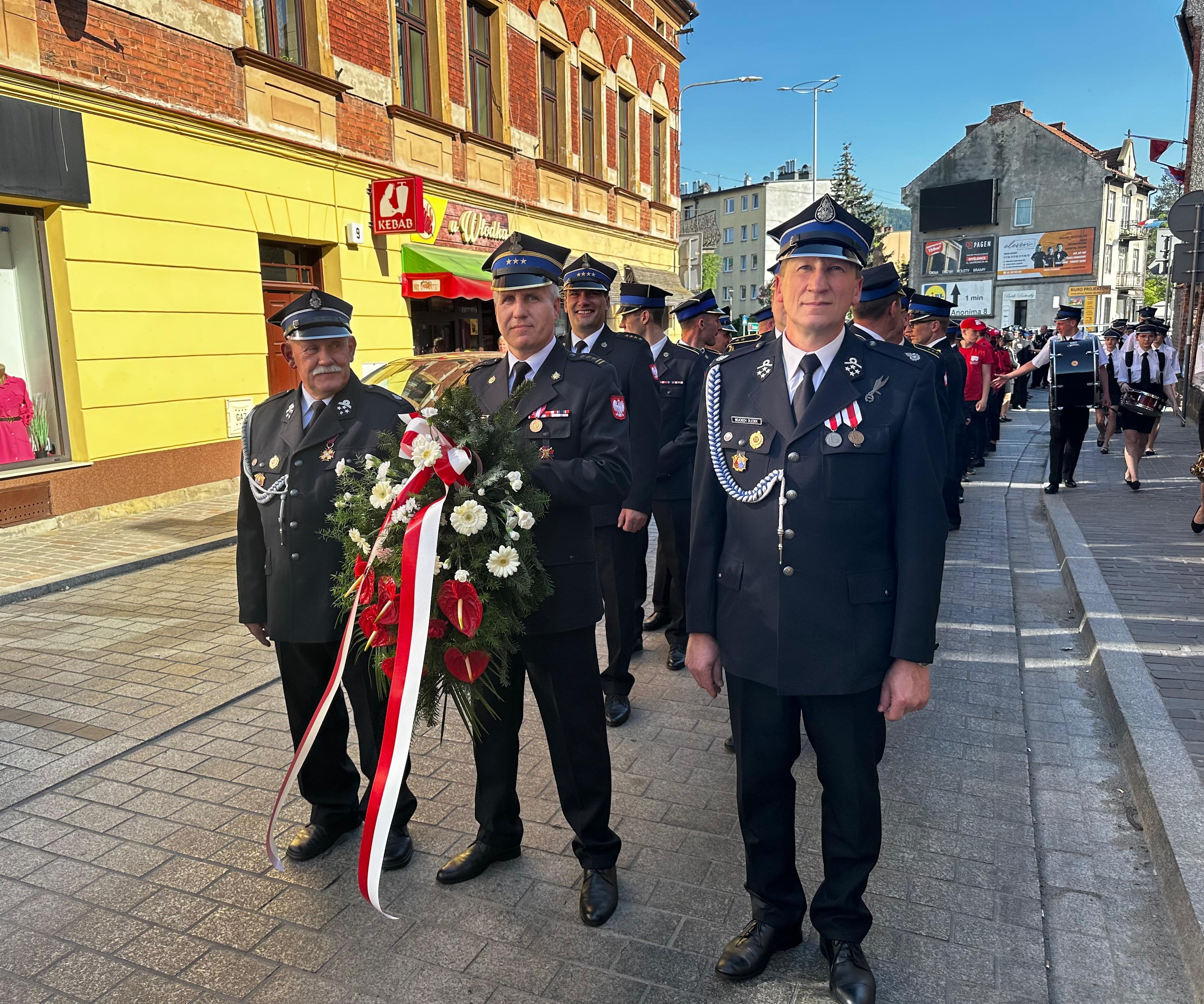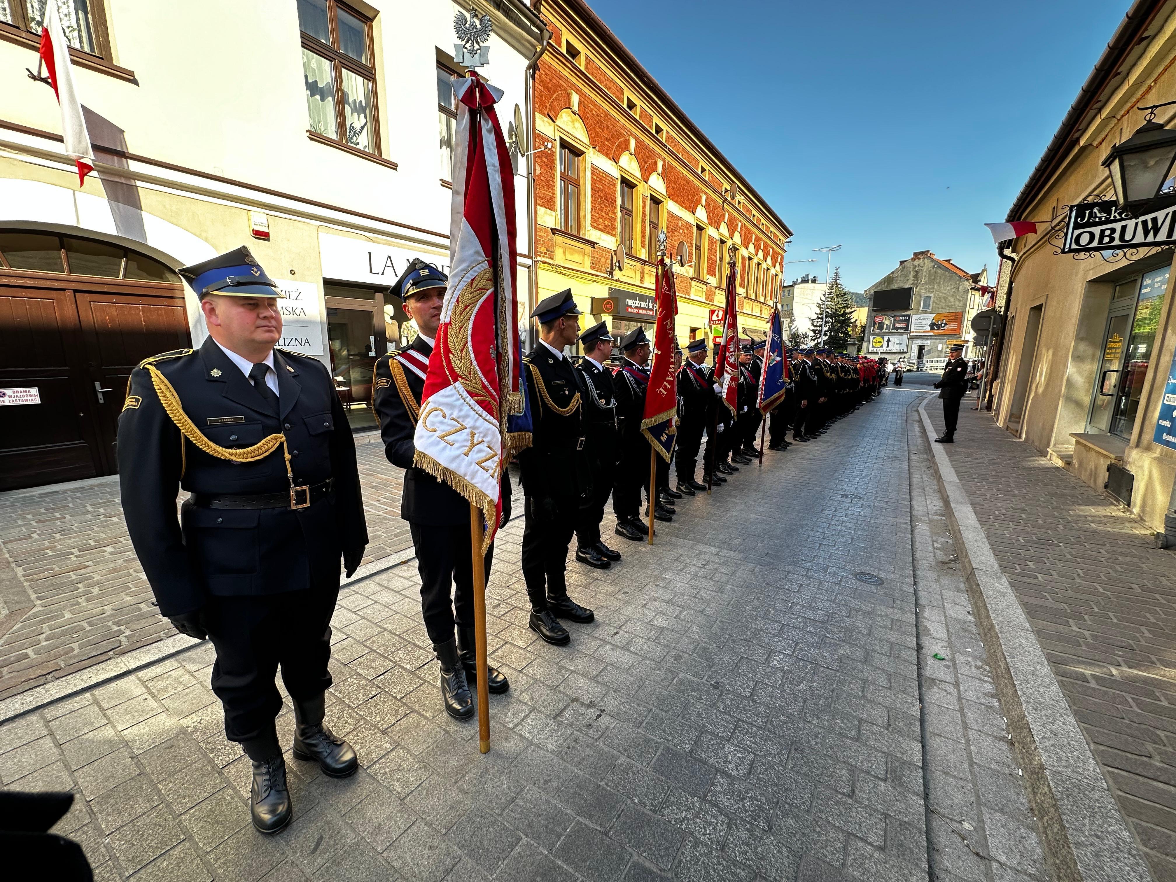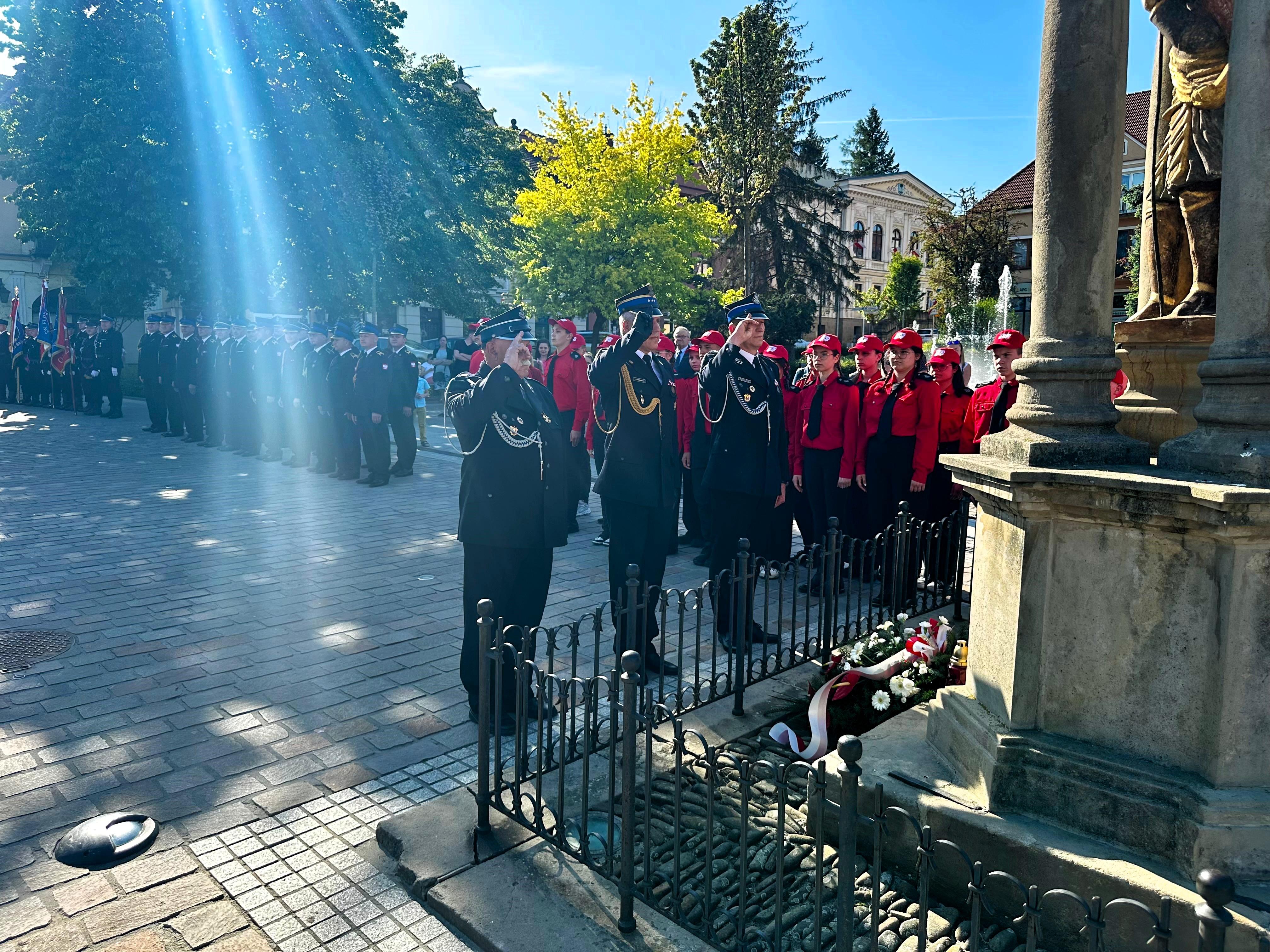 Myślenickie obchody Dnia Strażaka rozpoczął uroczysty przemarsz jednostek Państwowej Straży Pożarnej oraz Ochotniczych Straży Pożarnym gminy Myślenice, podczas którego Komendant Powiatowy Państwowej Straży Pożarnej w Myślenicach - st. bryg Sławomir Kaganek dokonał uroczystego złożenia wieńca pod pomnikiem Świętego Floriana na myślenickim Rynku.