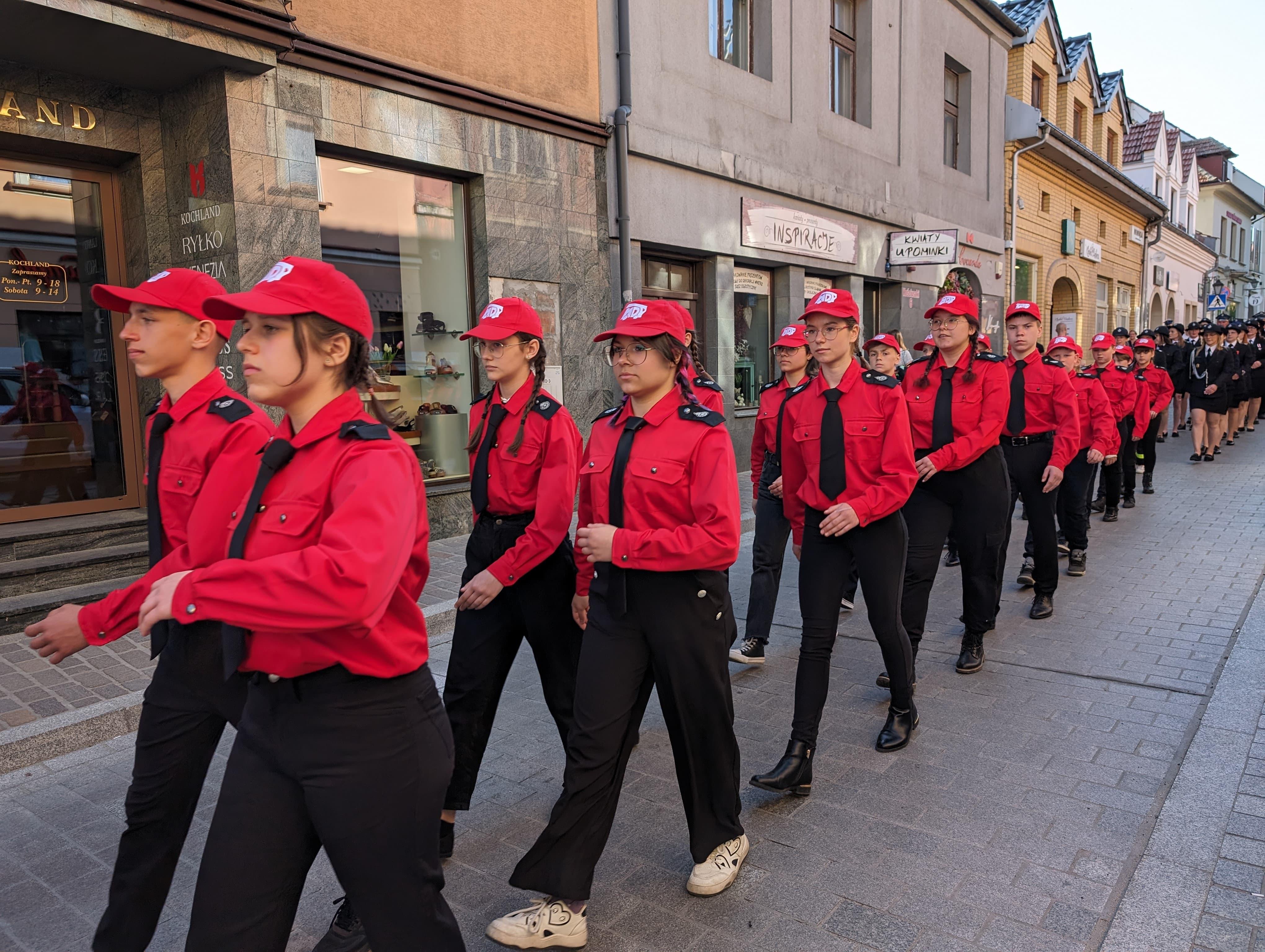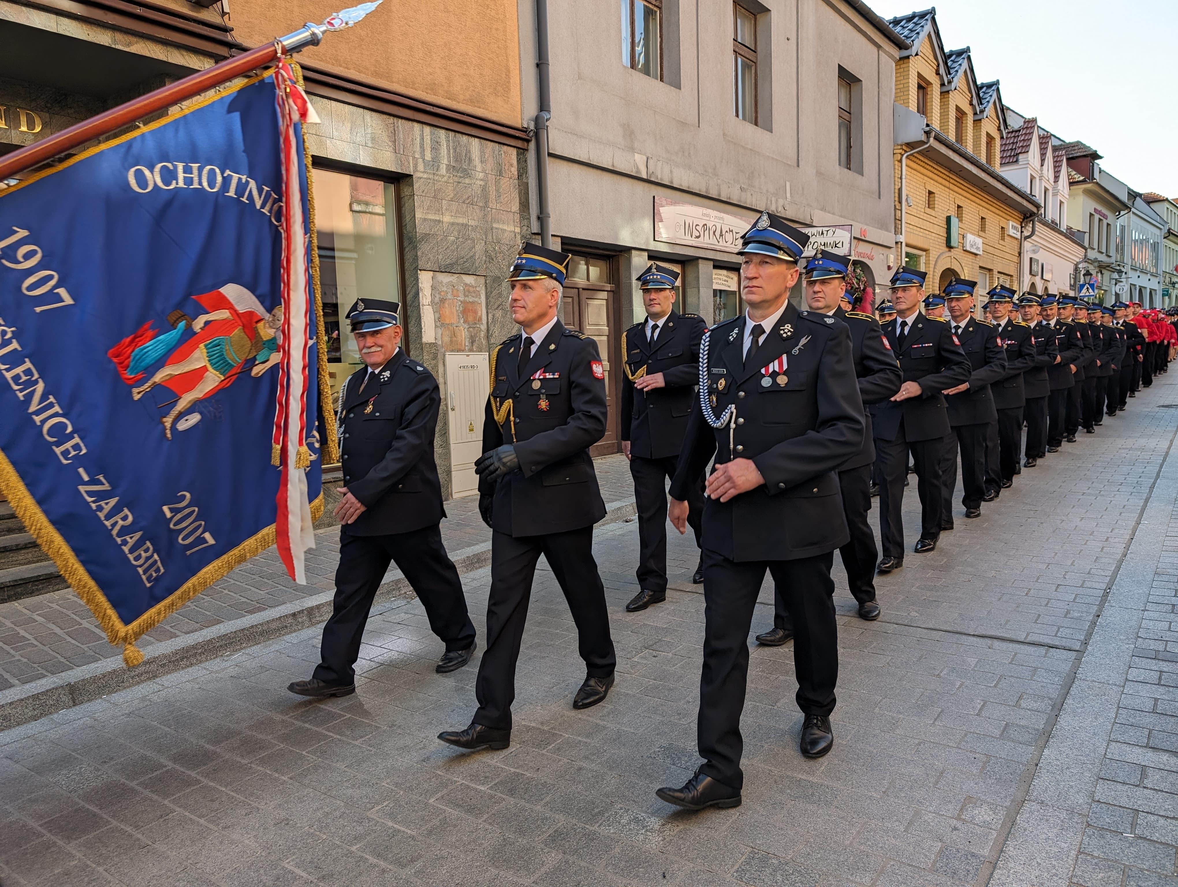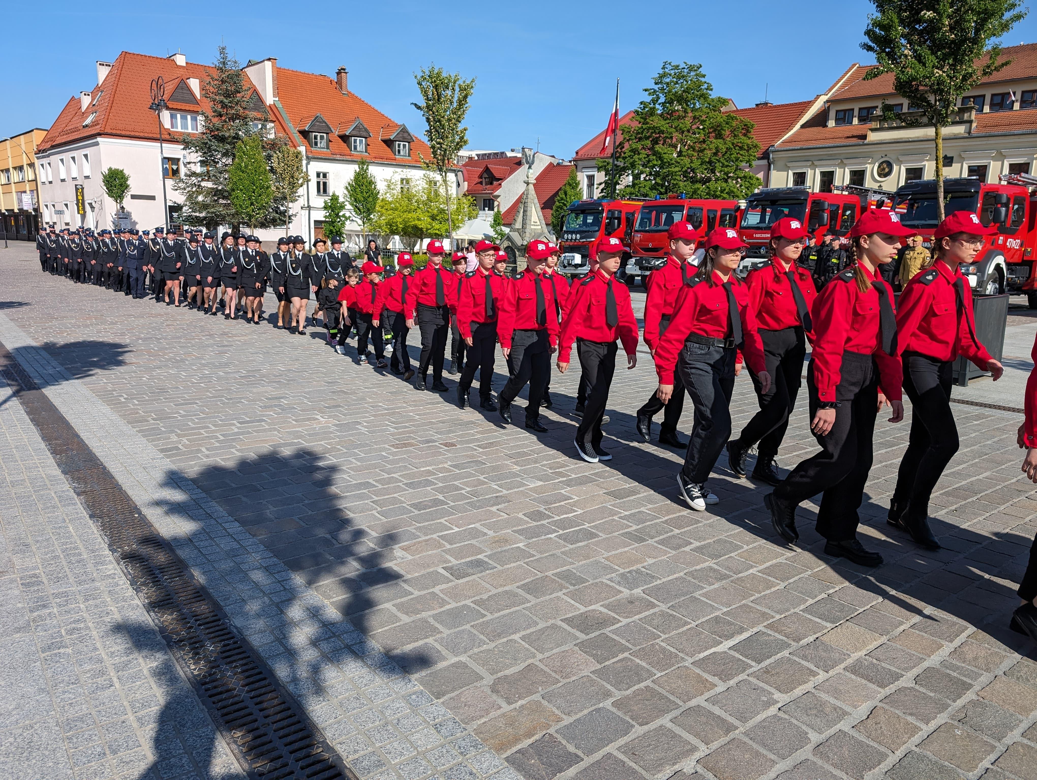 Myślenickie obchody Dnia Strażaka rozpoczął uroczysty przemarsz jednostek Państwowej Straży Pożarnej oraz Ochotniczych Straży Pożarnym gminy Myślenice, podczas którego Komendant Powiatowy Państwowej Straży Pożarnej w Myślenicach - st. bryg Sławomir Kaganek dokonał uroczystego złożenia wieńca pod pomnikiem Świętego Floriana na myślenickim Rynku.