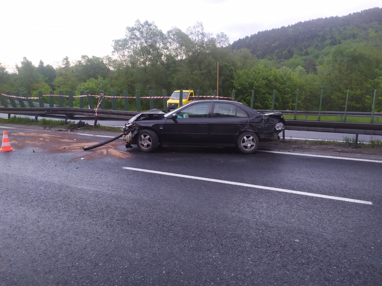 Zmieniające się warunki atmosferyczne podczas weekendu utrudniały poruszanie się pojazdów. Dyżurny operacyjny SKKP PSP odbierał zgłoszenia i dysponował do działań zastępy strażaków czterokrotnie do wypadku, kolizji (Głogoczów, Stróża, Myślenice, Lubień) i również cztery razy do usunięcia substancji ropopochodnych utrudniających ruch na drogach powiatu (Lubień, Myślenice 3x). Często dochodzi do poślizgu na mokrej nawierzchni jezdni. Akcja ratownicza z dnia 29 maja godzina 20.01 - zgłoszenie informuje o zderzeniu samochodu osobowego z przydrożnymi barierami na drodze ekspresowej S7. Podczas uderzenia w bariery energochłonne części karoserii spowodowały uszkodzenia nadjeżdżającego innego pojazdu. W wyniku wypadku jedna osoba została poszkodowana /kierowca/, której KPP do czasu przybycia ZRM udzielili strażacy PSP. Zabezpieczono miejsce zdarzenia, oświetlono teren działań, poddano sorpcji rozlane płyny eksploatacyjne. Zespół Ratownictwa Medycznego przewiózł poszkodowanego do szpitala. Uszkodzone bariery oddzielające pasy jezdni zostały zabezpieczone i oznakowane przez patrol GDDKiA. Zniszczony pojazd został zabrany przez służby pomocy drogowej. Przykładowa akcja zaabsorbowała strażaków na około 2 godziny.