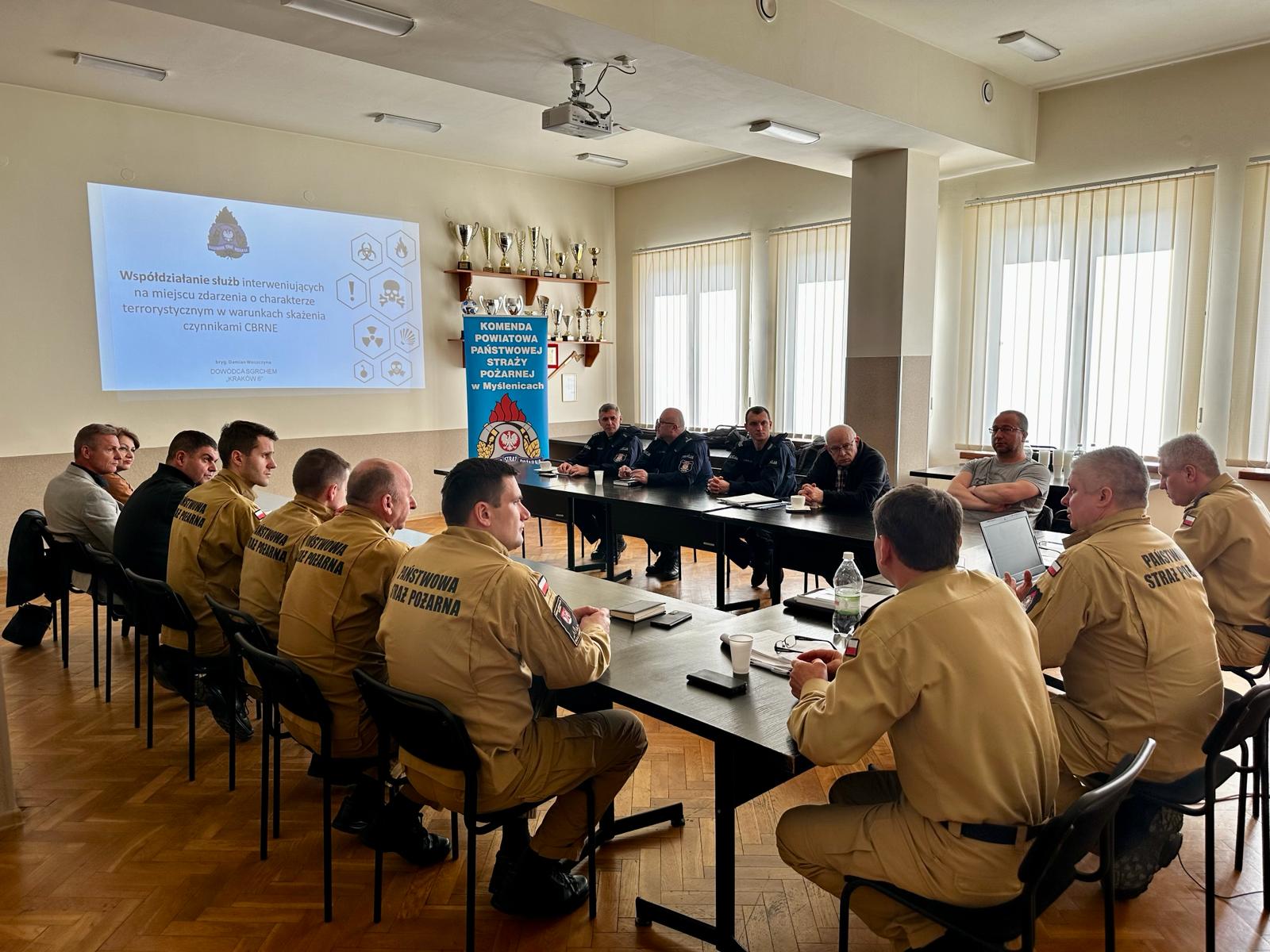 W piątek 15 marca 2024 roku w budynku Komendy Powiatowej Państwowej Straży Pożarnej w Myślenicach miały miejsce ćwiczenia zgrywające dowódczo-sztabowe Państwowej Straży Pożarnej oraz Policji dot. współdziałania służb na miejscu zdarzeń o charakterze CBRN-E.