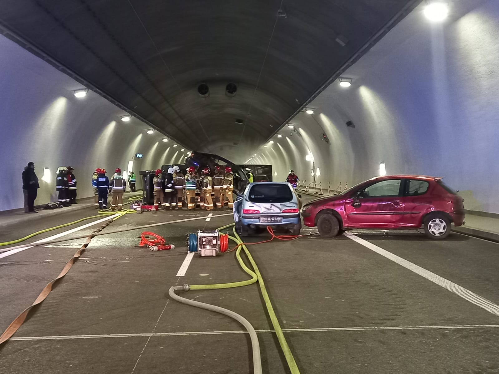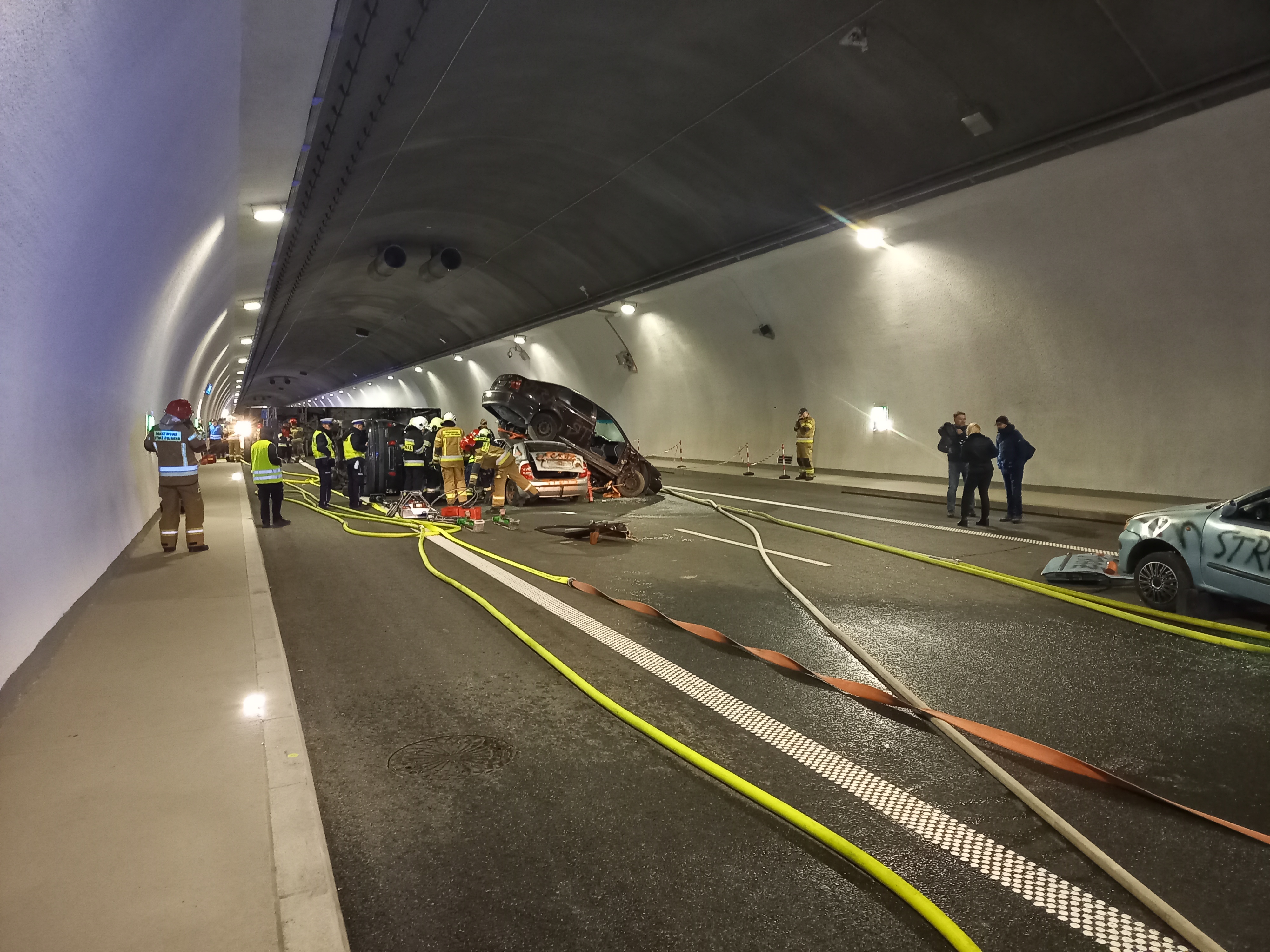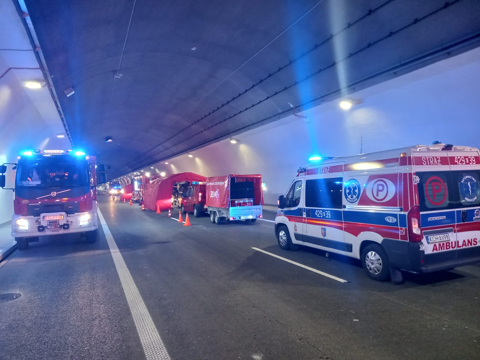 Kierujący autobusem przewożącym 30 osób jedzie trasą S7 w kierunku Zakopanego, po zderzeniu z pojazdem dostawczym traci kontrolę nad pojazdem, co doprowadza do przewrócenia się autobusu na lewy bok. Nadjeżdżające z dużą prędkością kolejne pojazdy widząc zagrożenie, gwałtownie hamują, doprowadzając do licznych niegroźnych kolizji między sobą. W wyniku zaistniałej sytuacji następuje pożar i zadymienie tunelu. Zdarzenie kwalifikowane jest jako katastrofa w ruchu drogowym, w którym występuje duża liczba poszkodowanych. Tunel jest całkowicie zablokowany.