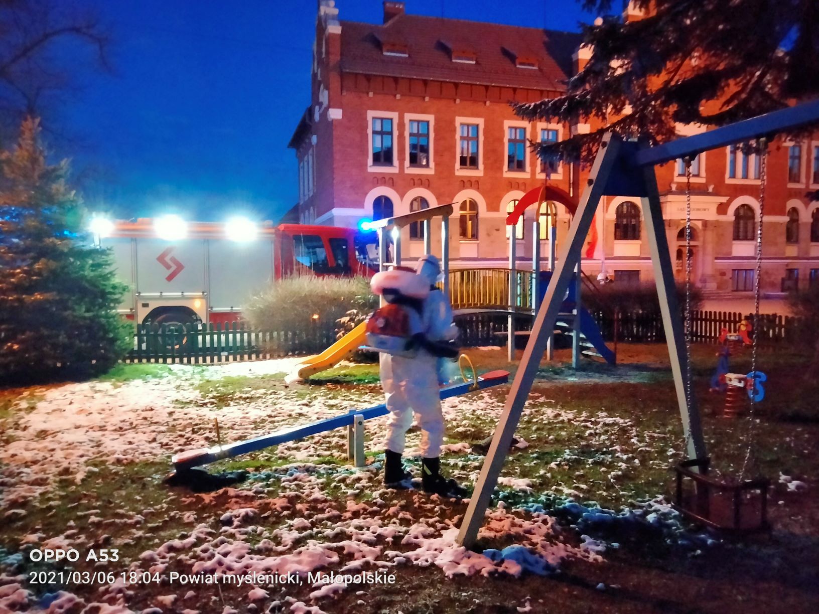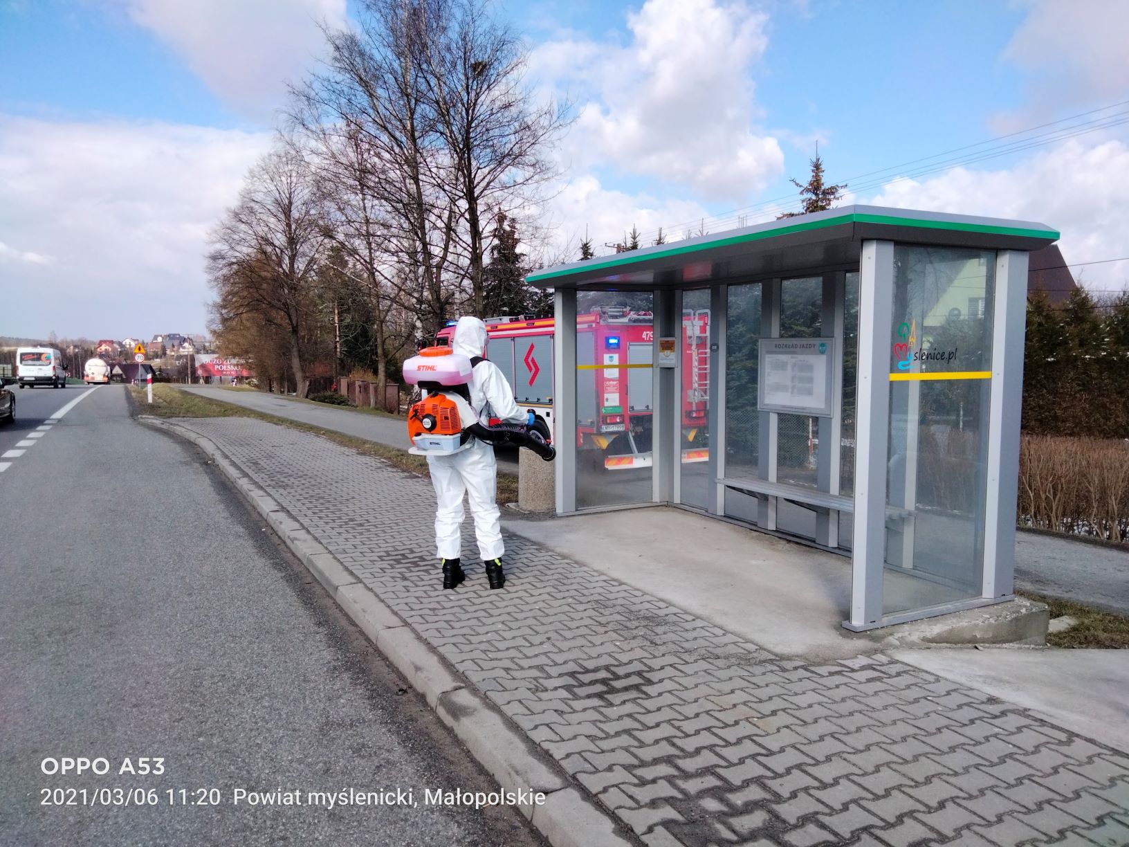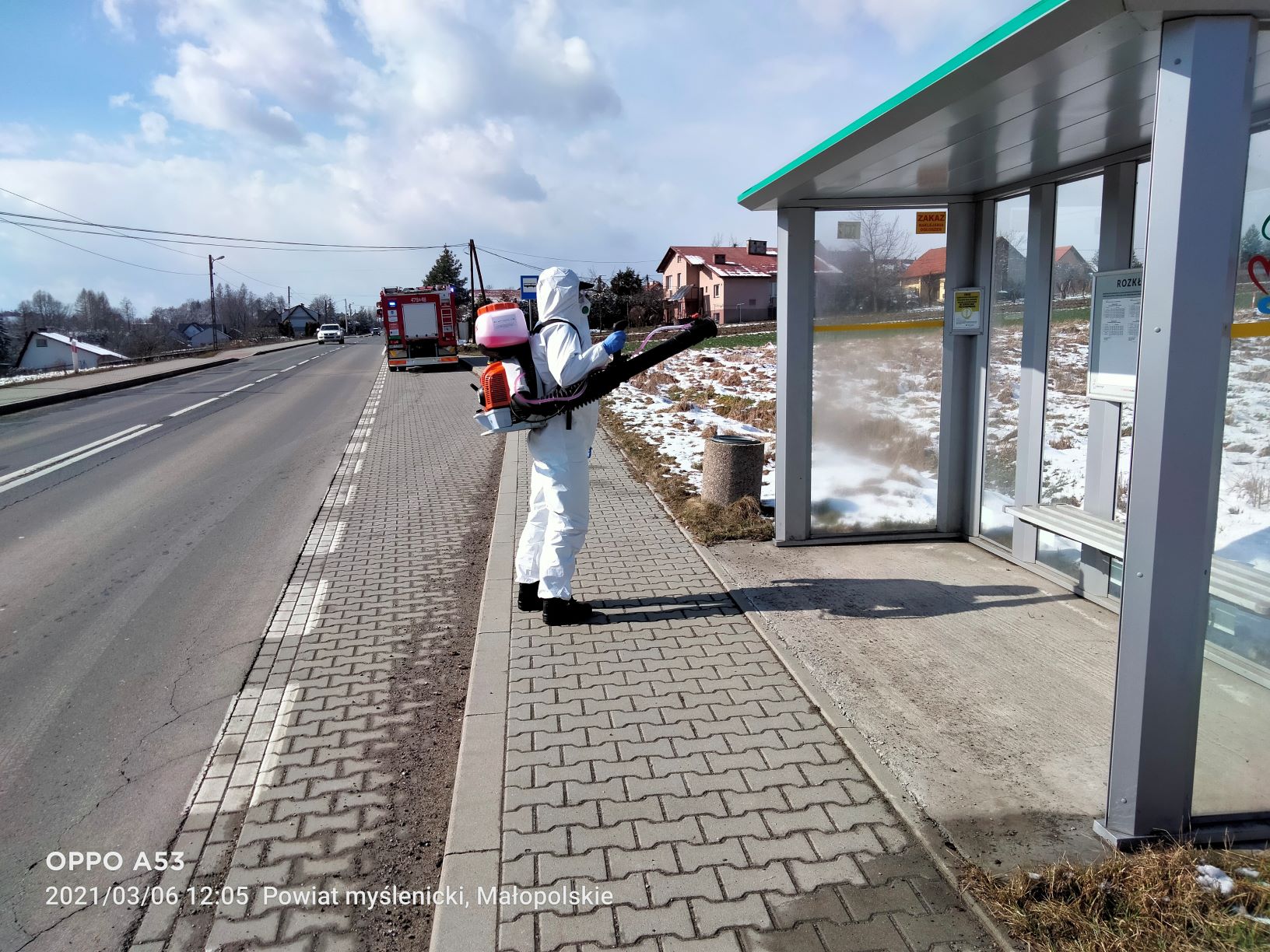 W dniach 6 i 7 marca jednostki Ochotniczych Straży Pożarnych z terenu powiatu myślenickiego prowadziły akcję dekontaminacji przestrzeni publicznej przy użyciu sprzętu zakupionego w ramach Małopolskiej Tarczy Antykryzysowej - Pakiet Medyczny. Działania prowadzono w celu zapobiegania, przeciwdziałania i zwalczania skutków rozprzestrzeniania się koronawirusa SARS-CoV-2. Czynności polegały na odkażeniu środkiem dezynfekcyjnym przy wykorzystaniu przenośnych opryskiwaczy spalinowych miejsc przestrzeni publicznej m.in. przystanków autobusowych, placów zabaw. Wyżej wymienione działania były realizowane na terenie wszystkich gmin powiatu myślenickiego.