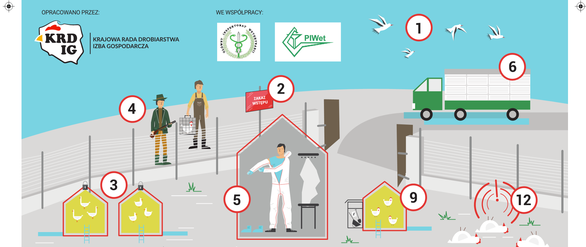 - wprowadzenie zakazu wjazdu pojazdów na teren fermy, poza działaniami koniecznymi np. dowóz paszy, odbiór drobiu do rzeźni lub przez zakład utylizacyjny;