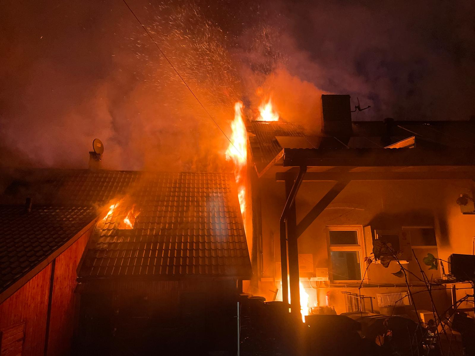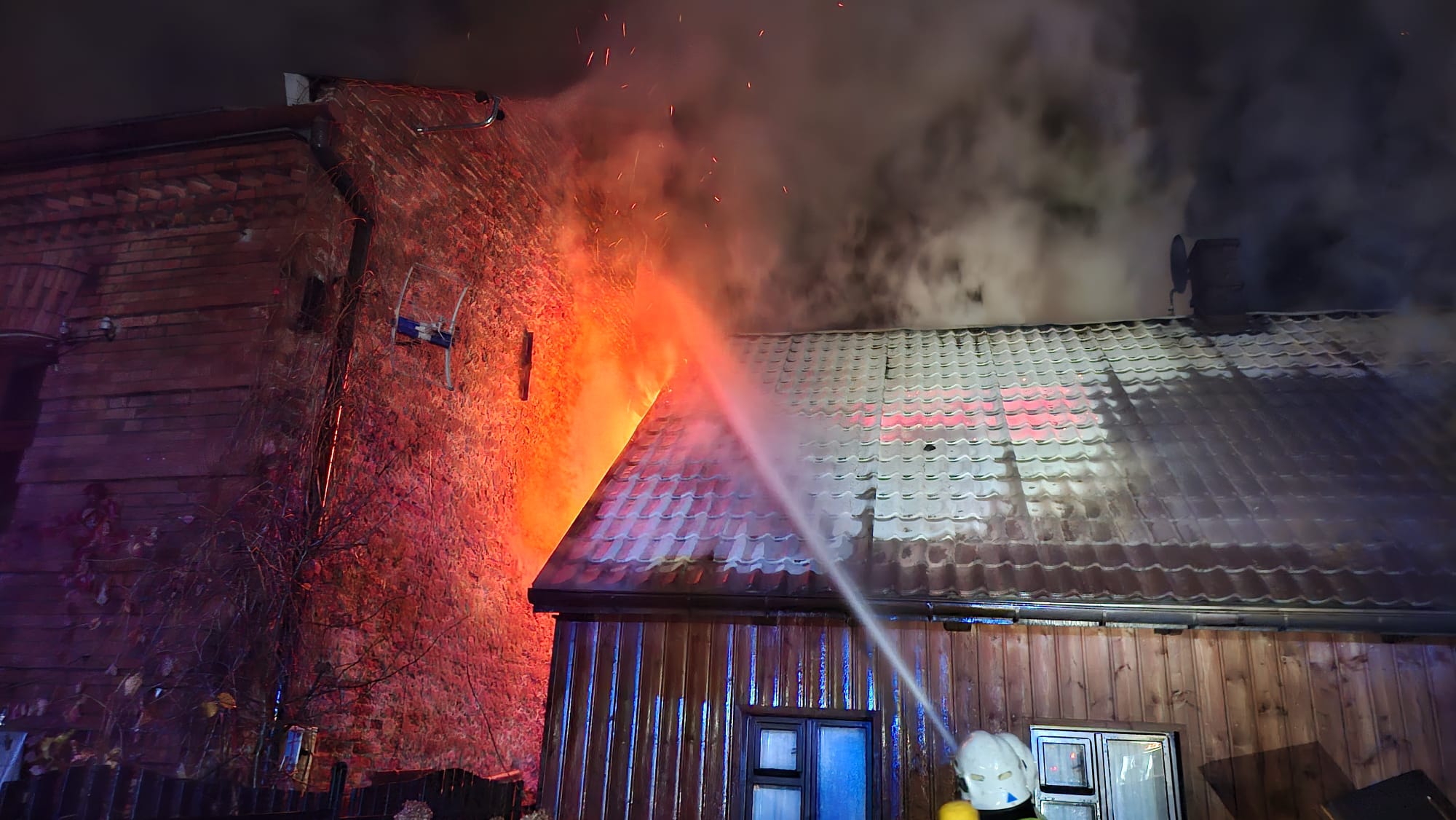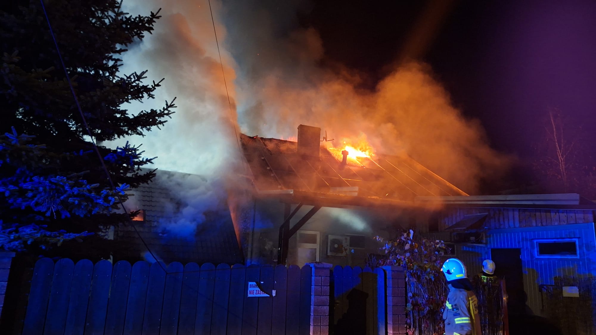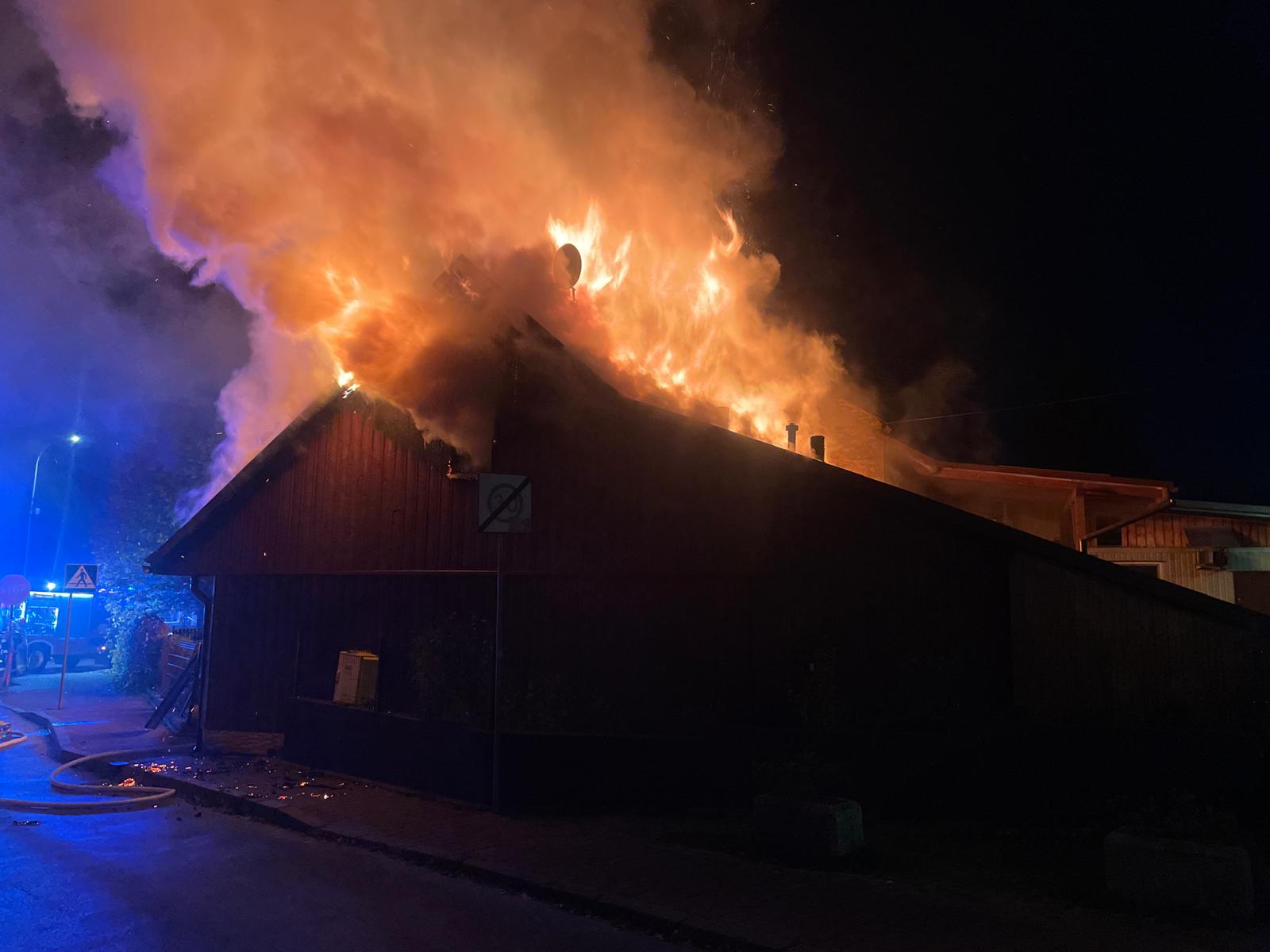 Po przybyciu pierwszych zastępów straży pożarnej stwierdzono rozwinięty pożar poddasza budynku jednorodzinnego. Ogień obejmował znaczną część konstrukcji dachu i w szybkim tempie rozprzestrzeniał się w kierunku sąsiedniego budynku, którego poddasze również zaczęło ulegać zajęciu przez płomienie. W pierwszej kolejności strażacy przystąpili do ewakuacji mieszkańców – z budynku objętego pożarem ewakuowano trzy osoby, które nie odniosły obrażeń i zostały przekazane pod opiekę zespołu ratownictwa medycznego.