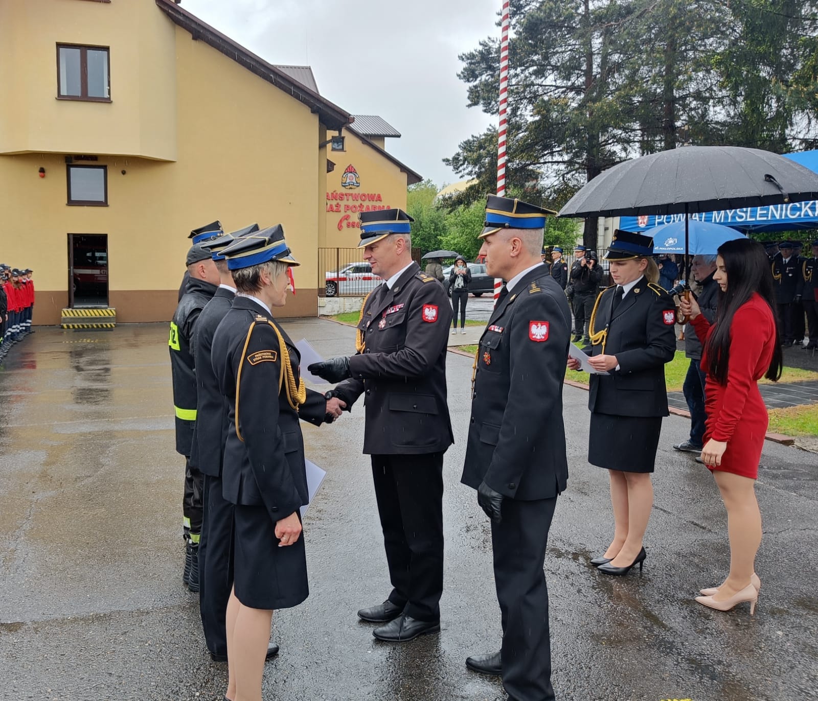 Podczas apelu wręczono odznaczenia łącznie 15 funkcjonariuszom, a awanse na wyższe stopnie służbowe otrzymało 12 strażaków myślenickiej komendy.