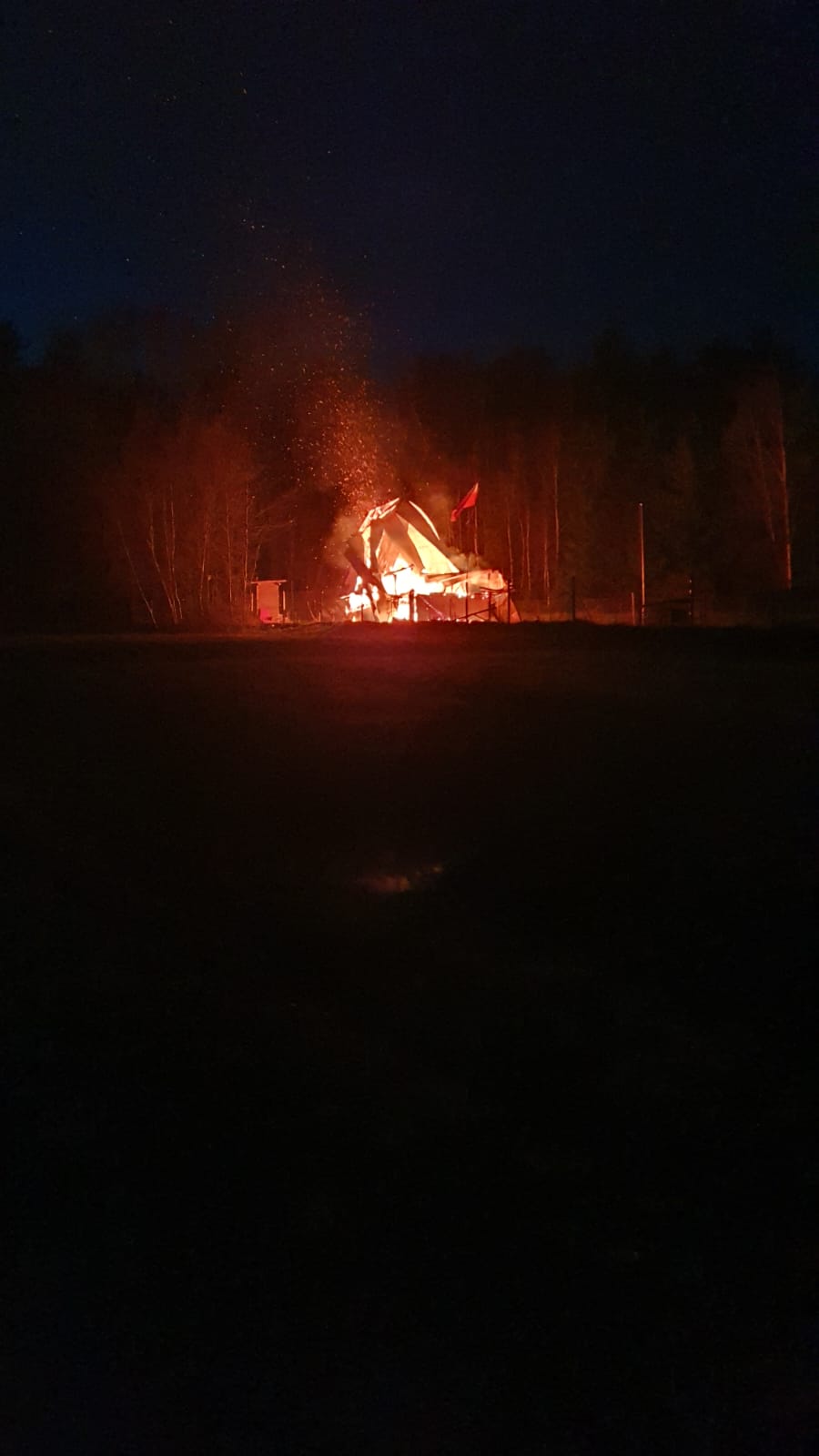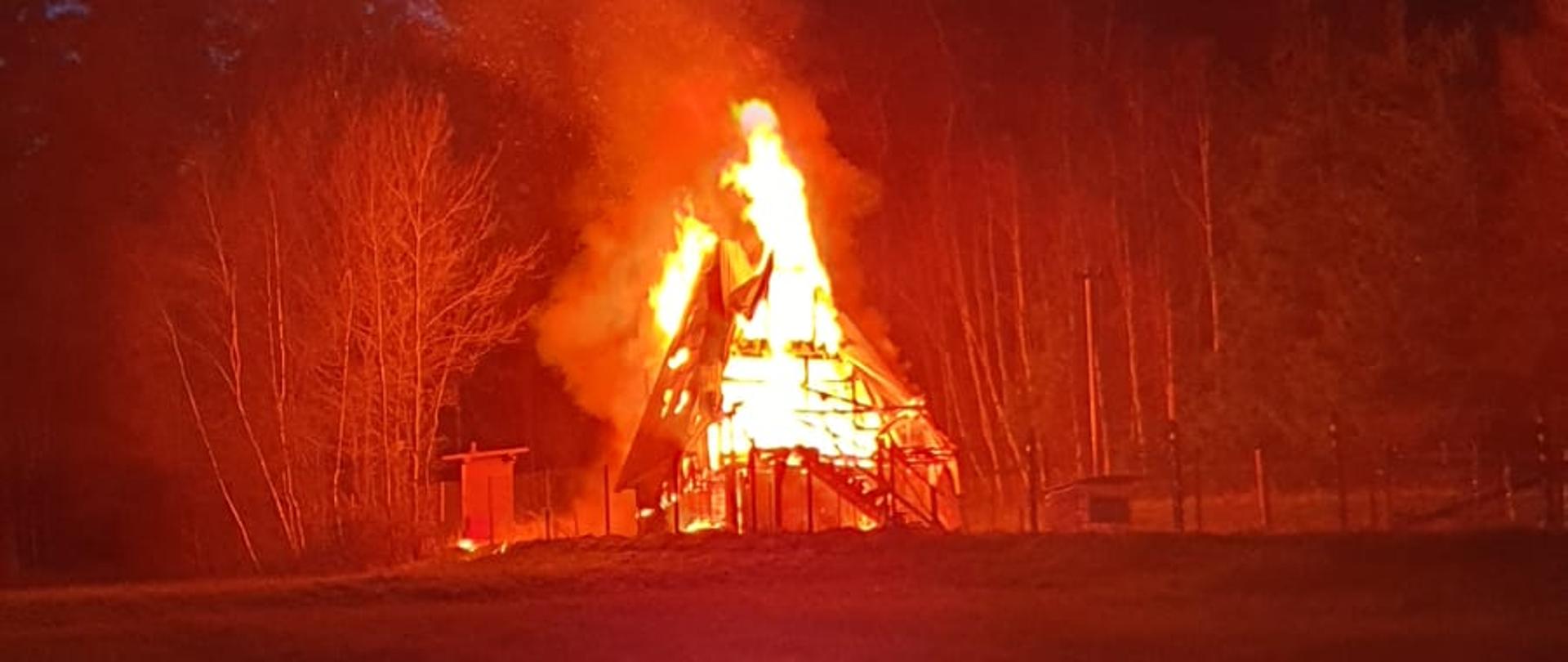 Do zdarzenia doszło około godziny 20:00. Ze względu na lokalizację obiektu, aby dotrzeć na miejsce zadysponowano dodatkowo samochód lekki wraz z quadem należące do JRG Myślenice oraz quad z agregatem gaśniczym należący do OSP Myślenice Zarabie. Lokalni mieszkańcy pomogli pozostałym strażakom przetransportować się do miejsca zdarzenia samochodami terenowymi, a także dostarczono wodę ciągnikiem z beczką. W wyniku pożaru budynek spłonął całkowicie. Strażacy dogasili palące się elementy konstrukcji, oraz wyciągnęli z pogorzeliska butlę propan-butan. Podczas prowadzonej akcji gaśniczej, właściciel obiektu stracił przytomność. Natychmiast przystąpiono do wykonania kwalifikowanej pierwszej pomocy, a następnie przetransportowano poszkodowanego do miejsca, w którym został bezpiecznie przekazany Zespołowi Ratownictwa Medycznego. W akcji brały udział zastępy z JRG Myślenice, OSP Jawornik, OSP Krzyszkowice, OSP Myślenice Zarabie.