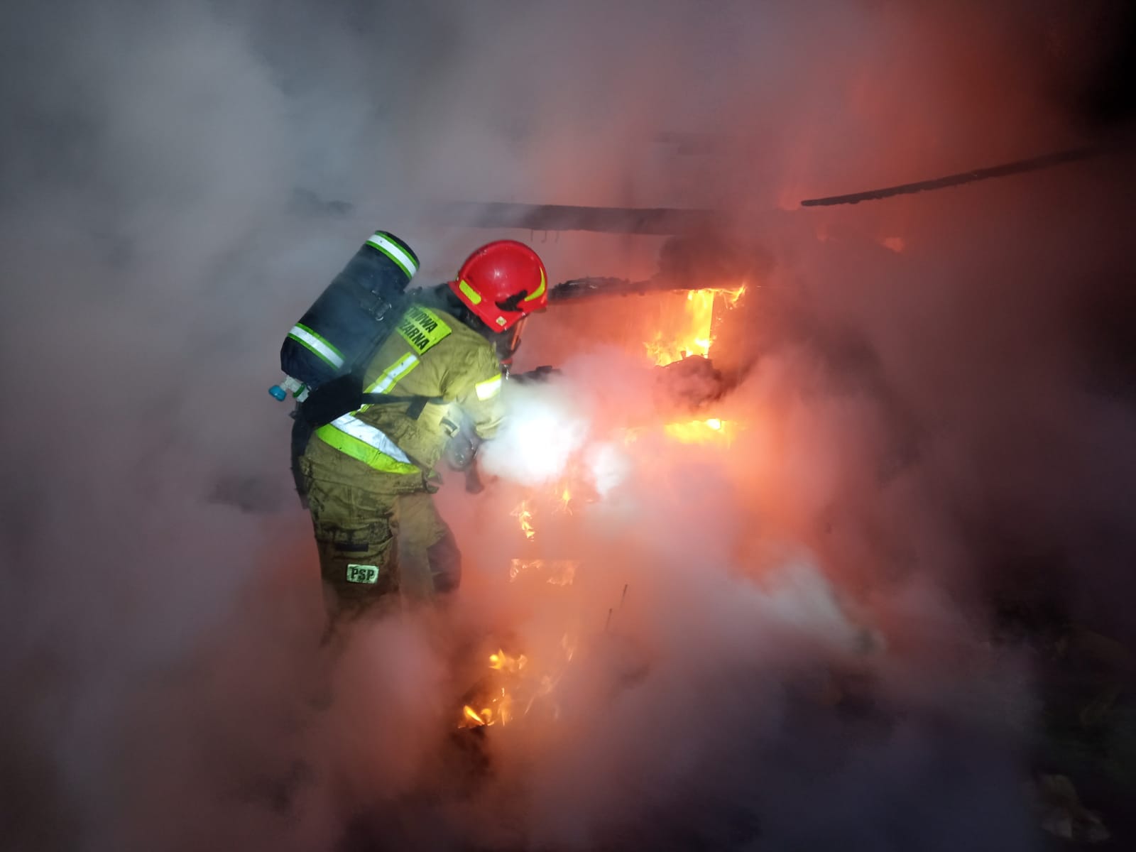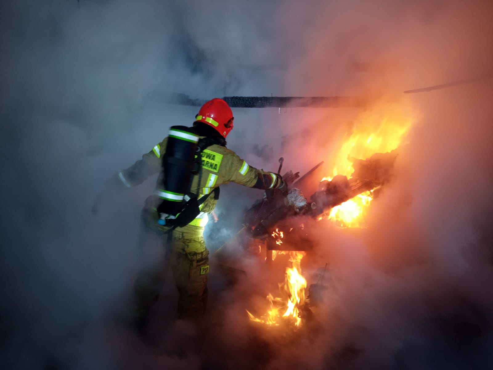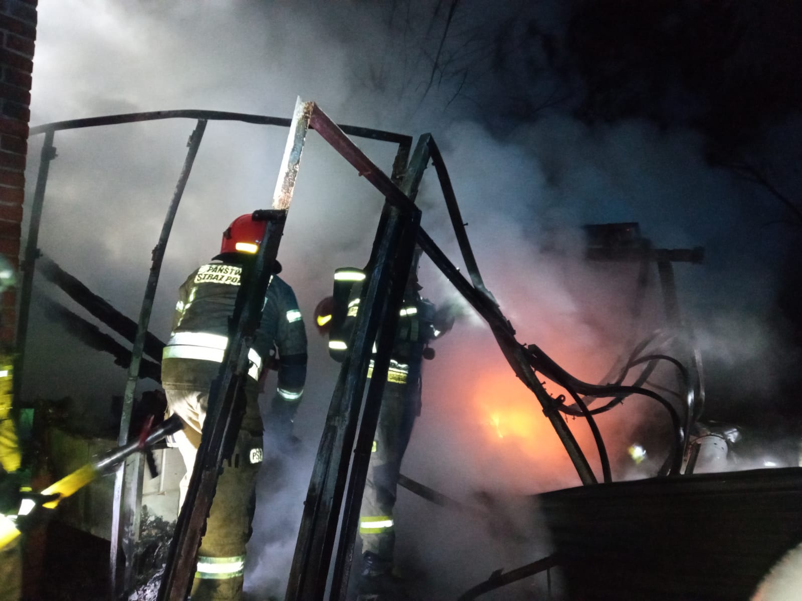 Strażacy po przybyciu na miejsce zdarzenia stwierdzili objęty pożarem cały budynek gospodarczy o konstrukcji drewniano - stalowej kryty blachą. Osób poszkodowanych nie było. Celem strażaków było zabezpieczenie terenu akcji przed osobami postronnymi, ograniczenie rozprzestrzenienia ognia oraz likwidację pożaru przy użyciu dwóch prądów gaśniczych wody w natarciu na palący się obiekt. Roty, które pracowały wewnątrz obiektu stosowały aparaty ODO. Po zlokalizowaniu pożaru przystąpiono do prac rozbiórkowych konstrukcji dachu oraz ścian celem wyeliminowania zarzewi ognia.
