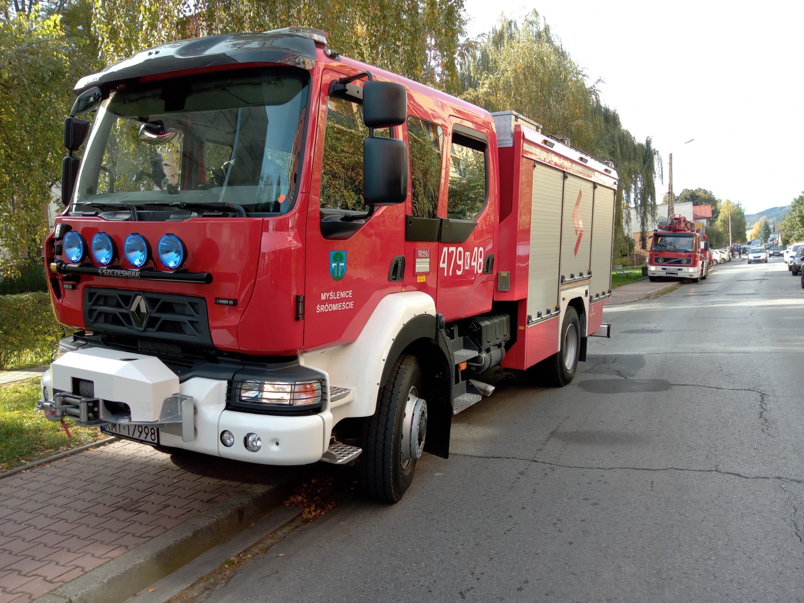 Kilka minut przed południem w dniu 19 października (11.51) do SKKP PSP w Myślenicach za pośrednictwem CPR Kraków wpłynęło zgłoszenie informujące o pożarze mieszkania na osiedlu 1000-lecia w Myślenicach. Dyżurny operacyjny zadysponował wszystkie będące w gotowości zastępy JRG Myślenice oraz OSP Myślenice Śródmieście. Po przybyciu na miejsce zdarzenia otrzymano informację, iż z wnętrza objętego ogniem mieszkania przez okno balkonowe ewakuowała się lokatorka. Działania strażaków polegały na podaniu dwóch prądów wody w celu ugaszenia pożaru, udzieleniu Kwalifikowanej Pierwszej Pomocy poszkodowanej do czasu przybycia i przekazania ratownikom medycznym ZRM. W związku z bardzo dużym zadymieniem strażacy rot gaśniczych pracowali w aparatach ochrony dróg oddechowych. Po ugaszeniu oddymiono pomieszczenia, klatkę schodową z nagromadzonych produktów spalania poprzez użycie wentylatora osiowego. Ratownicy podczas działań wykorzystali posiadany sprzęt specjalistyczny – kamera termowizyjna, detektory wielogazowe, które umożliwiły sprawne i skuteczne przeprowadzenie i zakończenie działań. Akcja i utrudnienia na terenie osiedla trwały około 1 godziny.