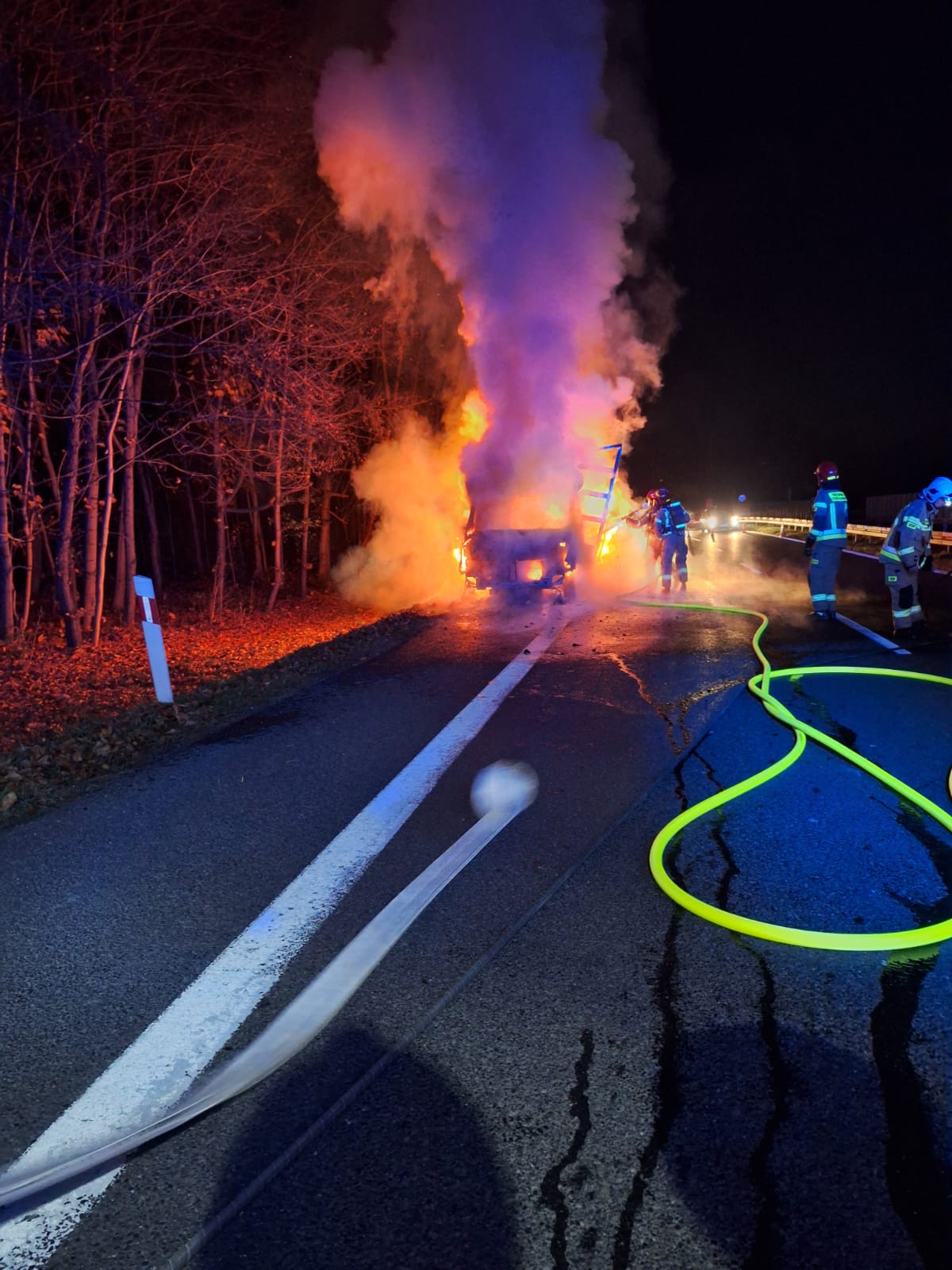 Po przybyciu pierwszych zastępów straży pożarnej na miejsce zdarzenia i przeprowadzeniu rozpoznania stwierdzono, że na pasie awaryjnym znajduje się w pełni objęty ogniem samochód dostawczy marki Renault Master. Kierowca opuścił pojazd przed przybyciem służb — nikt nie został poszkodowany.