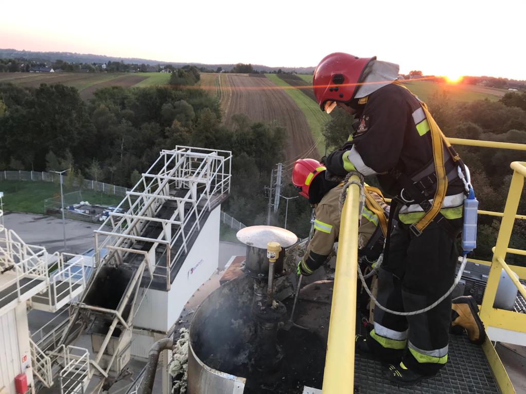 W dniu 2 października o godzinie 5.11 do SKKP PSP w Myślenicach wpłynęło zgłoszenie o pożarze silosu, w którym przechowywany jest asfalt w miejscowości Polanka (strefa przemysłowa Jawornik – Polanka). Dyżurny operacyjny zadysponował do działań zastępy JRG i OSP. Po przybyciu na miejsce zdarzenia i wstępnym rozpoznaniu sytuacji stwierdzono płomienie na górnym poszyciu zbiornika bitumu o pojemności ok. 100 ton surowca. Zabezpieczono i oświetlono teren akcji. W celu likwidacji zagrożenia sprawiono ratowniczy podnośnik hydrauliczny i podano prądy gaśnicze piany i wody. W wyniku prowadzonego rozpoznania nie stwierdzono zagrożenia rozprzestrzeniania się ognia na sąsiednie zbiorniki. W celu dogaszenia pożaru, który objął zewnętrzne ocieplenie rozebrano metalowe poszycie płaszcza zbiornika bitumu oraz przelano i usunięto tlące się materiały izolacyjne. W trakcie działań na bieżąco korzystano z kamery termowizyjnej, którą lokalizowano podwyższoną temperaturę w miejscach wymagających schłodzenia oraz współpracowano z obsługą zakładu. W działaniach trwających ponad 4 godziny udział brały zastępy JRG Myślenice GBARt, GCBA, SLRR, SH-25 oraz GBA z OSP Jawornik.