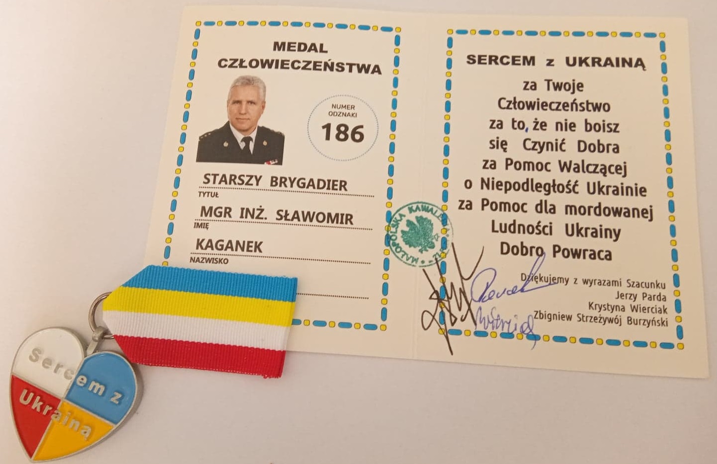 W dniu 27 kwietnia w Sali Polskiego Towarzystwa Gimnastycznego „Sokół” w Krakowie odbył się koncert Solidarności z Ukrainą, podczas którego Komendant Powiatowy PSP w Myślenicach st. bryg. Sławomir Kaganek oraz Starosta Powiatu Myślenickiego odebrali medale człowieczeństwa za pomoc dla Ukrainy.