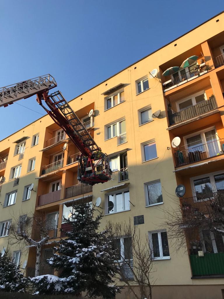 W dniu 14 lutego do SKKP PSP w Myślenicach wpłynęło zgłoszenie informujące, iż w budynku wielorodzinnym na osiedlu 1000-lecia widoczne są od dłuższego czasu uchylone drzwi balkonowe. Niskie temperatury panujące na zewnątrz i uchylone drzwi zaniepokoiły sąsiadów. Z uzyskanych informacji od zarządcy obiektu istniało podejrzenie przebywania osób wewnątrz mieszkania, które pomimo próby nawiązania kontaktu nie odpowiadały na wezwania. W związku z tym strażacy JRG w obecności funkcjonariuszy policji podjęli działania mające na celu sprawdzenie mieszkania w celu wykluczenia obecności osób poszkodowanych wewnątrz. Do tego celu wykorzystano podnośnik hydrauliczny SH-25, który rozstawiono na ul. Pardyaka. Po wejściu i sprawdzeniu nie stwierdzono obecności osób w mieszkaniu.