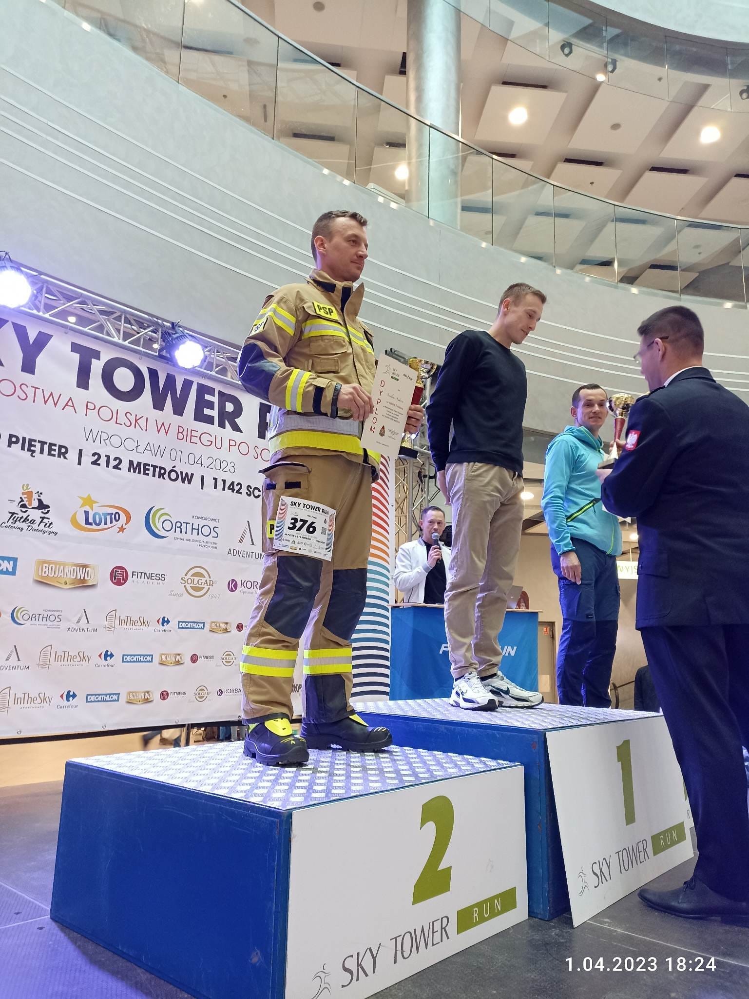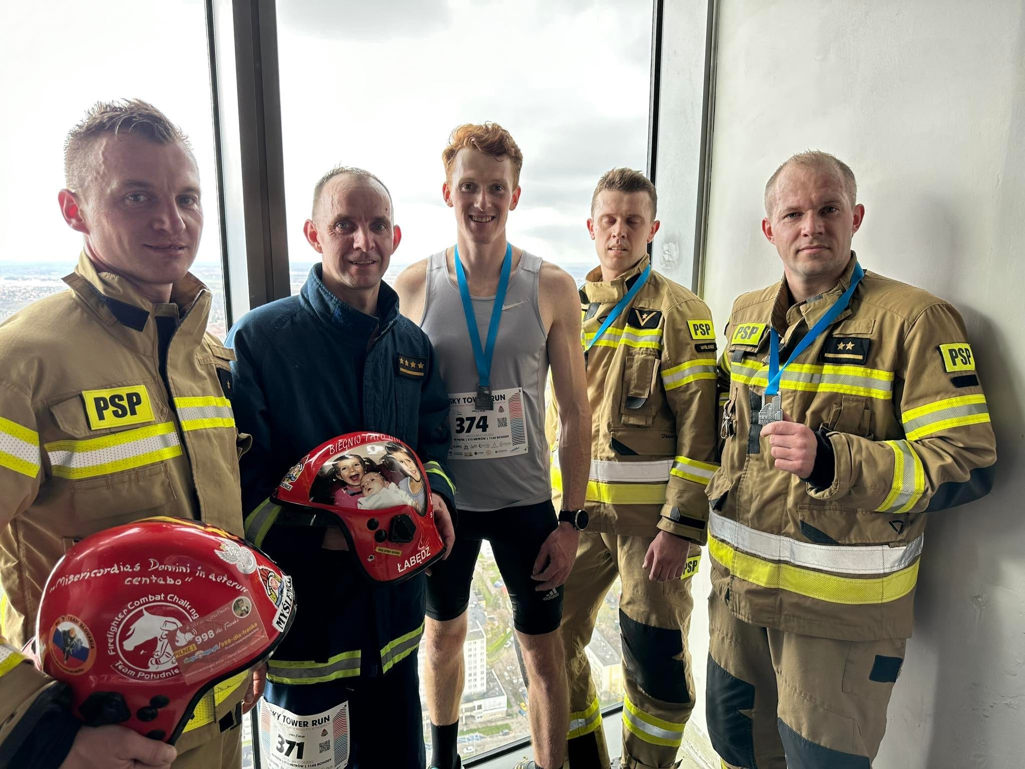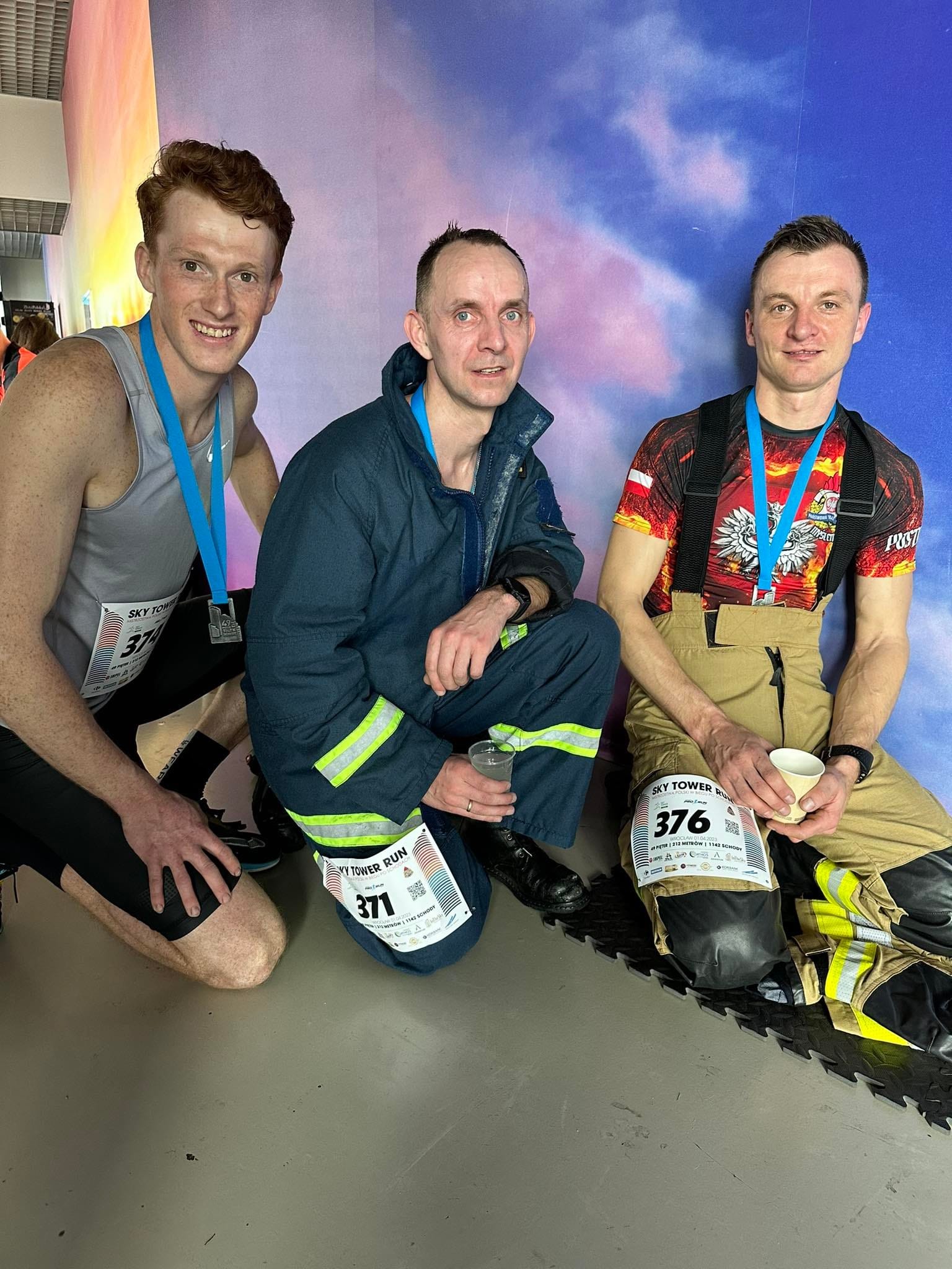 W sobotę 1 kwietnia 2023 r. funkcjonariusze tut. komendy (st. kpt. Marek Łabędź, mł. kpt. Szymon Jopek, asp. Mariusz Pustuła, mł. asp. Szymon Wiśniewski) wzięli udział z sukcesami w Sky Tower Run, czyli biegu na 49 piętro wrocławskiego wieżowca. Zawodnicy mieli do pokonania 49 pięter (1142 schody) w umundurowaniu specjalnym, butach specjalnych, rękawicach specjalnych, hełmie strażackim oraz aparacie powietrznym na plecach z podpiętym automatem oddechowym do maski.
