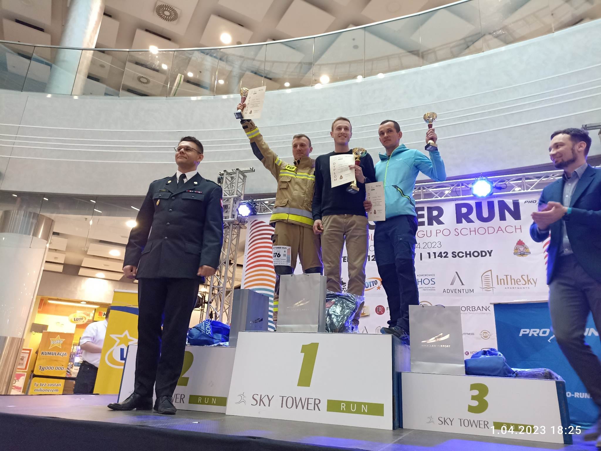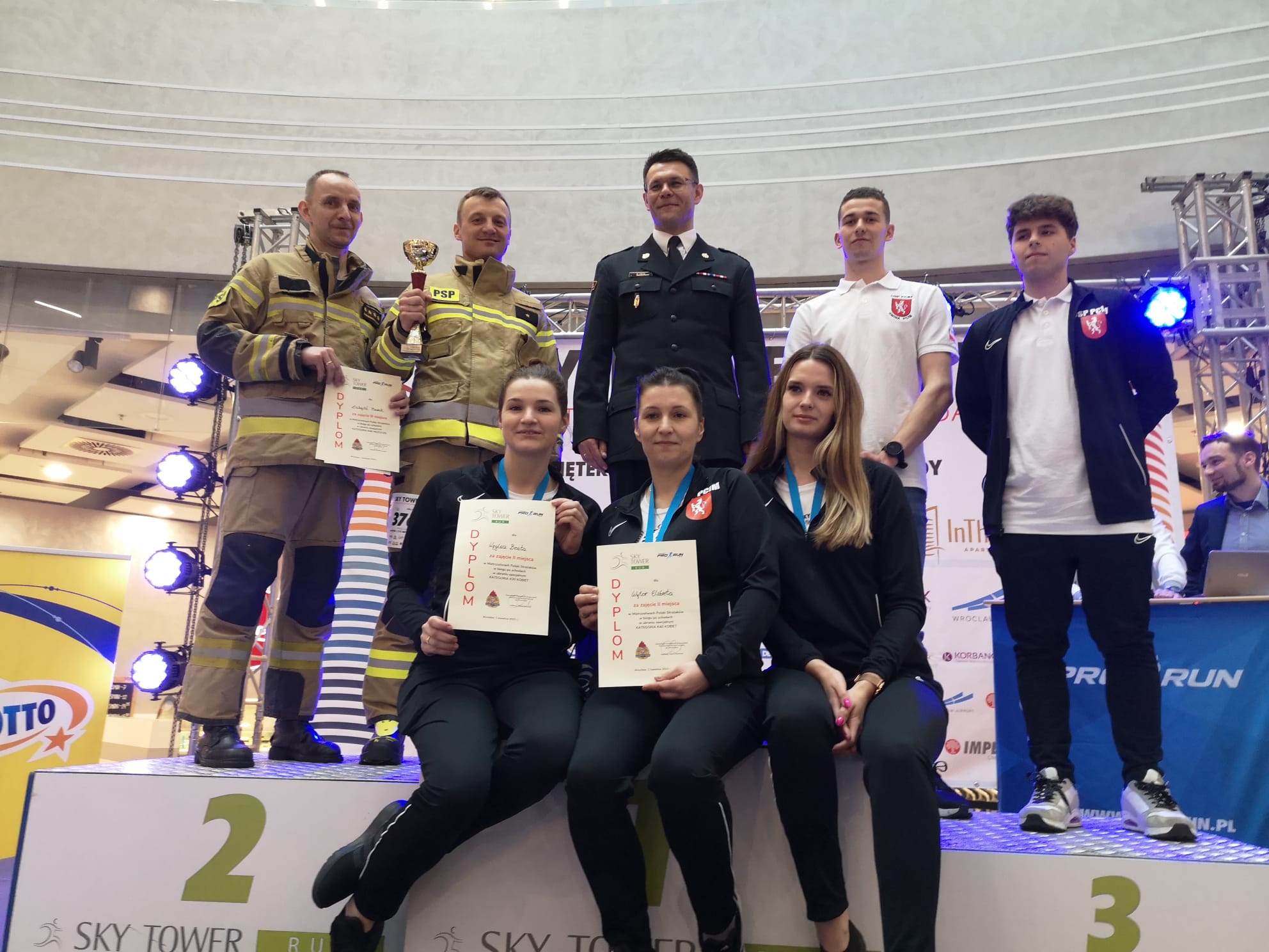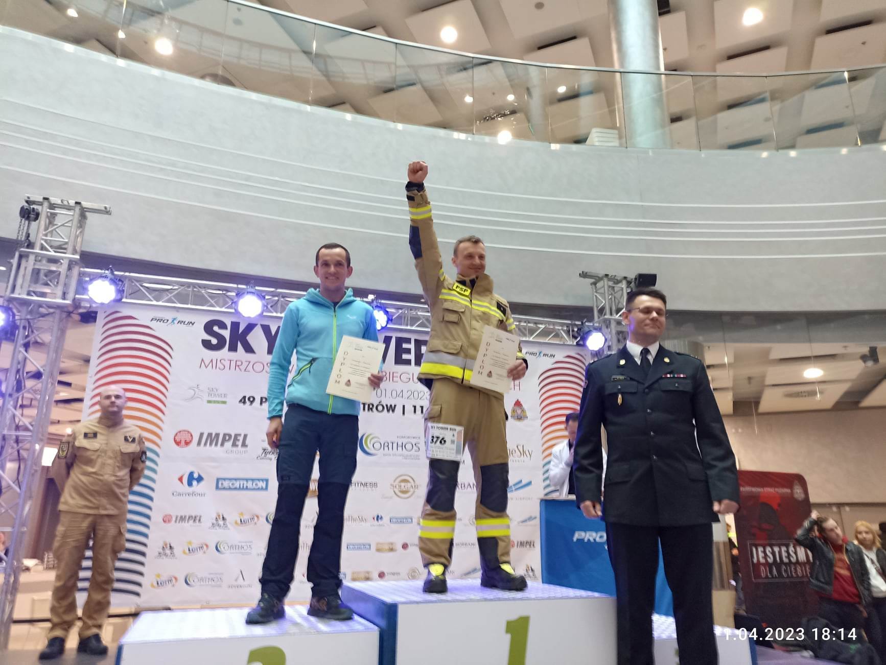 W sobotę 1 kwietnia 2023 r. funkcjonariusze tut. komendy (st. kpt. Marek Łabędź, mł. kpt. Szymon Jopek, asp. Mariusz Pustuła, mł. asp. Szymon Wiśniewski) wzięli udział z sukcesami w Sky Tower Run, czyli biegu na 49 piętro wrocławskiego wieżowca. Zawodnicy mieli do pokonania 49 pięter (1142 schody) w umundurowaniu specjalnym, butach specjalnych, rękawicach specjalnych, hełmie strażackim oraz aparacie powietrznym na plecach z podpiętym automatem oddechowym do maski.