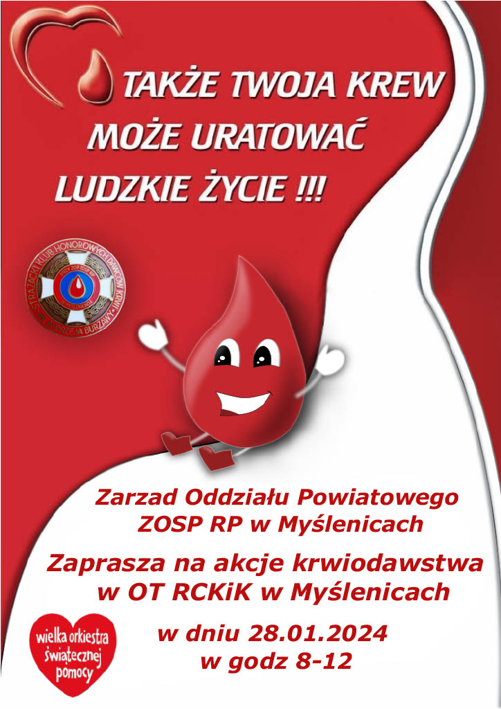 Zarząd Oddziału Powiatowego Związku Ochotniczych Straży Pożarnych Rzeczypospolitej Polskiej w Myślenicach zaprasza na akcję krwiodawstwa, która będzie towarzyszyła podczas tegorocznego 32 Finału Wielkiej Orkiestry Świątecznej Pomocy.