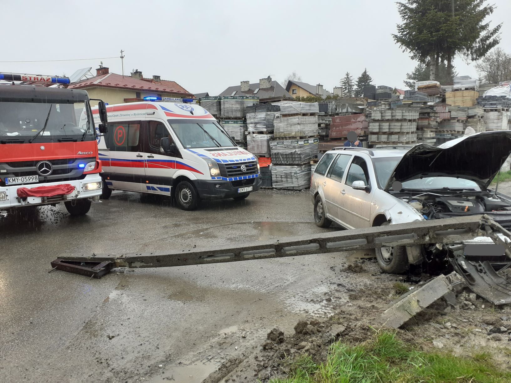 W dniu 22 kwietnia o godzinie 12.41 do SKKP PSP wpłynęło zgłoszenie o wypadku drogowym do jakiego doszło na ulicy Szpitalnej. Na miejscu zdarzenia stwierdzono samochód osobowy, który uderzył w betonowy słup energetyczny. W wyniku zderzenia poszkodowane zostały dwie osoby, którym pomocy udzielili ratownicy medyczni z ZRM. Zabezpieczono miejsce zdarzenia, a po wykonaniu dokumentacji przez funkcjonariuszy policji przystąpiono do przemieszczenia uszkodzonego słupa poza drogę, przeprowadzono sorbcję płynów eksploatacyjnych oraz usunięto pozostałe skutki wypadku z jezdni. ZRM zabrał z miejsca zdarzenia jedną osobę poszkodowaną na SOR w Myślenicach, druga po przeprowadzeniu diagnostyki nie wymagała hospitalizacji. Uszkodzony samochód został usunięty przez Pomoc drogową. Do działań przystąpili również pracownicy Pogotowia energetycznego zabezpieczając uszkodzoną linię NN. W akcji udział brały zastępy JRG Myślenice, OSP Myślenice Śródmieście.