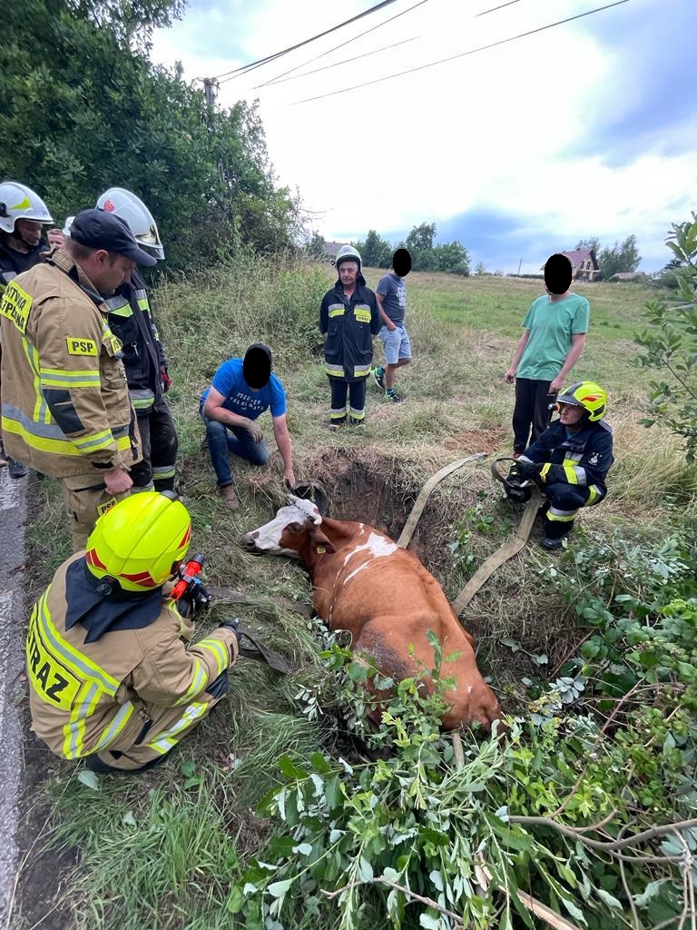 W dniu 07.07.2022 r o godzinie 18.45 do Stanowiska Kierowania Komendanta Powiatowego PSP w Myślenicach wpłynęło zgłoszenie o krowie uwięzionej w rowie melioracyjnym. Na miejsce zdarzenia dyżurny operacyjny zadysponował trzy zastępy straży pożarnej. Po przybyciu na miejsce zdarzenia i rozpoznaniu sytuacji stwierdzono, że krowa, która wpadła do głębokiego rowu melioracyjnego, nie mogła samodzielnie opuścić wykopu. Strażacy założyli krowie uprząż. Następnie zwierzę zostało wyciągnięte przy pomocy hydraulicznego dźwigu samochodowego. Po udanej akcji ratowniczej przeprowadzonej przez strażaków zwierzę wróciło w dobrej kondycji na łąkę.