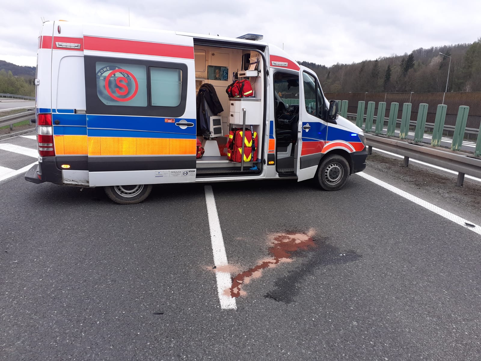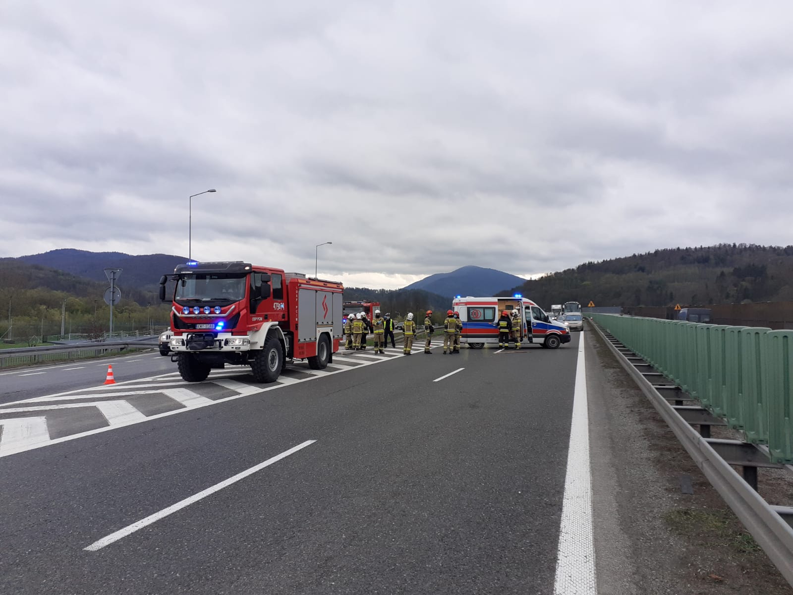 W drugim przypadku doszło na drodze ekspresowej S7 ok. godziny 16.00 do potrącenia mężczyzny przez samochód. Osoba poszkodowana została zaopatrzona przez ratowników ZRM. Na czas prowadzonych działań przejazd na drodze był zamknięty w kierunku Krakowa. Strażacy poddali sorpcji rozlane płyny eksploatacyjne z pojazdu oraz płyny ustrojowe. Osoba poszkodowana zabrana została przez ZRM do SOR w Myślenicach. W działaniach brały udział zastępy JRG Myślenice oraz na swoich rejonach działania OSP Pcim i OSP Głogoczów.