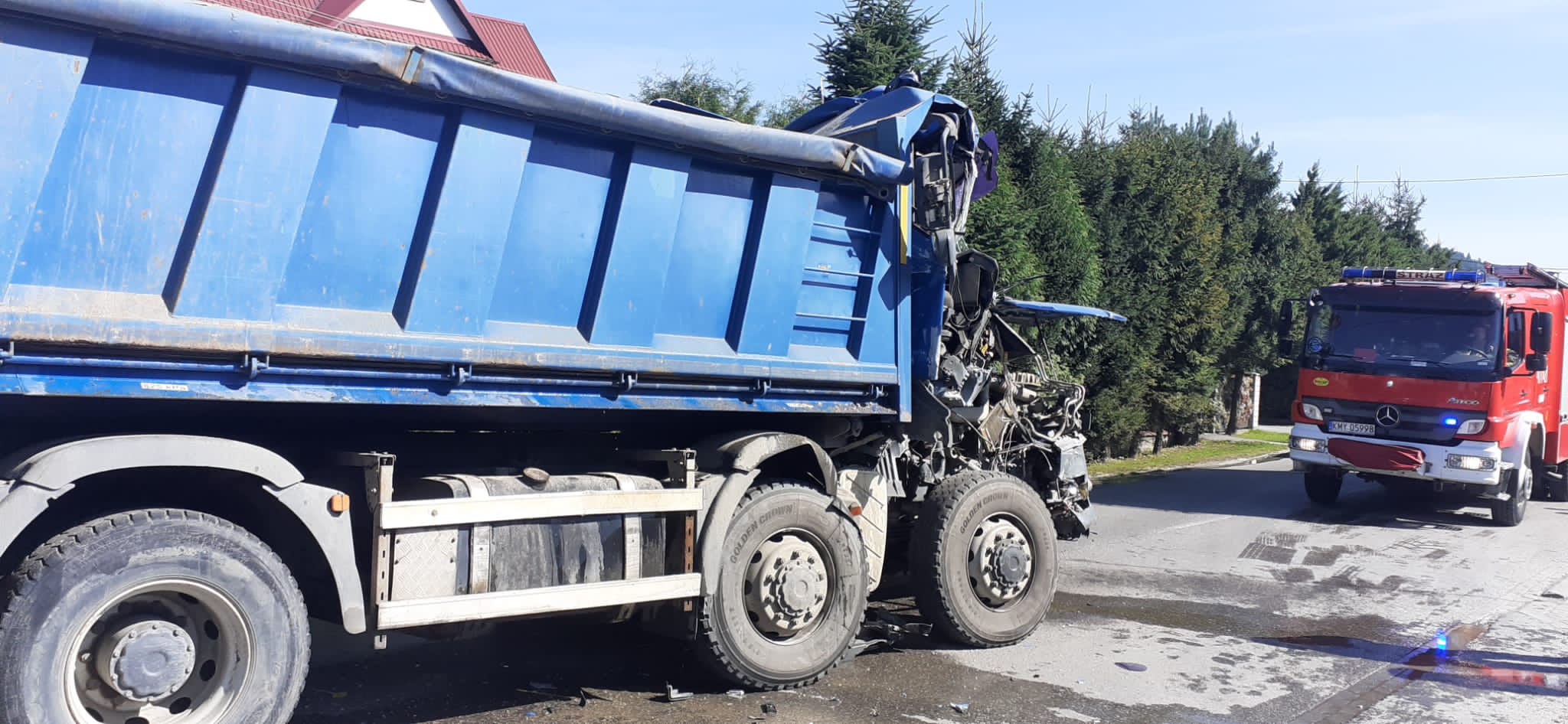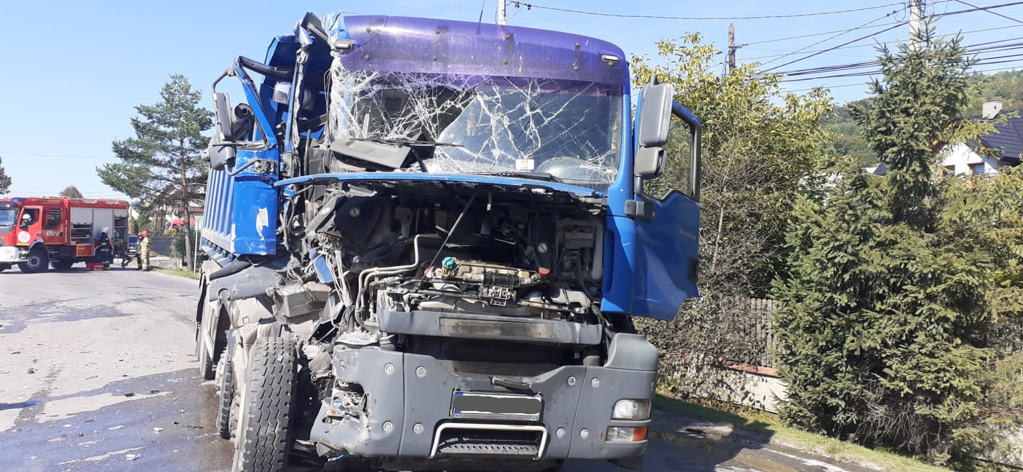 W sobotnie przedpołudnie 11 września na drodze powiatowej w miejscowości Krzczonów doszło do zderzenia dwóch samochodów ciężarowych oraz autobusu. Dyżurny operacyjny SKKP PSP w wyniku otrzymanej informacji zadysponował do działań zastępy ratowniczo-gaśnicze oraz ciężki samochód ratownictwa technicznego SCRt. Pierwsze przybyłe na miejsce akcji zastępy strażaków stwierdziły, iż droga jest zablokowana przez jeden samochód ciężarowy, drugi z uszkodzonych pojazdów – ciągnik siodłowy z naczepą jest przewrócony, a autobus znajduje się na poboczu jezdni. Przeprowadzone rozpoznanie nie potwierdziło osób poszkodowanych. Zabezpieczono miejsce zdarzenia, przeprowadzono sorpcję rozlanych płynów eksploatacyjnych, usunięto rozbite elementy pojazdów. Uszkodzony samochód ciężarowy blokujący przejazd przemieszczono na parking przy wykorzystaniu ciężkiego sprzętu tym samym umożliwiając przejazd mocno uczęszczaną drogą powiatową. W działaniach trwających 1,5 godziny udział brały zastępy JRG Myślenice, OSP Krzczonów.