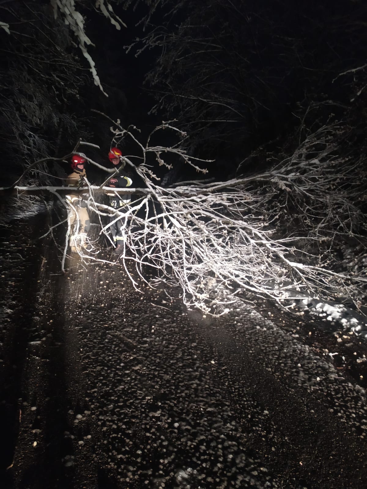 Zmiana warunków atmosferycznych i opady mokrego śniegu spowodowały liczne zgłoszenia dotyczące powalonych drzew, zerwanych linii energetycznych i telekomunikacyjnych. Od godzin wieczornych w dniu 13 kwietnia Dyżurny operacyjny Stanowiska Kierowania Komendanta Powiatowego PSP dysponował do działań zastępy JRG Myślenice oraz jednostki OSP z miejscowości w których doszło do zdarzeń. Kulminacja wyjazdów miała miejsce w godzinach nocnych 14 kwietnia, do godziny 8.30 odnotowano 40 zgłoszeń od mieszkańców na które reagowali strażacy. W związku z ciągłymi opadami ilość interwencji uległa zwiększeniu. Łącznie do dnia 15 kwietnia na terenie powiatu odnotowano 66 akcji związanych z usuwaniem drzew, linii energetycznych i telekomunikacyjnych.